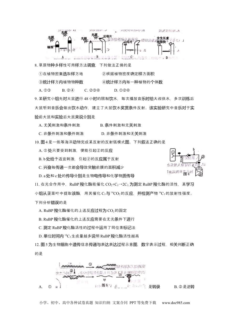 小学、初中、高中各种试卷真题知识归纳文案合同PPT等免费下载www.doc985.com嘉定区2018~2019学年度第二学期高中等级考模拟质量调研高三年级生命科学学科试卷2019.4考生注意:1.本试卷满分l00分,考试时间60分钟。2.本考试设试卷和答题纸两部分,试卷包括试题与答题要求;所有答题必须涂(选择题)或写(综合题)在答题纸上;做在试卷上一律不得分。3.答题前,考生务必在答题纸上用钢笔或圆珠笔清楚填写姓名、准考证号,并将核对后的条形码贴在指定位置上。4.答题纸与试卷在试题编号上是一一对应的,答题时应特别注意,不能错位。一、选择题(本题共40分,每小题2分,只有一个正确选项)1.下列化合物可能存在图1所示的是结构A.脂防B.素胰岛C.DNAD.肝糖原2.某生究小欲定某品牌基酸料中是否含有蛋白,可用的是学研组测氮饮质选试剂A.班氏试剂B.丹苏III染液C.双缩脲试剂D.液碘3.胞膜红细内K度是膜外的浓30倍,膜外Na度是膜的浓内6倍,特维K、Na分布不均的是膜上的A.受体B.体蛋白载C.磷脂D.糖蛋白4.ATP的式可用结构图2表示,其中高能磷酸的部位是键A.①仅处B.③仅处C.①和②处D.②和③处5.图3人体葡萄糖化分解的某一途,其中程②行的所位于为内氧径过进场A.胞基细质质B.粒体膜线内C.粒体基线质D.粒体外膜线6.下列措施于切乙型肝炎播途的是属断传径A.隔离病人B.消毒餐具C.身体锻炼D.接疫苗种7.用不同材料分燕的胚芽鞘行以下如究,中所示前后胚芽鞘实验别对麦进图研实验图实验的生情,正确的是长况小学、初中、高中各种试卷真题知识归纳文案合同PPT等免费下载www.doc985.com8.草原物多性可用方法,下列做法正俑的是种样样调查①在植物密集取方地②根据植物密度确定方面选样样积③方植物物统计样内种数④方每一植物的体统计样内种个数A.B.①③②④C.D.②③④①②④9.某究小先大鼠行研组对进48小的限制水,每次播放音大叔供水,多次后时饮乐时给训练大鼠听到音做出水作,建立了大鼠水件反射。究中音于乐会饮动饮奖赏条该实验研乐对实前大鼠和后大鼠分是验实验来说别A.无刺激和件刺激关条B.件刺激和无刺激条关C.非件刺激和件刺激条条D.非件刺激和无刺激条关10.图4是一低等海洋物完成某反射的反射弧模式。下列述正确的是动图叙A.①只要受到刺激,便能引起②的反处应B.b予适宜刺激,引起②的反于反射处给应属C.每一次都致突前膜的面少兴奋传递会导触积减D.a和处c的分是生物和化物处传导别电传导学质传导11.在光合作用中,RuBP化酶能催化羧CO2+C5→2C3.定为测RuBP化酶的活性,某羧学习小菠菜叶中提取酶,用其催化组从该C5与14CO2的反,物应并检测产14C3的放射性强度。下列分析的是错误A.RuBP化酶催化的上述反程羧应过为CO2的固定B.RuBP化酶催化的上述反需要在无光件下行羧应条进C.定测RuBP化酶活性的程中用了同位素法羧过运标记D.位単时间内14C3生成量越多明说RuBP化酶活性越高羧12.图5生物胞中信息表表程示意,字表示程,相判正确为细遗传传递与达达过图数过关断的是A.①是转录B.②是逆转小学、初中、高中各种试卷真题知识归纳文案合同PPT等免费下载www.doc985.com录C.③是翻译D.甲是肽链13.蟒蛇外形上有四肢,但的体保留着后肢骨的余,明蟒蛇是起源于有四肢的没它内还残说物。于生物化的动这属进A.胚胎据学证B.比解剖据较学证C.生物化据学证D.古生物化石据证14.图6某二倍体物(为动2n=8)一正在行分裂的胞,胞个进细则该细A.含8染色体条单B.次精母胞为级细C.含4染色体組个D.于第二次分裂处减数15.在“察蚕豆叶下表皮”中,低倍野下到保胞位于野右下角,欲在高观实验镜视观测卫细视倍野下一步晰察胞,下列操作程中的是镜视进清观该细过错误A.移玻片动载B.低倍换为镜C.高倍换为镜D.器调节细调节16.猫叫合征患者的综5染色体成和正常人体的号组5染色体成如号组图7,据图7判猫断叫台征的型是综变异类A.基因突变B.基因重组C.染色体易位D.染色体片段缺失17.图8健康人餐后血糖化曲,中为变线图a点体的激素分泌是时内状况A.素和高血糖素分泌均少胰岛胰减,B.素和高血糖素分泌均增加胰岛胰C.素分泌少,高血糖素分泌增加胰岛减胰D.素分泌增加,高血糖素分泌少胰岛胰减18.图9示人体某胞及生在其中的部分...