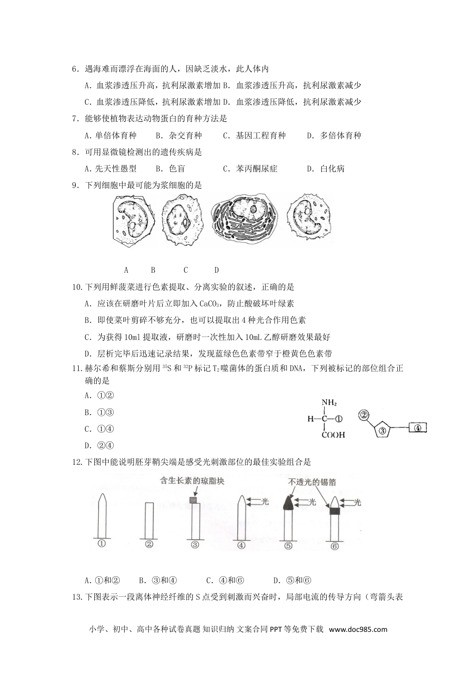 松江区2016~2017学年度第二学期高中等级考模拟质量调研高三年级生命科学学科试卷2017.4考生注意:1.本试卷满分l00分,考试时间60分钟。2.本考试设试卷和答题纸两部分,试卷包括试题与答题要求;所有答题必须涂(选择题)或写(综合题)在答题纸上;做在试卷上一律不得分。3.答题前,考生务必在答题纸上用钢笔或圆珠笔清楚填写姓名、准考证号,并将核对后的条形码贴在指定位置上。4.答题纸与试卷在试题编号上是一一对应的,答题时应特别注意,不能错位。一、选择题(共40分,每小题2分。每小题只有一个正确答案)1.下列化合物中所含化学元素的种类最少的是A.生长激素B.纤维素C.叶绿素D.ATP2.在紫色洋葱鳞叶外表皮细胞的失水和吸水试验中,显微镜下可依次观察到甲、乙、丙三种细胞状态。下列叙述正确的是A.由观察甲到观察乙须将5倍目镜更换为10倍目镜B.甲、乙、丙可在同一个细胞内依次发生C.与甲相比,乙所示细胞的细胞液浓度较低D.由乙转变为丙的过程中,没有水分子从胞内扩散到胞外3.恒温动物之所以能够维持体温的相对恒定,其原因是A.机体产热大于散热B.机体产热小于散热C.机体产热和散热过程保持动态平衡D.体内物质代谢速率比变温动物快4.右图是某细胞的部分结构示意图,有关叙述错误的是A.结构①是核糖体,是细胞内蛋白质合成的场所B.结构②是线粒体,是真核细胞有氧呼吸的主要场所C.结构③是高尔基体,能增大细胞内的膜面积D.结构④是叶绿体,是绿色植物细胞光合作用的场所5.下列肯定不是人体内环境成分的是A.神经递质B.尿素C.抗体D.血红蛋白小学、初中、高中各种试卷真题知识归纳文案合同PPT等免费下载www.doc985.com6.遇海难而漂浮在海面的人,因缺乏淡水,此人体内A.血浆渗透压升高,抗利尿激素增加B.血浆渗透压升高,抗利尿激素减少C.血浆渗透压降低,抗利尿激素增加D.血浆渗透压降低,抗利尿激素减少7.能够使植物表达动物蛋白的育种方法是A.单倍体育种B.杂交育种C.基因工程育种D.多倍体育种8.可用显微镜检测出的遗传疾病是A.先天性愚型B.色盲C.苯丙酮尿症D.白化病9.下列细胞中最可能为浆细胞的是ABCD10.下列用鲜菠菜进行色素提取、分离实验的叙述,正确的是A.应该在研磨叶片后立即加入CaCO3,防止酸破坏叶绿素B.即使菜叶剪碎不够充分,也可以提取出4种光合作用色素C.为获得10ml提取液,研磨时一次性加入10mL乙醇研磨效果最好D.层析完毕后迅速记录结果,发现蓝绿色色素带窄于橙黄色色素带11.赫尔希和蔡斯分别用35S和32P标记T2噬菌体的蛋白质和DNA,下列被标记的部位组合正确的是A.①②B.①③C.①④D.②④12.下图中能说明胚芽鞘尖端是感受光刺激部位的最佳实验组合是A.①和②B.③和④C.④和⑥D.⑤和⑥13.下图表示一段离体神经纤维的S点受到刺激而兴奋时,局部电流的传导方向(弯箭头表小学、初中、高中各种试卷真题知识归纳文案合同PPT等免费下载www.doc985.com示膜内、外局部电流的流动方向)。其中正确的是14.基因型为的一个果蝇精原细胞进行减数分裂时,产生了一个基因型为aB的精细胞,那么同时产生的其它精细胞的基因型可能是A.只有aBB.只有AbC.同时有aB和AbD.同时有aB、Ab或同时有Ab、AB、ab15.下图能正确表示基因分离定律实质的是16.下列实验或操作中,采用的技术手段相似的一组是①证明光合作用过程中释放的氧气来自水②单克隆抗体的制备③鉴定乳制品和饮水中是否含有大肠杆菌④证明DNA复制的方式为半保留复制A.①④B.②④C.①②D.②③17.右图为某二倍体生物细胞分裂某一时期示意图,据图判断A.该时期有6条染色体,6个DNA分子B.该时期可能为有丝分裂前期细胞图像C.该时期已完成减数第一次分裂D.该图可能为精细胞或卵细胞示意图18.某原核生物因一个碱基对突变而导致所编码蛋白质的一个脯氨酸(密码子有CCU、CCC、CCA、CCG)转变为组氨酸(密码子有CAU、CAC)。基因中发生改变的是小学、初中、高中各种试卷真题知识归纳文案合同PPT等免费下载www.doc985.comA.G≡C变为T=AB.A=T变为C≡GC.鸟嘌呤变为胸腺嘧啶D.胞嘧啶变为腺嘌呤19.某兴趣小组在室温下进行了酵母菌无氧呼吸的探究实验(如右图)。下...