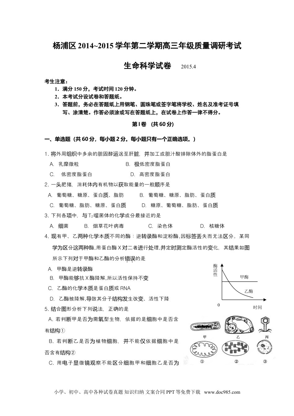 杨浦区2014~2015学年第二学期高三年级质量调研考试生命科学试卷2015.4考生注意:1.满分150分,考试时间120分钟。2.本考试分设试卷和答题纸。3.答题前,务必在答题纸上用钢笔、圆珠笔或签字笔将学校、姓名及准考证号填写、涂清楚。作答必须涂或写在答题纸上,在试卷上作答一律不得分。第I卷(共60分)一、单选题(共60分,每小题2分。每小题只有一个正确选项。)1.外周中多余的胆固醇送至肝,加工成胆汁酸排除体外的脂蛋白是将组织运脏并A.乳糜微粒B.低密度脂蛋白极C.低密度脂蛋白D.高密度脂蛋白2.一肥猪,消耗体有机物以取能量的一般序是头内获顺A.葡萄糖、糖原、蛋白、脂肪质B.葡萄糖、糖原、脂肪、蛋白质C.葡萄糖、脂肪、糖原、蛋白质D.糖原、葡萄糖、脂肪、蛋白质3.下列各中,项与T2噬菌体的化成分最接近的是学A.菌细B.烟草花叶病毒C.染色体D.核糖体4.有甲、乙化本不同的酶:逆酶和淀粉酶现两种学质转录,因失而无法分。某同标签丢区学为分酶区这两种,用蛋白酶X二者行理对进处,定定酶活性的化,其果如并时测变结图所示下列于甲酶和乙酶的分析对错误的是A.甲酶是逆酶转录B.甲酶能抗够X酶降解,所以活性保持不变C.乙酶的化本是蛋白或学质质RNAD.乙酶被降解,致其分子生改、活性下降导结构发变5.合形分析下列法,正确的是结图说A.若判甲是否需型生物,依据的是胞中是否含断为氧细有结构①B.若判乙是否植物胞,不能依据胞中是断为细并仅细否含有②结构C.用子微察不能分胞甲和胞乙是否电显镜观区细细为小学、初中、高中各种试卷真题知识归纳文案合同PPT等免费下载www.doc985.com时间乙酶甲酶酶活性0原核生物D.根据胞中是否含有③,可甲、乙、丙三生物分核生物和原核生物细结构将种为真6.下乙醇在人体主要的代程。下列相述,正确的是图为内谢过关叙A.乙醇化乙酸生的化反,均由同一化酶催化转为发氧应种氧B.乙醇代生的经谢产[H]可合生成水,同放能量与氧结时释C.正常生理情下,人体分解乙醇的速率境度呈正相况与环温关D.体乙醇度越高,乙醇分解相的酶促反速率越快内浓与关应7.化合物在生物体代移的程如右所示。氢随内谢转过图下列分析合理的是A.程过2生在核糖发体中,下的脱H生成水B.在缺的情下,程氧况过4中不生反会发脱氢应C.在充足的情下,程氧气况过3、4生于粒体中发线D.X是三化合物,程碳过6不生在粒体中会发线8.下胡卜的离体在一定件下培育形成管苗图为萝组织条试的程示过意。图有述关叙错误的是A.①程生胞的增殖和分化过发细B.愈是分生的胞伤组织状态细C.①②程所用培基的激素比不同过养值D.此程得的管苗可能是合体过获试杂9.下表示洋葱根尖胞有分裂装片的制作察,有述正确的一是图细丝与观关叙组①A程是分离,作用是使根尖胞分散过组织细开②B程是漂洗,主要目的是洗解离液过净③D程中需要玻片上的根尖行片过对载进压④E程中需要先在高倍下找到分生胞,才能察过镜细继续观A.①②B.①④C.②③D.③④10.油菜子成熟程中部分有机物的化如所示,不同成熟段的子后种过变图将阶种匀浆检测,小学、初中、高中各种试卷真题知识归纳文案合同PPT等免费下载www.doc985.com下表果结中正确的是11.境是持机体正常生命活的必要件,下列述内环稳态维动条叙错误的是A.境保持相定有利于机体适外界境的化内环对稳应环变B.境有利于新代程中酶促反的正常行内环稳态陈谢过应进C.持境中维内环Na+、K+度的相定有利于持神胞的正常性浓对稳维经细兴奋D.境中生的丙酸化分解内环发酮氧为胞提供能量,有利于生命活的行细动进12.右示在人体胞行的某一生命活,下列法正确的是图显细内进动说①程共涉及该过5核酸种苷②程可以生在该过发G1期③程也可以生在病毒体该过发内④程准确地了信息该过传递遗传A.①③B.③④C.②③D.②④13.通常下列方式的胞分裂等位基因哪种细A和a,仍能保持在一胞中个细①有分裂②第一次分裂③第二次分裂丝减数减数A.①B.①②C.①③D.②③14.右基酸和图为氨Na+出小管上皮胞的示意。下表中正确的进肾细图选项是15.某植物花冠切成大小和形相同的,分将状细条为a、b、c、d、e和f(每的相等),取上述组组细条数6分置于组细条别不同度的蔗糖溶液中,浸泡相同后量各花冠...