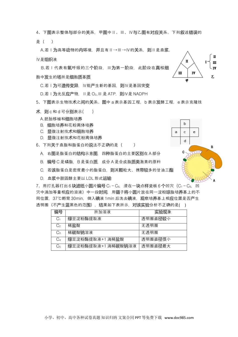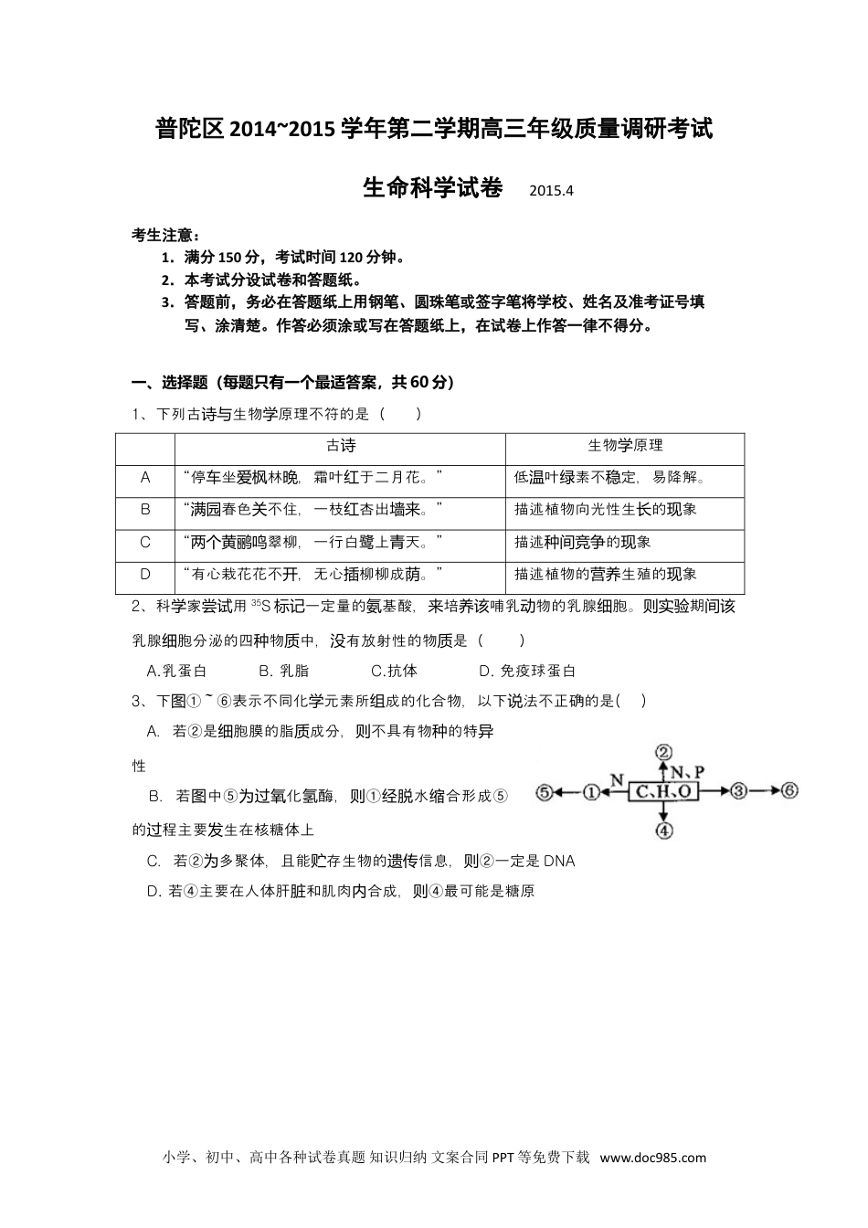 普陀区2014~2015学年第二学期高三年级质量调研考试生命科学试卷2015.4考生注意:1.满分150分,考试时间120分钟。2.本考试分设试卷和答题纸。3.答题前,务必在答题纸上用钢笔、圆珠笔或签字笔将学校、姓名及准考证号填写、涂清楚。作答必须涂或写在答题纸上,在试卷上作答一律不得分。一、选择题(每题只有一个最适答案,共60分)1、下列古生物原理不符的是诗与学()古诗生物学原理A“停车坐林,霜叶于二月花爱枫晚红。”低叶素温绿不定,易降解。稳B“春色不住,一枝杏出。”满园关红墙来描述植物向光性生长的象现C“翠柳,一行白上天。”两个黄鹂鸣鹭青描述的象种间竞争现D“有心栽花花不,无心柳柳成开插荫。”描述植物的生殖的营养象现2、科家用学尝试35S一定量的基酸,培哺乳物的乳腺胞。期标记氨来养该动细则实验间该乳腺胞分泌的四物中,有放射性的物是()细种质没质A.乳蛋白B.乳脂C.抗体D.免疫球蛋白3、下①~⑥表示不同化元素所成的化合物,以下法不正确的是图学组说()A.若②是胞膜的脂成分,不具有物的特细质则种异性B.若中⑤化酶,①水合形成⑤图为过氧氢则经脱缩的程主要生在核糖体上过发C.若②多聚体,且能存生物的信息,为贮遗传则②一定是DNAD.若④主要在人体肝和肌肉合成,④最可能是糖原脏内则小学、初中、高中各种试卷真题知识归纳文案合同PPT等免费下载www.doc985.com4、下表示整体部分的系,甲中Ⅱ、Ⅲ、Ⅳ乙有系。下列述的图与关图与图对应关叙错误是()A.若Ⅰ高等物的境,且有Ⅱ→Ⅲ→Ⅳ的系,Ⅱ是血为动内环并关则浆,Ⅳ是液组织B.若Ⅰ代表有呼吸的三段,Ⅲ第一段,此段在核氧个阶为阶阶真细胞中生的所是胞基发场细质质C.若Ⅰ可,Ⅳ能生新的基因,Ⅳ是基因突为遗传变异产则变D.若Ⅰ光反物,Ⅱ是为应产O2,Ⅲ是ATP,Ⅳ是则NADPH5、下表示生物技之的系。中图术间关图a表示基因工程,b表示酵工程,发e表示克隆技,术则c和d可分表示别()A.胚胎移植和胞培细养B.胞培和花粉离体培细养养C.微注射技和胞培显术细养D.微注射技和花粉离体培显术养6、下列于血脂和脂蛋白的法不正确的是()关说A.右是脂蛋白的示意,四脂蛋白的主要在图结构图种区别A部分B.编号C是磷脂,B是蛋白,成分质A是合成脂激素的原料质类C.若脂蛋白是密度最小的脂蛋白,其粒大、携多的甘油三该则颗带较酯D.血中胆固醇主要以浆LDL形式运输7、用打孔器打出6小片块滤纸圆编号C1-C6,浸在一点瓷板块样6凹穴(个C1-C6,凹穴中滴加等量相的溶液)中一段,用子小片放在同一淀粉脂培基上的不应时间镊将圆琼养同位置,37℃孵育30min,倒入液碘1min后洗去液,察培基上相位置是否生碘观养应产透明圈(不生黑色的范),果如下表所示,分析不正确的是产蓝围结对该实验()编号所加溶液象实验现C1豆淀粉酶提取液绿透明圈直小径较C2稀酸盐无透明圈C3稀酸溶液碳钠无透明圈C4豆淀粉酶提取液绿+1滴稀酸盐透明圈直很小径C5豆淀粉酶提取液绿+1滴稀酸溶液碳钠透明圈直最大径小学、初中、高中各种试卷真题知识归纳文案合同PPT等免费下载www.doc985.comC6蒸水馏无透明圈A.的目的是探究该实验PH豆淀粉酶活性的影对绿响B.C4、C5,为实验组C1和C2、C3、C6均照为对组C.明豆淀粉酶在弱性境中活性高该实验说绿碱环较D.若在C4凹穴中再滴加2滴稀酸溶液后重,果碳钠复该实验实验结与C5相同8、下图为叶体色素的吸收光。绿谱如果密大棚的光照由将闭内550nm波的光长转为670nm波后,其他件不,叶体囊体长条变绿类腔内的[H]和叶体绿基三化合物的质内碳含量将会生的化是()发变A.增加增加B.增加少减C.少增加减D.少少减减9、如右是水生植物黑藻在光照等境因素影下光合图环响速率化的示意.下列有述,正确的是()变图关叙A.t1→t2,光照增强,叶体囊体膜上的色素吸收光绿类能增加,叶体基中水光解加快、绿质O2放增多释B.t4后,叶体中绿ADP和Pi含量逐渐升高,C3化合物原后的还直接物含量产逐渐降低C.t3→t4,光照强度不,光合速率的提高是由于光反速率不、暗反增强的果变应变应结D.t2→t3,暗反(反)限制光合作用应碳应,若在t2刻增加光照,光合速率再提高时将10、有甲乙等量的酵母菌,甲酵母菌行有呼吸,乙酵母...