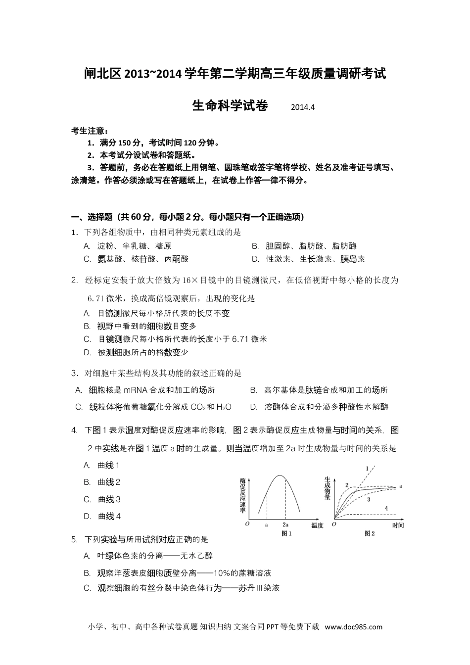 闸北区2013~2014学年第二学期高三年级质量调研考试生命科学试卷2014.4考生注意:1.满分150分,考试时间120分钟。2.本考试分设试卷和答题纸。3.答题前,务必在答题纸上用钢笔、圆珠笔或签字笔将学校、姓名及准考证号填写、涂清楚。作答必须涂或写在答题纸上,在试卷上作答一律不得分。一、选择题(共60分,每小题2分。每小题只有一个正确选项)1.下列各组物质中,由相同种类元素组成的是A.淀粉、半乳糖、糖原B.胆固醇、脂肪酸、脂肪酶C.基酸、核酸、丙酸氨苷酮D.性激素、生激素、素长胰岛2.经标定安装于放大倍数为16×目镜中的目镜测微尺,在低倍视野中每小格的长度为6.71微米,换成高倍镜观察后,出现的变化是A.目微尺每小格所代表的度不镜测长变B.野中看到的胞目多视细数变C.目微尺每小格所代表的度小于镜测长6.71微米D.被胞所占的格少测细数变3.对细胞中某些结构及其功能的叙述正确的是A.胞核是细mRNA合成和加工的所场B.高尔基体是合成和加工的所肽链场C.粒体葡萄糖化分解成线将氧CO2和H2OD.溶酶体合成和分泌多酸性水解酶种4.下图1表示度酶促反速率的影,温对应响图2表示酶促反生成物量的系,应与时间关图2中实线是在图1度温a的生成量。时度增加则当温至2a时生成物量与时间的关系是A.曲线1B.曲线2C.曲线3D.曲线45.下列所用正确的是实验与试剂对应A.叶体色素的分离——无水乙醇绿B.察洋葱表皮胞壁分离——观细质10%的蔗糖溶液C.察胞的有分裂中染色体行——丹Ⅲ染液观细丝为苏小学、初中、高中各种试卷真题知识归纳文案合同PPT等免费下载www.doc985.comD.探究酵母菌的呼吸方式——BTB(代麝香草)溶液溴酚蓝6.右图是水生植物黑藻在光照等环境因素影响下光合速率变化的示意图。下列有关叙述正确的是A.t1→t2,叶体囊体膜上的色素吸收光能增加基绿类质中水光解加快、O2放增多释B.t2→t3,暗反(反)限制光合作用。若在应碳应t2时刻增加光照,光合速率再提高将C.t3→t4,光照强度不,光合速率的提高是由于光反变速率不、暗反增强的果应变应结D.t4后短,叶体中暂时间内绿ADP和Pi含量升高,C3化合物原后的直接物含量降低还产7.右是人体糖代等程的,据分析图内谢过简图图的错误是8.右表示三神元及其图个经联系。其中“—○—<”表示一神元的个经树突到胞体再到轴突及末梢,则下列叙述正确的是A.大皮脑层对中反射图活不生影动会产响B.A和C可感受器相,中共有与连图3完整的突个触C.若在f点施加一强刺激,则f点的膜位外正,在电变为内负并b点可到位化测电变D.若在e点施加一强刺激,则f点不到位化,而下一神元的加强会测电变经兴奋将会9.如果一个健康人受到惊吓后动脉血压收缩压超过了140mmHg,一段时间内可以通过下图所示的调节过程恢复正常。图中的②应该是A.交感神经B.副交感神经C.感神觉经D.入神传经10.人的肌肉分快肌和慢肌,快肌几乎不含有粒体,短等组织为纤维纤维两种纤维线与跑烈有;慢肌慢等有有。下列述剧运动关纤维与跑氧运动关叙的错误是小学、初中、高中各种试卷真题知识归纳文案合同PPT等免费下载www.doc985.comA.如果示的胞是肝胞,中图组织细细则图A所示的物最可能是肝糖元质B.如果示的胞是肌胞,胞不具图组织细细则该细备细胞周期C.示中的③、④程使胞中图过会细ADP的含量上升D.如果人体甲腺激素度高,中②的内状浓过则图过程加快将主动脉和颈动脉壁上压力感受器——→心血管中枢——→心脏、血管②A.慢慢肌生的跑时纤维产ATP,主要自于粒体膜来线内B.短快肌无呼吸生大量乳酸,故生酸痛感跑时纤维氧产产觉C.肌均可在胞基中生丙酸、两种纤维细质质产酮[H]和ATPD.消耗等摩尔葡萄糖,快肌比慢肌生的纤维纤维产ATP多11.下是尔文利用燕胚芽鞘所做的,究的目的是探究图达麦实验该实验研A.胚芽鞘尖端光是否敏感,照光后是否引起胚芽鞘向光曲对线会弯B.胚芽鞘背光的一促生的物含量是否多侧进长质较C.胚芽鞘是否表向光性,取于尖端存在现决D.生素是否受到强光的破坏长会12.下列关于病毒的叙述,正确的是A.流感病毒的核酸位于衣外面的囊膜上壳B.烟草花叶病毒可以不依宿主胞而增殖赖细C.道病毒可在高菌的培基上生增殖肠...