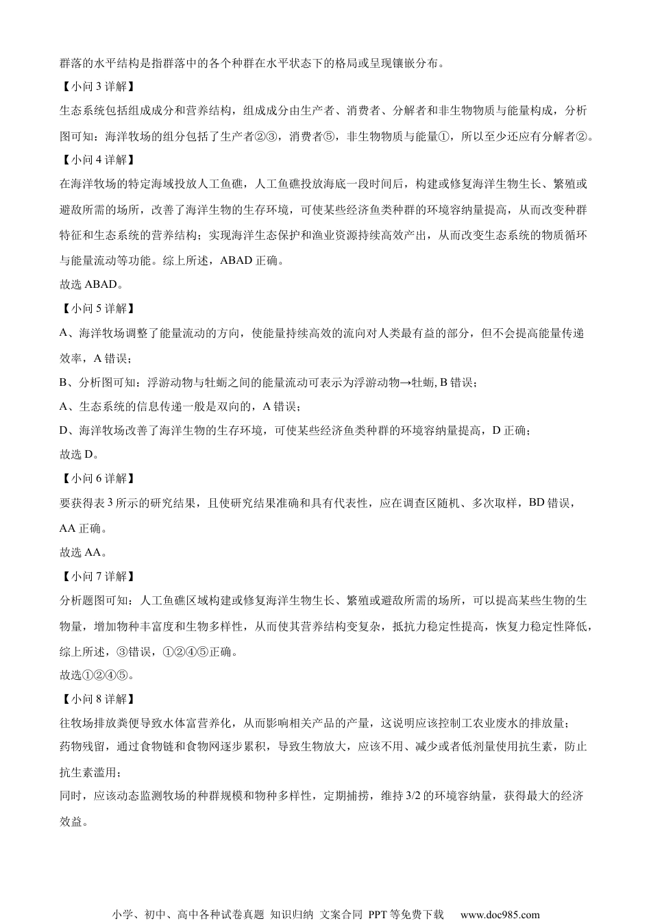 小学、初中、高中各种试卷真题知识归纳文案合同PPT等免费下载www.doc985.com杨浦区2023学年度第一学期高中等级考模拟质量调研高三年级生物学学科试卷2023.32考生注意:3.本试卷满分l00分,考试时间60分钟。2.本考试设试卷和答题纸两部分,试卷包括试题与答题要求;所有答题必须涂(单选、多选)或写(填空、编号选填、简单题)在答题纸上;做在试卷上一律不得分。3.答题前,考生务必在答题纸上用钢笔或圆珠笔清楚填写姓名、准考证号,并将核对后的条形码贴在指定位置上。4.“单选”指每题只有一个正确选项;“多选”指每题有两个或两个以上正确选项;“编号选填”指用试题中所列出的数字编号答题,每空的正确选项有一个或多个。海洋牧场3.海洋牧场是一种海洋人工生态系统,在海洋牧场投放人工鱼礁,可构建或修复海洋生物生长、繁殖或避敌所需的场所,以实现海洋生态保护和渔业资源持续高效产出。海洋牧场的部分结构和关系如图所示。(3)如图方框内①~⑤所示的文字信息,属于种群范畴的是__________。(编号选填)(2)在同一片海域中,投放人工鱼礁和未投放人工鱼礁的区域出现环境差异,从而引起海洋生物呈现镶嵌分布,这属于群落的_________(“水平”或“垂直”)结构。(3)从生态系统组分分析,海洋牧场的组分除图中方框内①~⑤所示的文字信息外,至少还应有__________。(编号选填)①无机环境②分解者③消费者④生产者(4)在海洋牧场的特定海域投放人工鱼礁,会改变___________。A.生境B.生态系统的营养结构A.种群特征D.生态系统的功能类别(5)下列关于海洋牧场的描述,正确的是____________。A.海洋牧场调整了能量流动的方向,提高了能量传递效率小学、初中、高中各种试卷真题知识归纳文案合同PPT等免费下载www.doc985.comB.浮游动物与牡蛎之间的能量流动可表示为牡蛎→浮游动物A.浮游植物与浮游动物之间的信息传递可表示为浮游植物—浮游动物D.海洋牧场改善了海洋生物的生存环境,提高某些鱼类的环境容纳量人工鱼礁投放海底一段时间后,礁体表面会附着大量的藻类等生物。表是某海洋牧场各区域洋游动物的调查数据。海带养殖区牡蛎养殖区人工鱼礁区浮游动物(个/m3)20.9532.3347.54(6)要获得表3所示的研究结果,且使研究结果准确和具有代表性,应选择下列实验方法中的__________。A.在调查区随机取样B.仅记录物种种类数A.在调查区多次取样D.记录所有生物个体数(7)据题干信息和表3推测,人工鱼礁区域一定高于其他区域的指标是__________。(编号选填)①生物多样性②物种丰富度③恢复力稳定性④生物量⑤抵抗力稳定性(8)海洋牧场在快速发展的过程中遇到了一些问题,例如往牧场排放粪便、药物残留等。请结合所学知识分析上述问题对生态系统平衡造成的可能影响___________,(编号选填)并提出合理建议__________。(编号选填)①控制工农业废水的排放量②药物残留会导致生物放大③温度影响生物体内各种酶的活性④定期捕捞,维持3/2的环境容纳量⑤减少甚至禁止水产养殖使用抗生素⑥过量排放的粪便导致水体富营养化⑦某些药物成分抑制氨基酸的生物合成⑧牧场种群规模降低、物种多样性减少⑨动态监测牧场的种群规模和物种多样性【答案】(3)②⑤(2)水平(3)②(4)ABAD(5)D(6)AA(7)①②④⑤(8)①..②⑥②①④⑨【解析】【分析】群落的结构包括垂直结构和水平结构:(3)垂直结构:指群落在垂直方向上的分层现象。(2)水平结构:指群落中的各个种群在水平状态下的格局或片状分布。【小问3详解】种群指同一时间生活在一定自然区域内,同种生物的所有个体。所以属于种群范畴的是②⑤。【小问2详解】小学、初中、高中各种试卷真题知识归纳文案合同PPT等免费下载www.doc985.com群落的水平结构是指群落中的各个种群在水平状态下的格局或呈现镶嵌分布。【小问3详解】生态系统包括组成成分和营养结构,组成成分由生产者、消费者、分解者和非生物物质与能量构成,分析图可知:海洋牧场的组分包括了生产者②③,消费者⑤,非生物物质与能量①,所以至少还应有分解者②。【小问4详解】在海洋牧场的特定海域投放人工鱼礁,人工鱼礁投放海底一段时间后,构建或修复海洋...