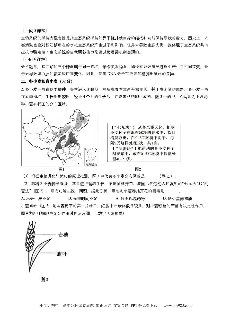 小学、初中、高中各种试卷真题知识归纳文案合同PPT等免费下载www.doc985.com松江区2023~2024学年第一学期高三年级质量调研生物试卷(等级考)答案解析版一、松江鲈(36分)3.I.松江(鲈TraAhidermusfasAiatus)近名,但非于松江。史上物半的江流远闻并仅产历该种从辽东岛鸭绿域到台海一分布。至湾峡带连续2000年,松江已退成宁江流域、山河流域和江口鲈缩辽鸭绿东青龙长-杭州流域三隔离的地方群,。湾个种濒临灭绝(3)图3松江群量特征模型,中为鲈种数图I、V、VI分代表别______。A、出生率、性比例、年别龄结构B、出生率、年、性比例龄结构别A、入率、性比例、年迁别龄结构D、入率、年、性比例迁龄结构别(2)旦大多年,成功攻克松江人工殖,在其史分布域放流,行重新引入复学团队历时鲈养难题并历区进。保生物多性的角度看,于从护样这属_______。A、保栖息地护B、保物护种A、就地保护D、地保迁护II.图2所示放流的松江在野外生存所的一食物。为鲈时处个网(3)对图2所示食物的分析,正确的是网______。A、中共有图6食物条链B、中所有生物成了一生系图构个态统A、松江和虎存在捕食和系鲈虾鱼竞争关D、使松江体累水体染物最多的食物是浮游藻鲈内积污链类→虎虾鱼→松江鲈(4)图2中,假得的能量设青虾获60%自浮游藻,来类40%自枝角。若效率来类营养级为5%-20%,且不小学、初中、高中各种试卷真题知识归纳文案合同PPT等免费下载www.doc985.com考虎和松江,使增重虑虾鱼鲈为青虾300g,需至少消耗浮游藻类___。A、3000gB、3300gA、3700gD、4600g(5)史上,人活也曾松江所在的水域生系生不利影,但未致生失衡,体历类动对鲈态统产过响并导态这了生系具有现态统________(抵抗力/恢力)定性,自我是通复稳这种调节过________机制的。实现(6)究人定比存宁江流域、山河流域以及江口研员拟测并较现辽鸭绿东青龙长-杭州流域三松江湾个鲈种群的多性。有方案可供:一是使用间遗传样两种选择DNA分子,二是使用蛋白分子。推荐使用钟质钟请何方案,明理由种并说_______________。【答案】(3)B(2)BD(3)A(4)B(5)①.抵抗力②.反负馈(6)松江的三群于同一物,系近,即便在地理隔离程中生了不同突,也未必鲈个种属种亲缘关尚过产变致蛋白的基酸序列化。因此,使用导质氨变DNA分子更容易出彼此的差。钟检测异【解析】【分析】群的量特征(核心):①群密度:群最基本的量特征;②出生率和死亡率、入种数问题种种数迁率和出率:定群量化的主要因素;③年和性比例:群量化的主要依据(一迁决种数变龄结构别预测种数变般根据年)。龄结构【小问3解】详分析,中的题图图I能致群量增加,够导种数III致群量少,且导种数减VI通影过响I影群量,据此响种数推,中测图I、V、VI分代表出生率、年、性比例。别龄结构别故选B。【小问2解】详攻克松江人工殖,在其史分布域放流,行重新引入,保生物多性的角度看,鲈养难题并历区进从护样这属于保物和地保。护种迁护故选BD。【小问3解】详A、分析,中的食物有浮游藻→→虎→松江、浮游藻→→松江、浮游藻题图图链类青虾虾鱼鲈类青虾鲈类→枝角→虎→松江、浮游藻→枝角→松江、浮游藻→虎→松江、浮游藻→枝角类虾鱼鲈类类鲈类虾鱼鲈类→→松江、浮游藻→枝角→→虎→松江,共类青虾鲈类类青虾虾鱼鲈7食物,条链A;错误B、生系是指一定域的所有生物及其无机境,中的所有生物不能了一生系,态统区环图构个态统B;错误A、松江可以捕食虎,且者均可捕食枝角和,故者之存在捕食和系,鲈虾鱼两类青虾两间竞争关A正确;D、生物富集象着食物增,故食物越,最高累越多,使松江体累水体染现会随链递链长营养级积鲈内积污物最多的食物是浮游藻→枝角→→虎→松江,链类类青虾虾鱼鲈D。错误故选A。【小问4解】详分析意,要算至少消耗浮游藻的量,能量效率按照题计类数则传递应20%算,若得的能量计青虾获60%来自浮游藻,类40%自枝角,需至少消耗浮游藻来类则类=(300×3/5÷20%)+(300×2/5÷20%÷20%)=3300g。故选B。小学、初中、高中各种试卷真题知识归纳文案合同PPT等免费下载www.doc985.com【小问5解】详生物系的抵抗力定性是指生系抵抗外界干使自身的和功能保...