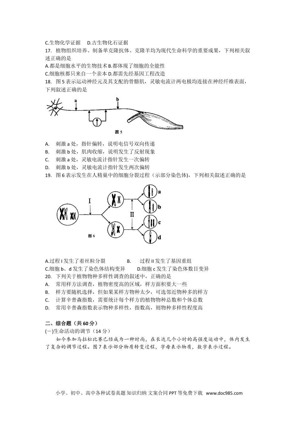 静安区2017~2018学年度等级考第一次质量调研生命科学试卷2018.1考生注意:1.试卷满分100分,考试时间60分钟。2.本考试分设试卷和答题纸。试卷包括两部分,第一部分全部为选择题,第二部分为综合题,包括填空题、选择题和简答题等题型。3.考生应用2B铅笔、钢笔或圆珠笔将答案直接写在答题纸上。一、选择题(共40分,每小题2分,每小题只有一个正确答案)1.检测糖尿病人的尿液,应使用的试剂及可能出现的现象是A.双缩脲试剂,紫色B.双缩脲试剂,蓝色C.苏丹m染液,红黄色D.班氏试剂,红黄色2.下列关于细胞器结构与功能的描述正确的是A.线粒体由双层膜包被B.高尔基体由双层膜包被C.内质网参与异物的消化D.溶酶体参与蛋白质运输3.图1表示甲状腺素分泌活动的调节机制,下列叙述正确的是A.a通过血液传递B.乙表示下丘脑C.b表示促甲状腺素释放素D.此过程为正反馈4.唾液淀粉酶能催化食物中的淀粉分解但不能催化蔗糖分解,说明酶具有A.专一性B.高效性C.两重性D.多样性5.下列关于免疫概念的对应关系,正确的是6.图2中编号所示的结构与核糖体功能有关的是A①B②C③D④7.下列关于用显微测微尺测量蚕豆叶下表皮保卫细胞长度实验的叙述中,正确的是A.不同放大倍数下,目镜测微尺每小格所代表的长度基本相同B.测量过程中常需转动目镜,以使测微尺与保卫细胞的长径平行C.从低倍物镜换为高倍物镜时,需调节粗调节器,使物象清晰小学、初中、高中各种试卷真题知识归纳文案合同PPT等免费下载www.doc985.comD.只要使用同一批蚕豆叶材料,不同保卫细胞的大小就一致8.图3是根据四位同学“探究植物细胞外界溶液浓度与质壁分离的关系”实验结果绘制的曲线图(A表示细胞长度,B表示pc原生质层长度),其中比较符合实际的曲线是A①B②C③D④9.在肺部红细胞能携带O2,在其他组织红细胞又将O2释放,O2两次通过红细胞膜的方式分别是A.自由扩散,自由扩散B.自由扩散,主动运输C.主动运输,协助扩散D.主动运输,主动运输10.通过显微观察核膜,可以区分下列哪一组生物A.细菌和病毒B.水绵和颤藻C.水绵和洋葱D.病毒和颤藻11.以下关于ATP的结构与功能的叙述,正确的是A.—个ATP分子中有三个高能磷酸键B.ATP分子由腺嘌呤、胸腺嘧啶和磷酸基组成C.形成ATP的过程有光合作用和细胞呼吸D.ATP释放的能量可用于光合作用中水的光解12.噬菌体侵染细菌实验中,对噬菌体(见图4)的不同结构用相应的同位素进行标记,以下对应关系正确的是A.①——18OB.①——14CC.②——32PD.②——35S13.取9个洁净培养皿,均分为三组(i、ii、ⅲ),各组分别加入等量的不同培养基,每个平板均用涂布法接种1mL大肠杆菌菌液,37°C培养36小时后,统计菌落数(见表1),以下相关叙述正确的是A.I组和II组说明维生素可以促进大肠杆菌生长B.I组和III组说明大肠杆菌正常生长需要糖类物质C.三组实验均使用了液体培养基,以方便菌落计数D.三组实验所使用的培养基均需620C、30min消毒14.下列关于生物遗传信息的叙述正确的是A.所有生物的遗传物质都是DNAB.DNA的结构单位是脱氧核苷酸C.DNA分子先全部解旋再复制D.基因转录、翻译均在细胞质完成15.酵母菌是兼气性微生物,下列有关其细胞呼吸过程的叙述正确的是A.有氧呼吸在线粒体中完成B.有氧呼吸的产物是C02C.无氧呼吸在细胞质基质中完成D.无氧呼吸的产物是乙醇16.20世纪70年代,生物学家开始通过比较不同生物RNA、DNA的核苷酸序列来说明他们之间的亲缘关系,这属于证明生物进化的A.胚胎学证据B.比较解剖学证据小学、初中、高中各种试卷真题知识归纳文案合同PPT等免费下载www.doc985.comC.生物化学证据D.古生物化石证据17.植物组织培养、制备单克隆抗体、克隆羊均为现代生命科学的重要成果,下列相关叙述正确的是A.都是细胞水平的生物技术B.都体现了细胞的全能性C.细胞核都只来自一个亲本D.都需先经基因工程改造18.图5表示运动神经元及其支配的骨骼肌,灵敏电流计两电极均连接在神经纤维表面,下列叙述正确的是A.刺激a处,指针偏转,说明电信号双向传递B.刺激b处,肌肉收缩,说明发生了反射现象C.刺激a处,灵敏电流计指针发生一次偏转D.刺激b处,灵敏电流计指针发生两次偏转19.图6表示发生在人精巢中的细胞分裂过程(...