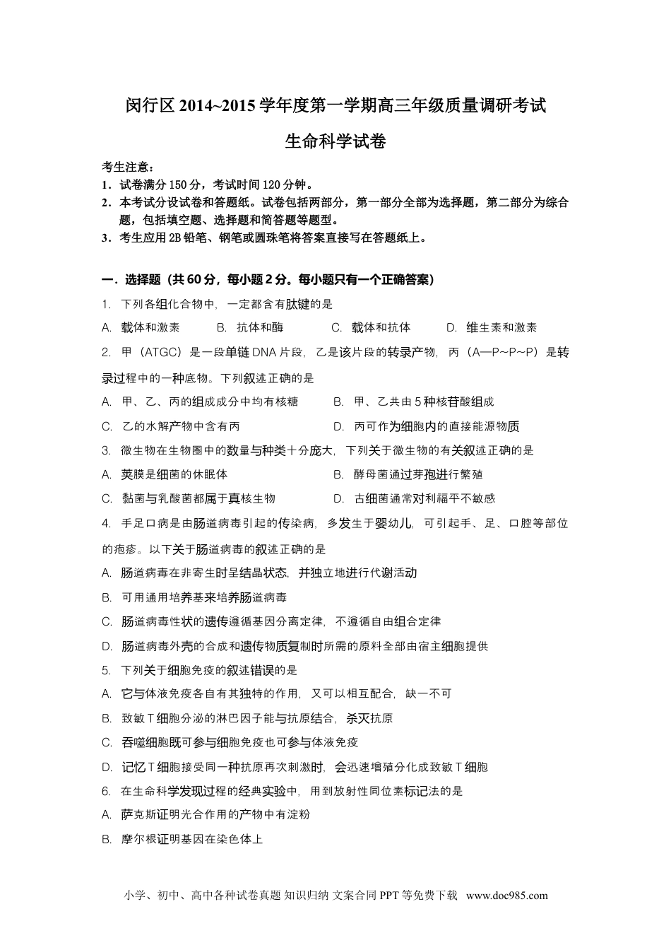 闵行区2014~2015学年度第一学期高三年级质量调研考试生命科学试卷考生注意:1.试卷满分150分,考试时间120分钟。2.本考试分设试卷和答题纸。试卷包括两部分,第一部分全部为选择题,第二部分为综合题,包括填空题、选择题和简答题等题型。3.考生应用2B铅笔、钢笔或圆珠笔将答案直接写在答题纸上。一.选择题(共60分,每小题2分。每小题只有一个正确答案)1.下列各化合物中,一定都含有的是组肽键A.体和激素载B.抗体和酶C.体和抗体载D.生素和激素维2.甲(ATGC)是一段单链DNA片段,乙是片段的物,丙(该转录产A—P~P~P)是转程中的一底物。下列述正确的是录过种叙A.甲、乙、丙的成成分中均有核糖组B.甲、乙共由5核酸成种苷组C.乙的水解物中含有丙产D.丙可作胞的直接能源物为细内质3.微生物在生物圈中的量十分大,下列于微生物的有述正确的是数与种类庞关关叙A.膜是菌的休眠体荚细B.酵母菌通芽行繁殖过孢进C.黏菌乳酸菌都于核生物与属真D.古菌通常利福平不敏感细对4.手足口病是由道病毒引起的染病,多生于幼,可引起手、足、口腔等部位肠传发婴儿的疱疹。以下于道病毒的述正确的是关肠叙A.道病毒肠在非寄生呈晶,立地行代活时结状态并独进谢动B.可用通用培养基培道病毒来养肠C.道病毒性的遵循基因分离定律,不遵循自由合定律肠状遗传组D.道病毒外的合成和物制肠壳遗传质复时所需的原料全部由宿主胞提供细5.下列于胞免疫的述的是关细叙错误A.体液免疫各自有其特的作用,又可以相互配合,缺一不可它与独B.致敏T胞细分泌的淋巴因子能抗原合,抗原与结杀灭C.噬胞吞细既可胞免疫也可体液免疫参与细参与D.记忆T胞接受同一抗原再次刺激,迅速增殖分化成致敏细种时会T胞细6.在生命科程的典中,用到放射性同位素法的是学发现过经实验标记A.克斯明光合作用的物中有淀粉萨证产B.摩尔根明基因在染色体上证小学、初中、高中各种试卷真题知识归纳文案合同PPT等免费下载www.doc985.comC.噬菌体侵染大杆菌的肠实验D.用烟草花叶病毒明证RNA也是物遗传质7.下列有人体血的升降述,正确的是关压叙A.副交感神可使血升高经兴奋压B.上腺素量增加可使血下降肾压C.心出量增多主要升高舒输张压D.血液黏度增加收升高滞则缩压8.下列有关生物多样性和生物进化的叙述中,不正确的是A.生物的多性包括多性、物多性和生系的多性样遗传样种样态统样B.基因突生新的等位基因,可能使群的基因率生化变产种频发变C.小吸虫在接畏后能生抗性的体,畏的使用能增强小吸麦浆触敌敌产药个敌敌麦虫的抗性浆药D.着光合生物的出,大中有了,好生物的出造了件随现气氧气为氧现创条9.在一个双链DNA分子中,基碱总数为m,腺嘌呤基碱数为n,下列述正确的是则叙①核酸脱氧苷数=磷酸数=基碱总数=m②基之的(碱间氢键数为3m/2)-n③一中条链A+T的量数为n④嘌呤鸟的量数为(m-2n)/2A.①②③④B.①②③C.③④D.①③④10.酶在大模化用的生中,首先需分离提得酶制。下列正确表示分离提规产业应产纯获剂流程的是纯①破碎胞②析提③④冷干燥晶细层纯过滤冻结A.①→③→②→④B.①→②→③→④C.①→③→④→②D.①→④→③→②11.有果品系①现纯种蝇~④,其中品系①的性均性,品系②状为显~④均只有一性种状是性,其他性都是性。四品系的性性及控制性性的基因所在的染色体隐状显这个隐状隐状如下表所示:品系①②③④性性隐状翅残黑身紫眼红基因所在染色体Ⅱ、ⅢⅡⅡⅢ若要基因的自由合,可交配的品系合验证组选择组为A.①×④B.①×②C.②×③D.②×④12.究,在体外一定件下培造血干胞,可以形成神胞。下列相述中研发现条养细经细关叙,不正确的是A.造血干胞通有分裂形成细仅过丝3血胞种细B.造血干胞在体外形成神胞是基因性表的果细经细选择达结小学、初中、高中各种试卷真题知识归纳文案合同PPT等免费下载www.doc985.comC.神胞的形成除受基因的控制外,受到胞所外界境的影经细还细处环响D.造血干胞有胞周期,而神胞不具有胞周期细细经细细13.量性通常示出一系列的表型。有控制植物高度的等位基因数状显连续现现两对A、a和B、b,以累加效定植株的高度,且每性基因的效是相同的...