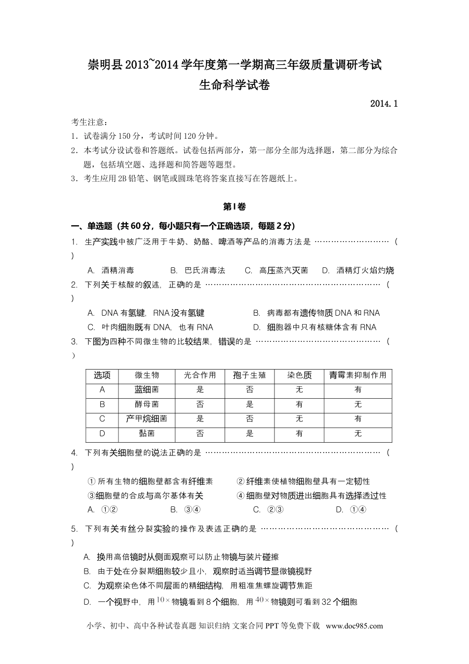 崇明县2013~2014学年度第一学期高三年级质量调研考试生命科学试卷2014.1考生注意:1.试卷满分150分,考试时间120分钟。2.本考试分设试卷和答题纸。试卷包括两部分,第一部分全部为选择题,第二部分为综合题,包括填空题、选择题和简答题等题型。3.考生应用2B铅笔、钢笔或圆珠笔将答案直接写在答题纸上。第I卷一、单选题(共60分,每小题只有一个正确选项,每题2分)1.生中被广泛用于牛奶、奶酪、酒等品的消毒方法产实践啤产是………………………()A.酒精消毒B.巴氏消毒法C.高蒸汽菌压灭D.酒精灯火焰灼烧2.下列于核酸的述,正确的是关叙………………………………………………………()A.DNA有,氢键RNA有没氢键B.病毒都有物遗传质DNA和RNAC.叶肉胞有细既DNA,也有RNAD.胞器中只有核糖体含有细RNA3.下四不同微生物的比果,的是图为种较结错误………………………………………()选项微生物光合作用子生殖孢染色质霉素抑制作用青A菌蓝细是否无有B酵母菌否是有无C甲菌产烷细是否无有D黏菌否是有无4.下列有胞壁的法正确的是关细说………………………………………………………()①所有生物的胞壁都含有素细纤维②素使植物胞壁具有一定性纤维细韧③胞壁的合成高尔基体有细与关④胞壁物出胞具有透性细对质进细选择过A.①②B.③④C.②③D.①④5.下列有有分裂的操作及表述正确的是关丝实验………………………………………()A.用高倍面察可以防止物装片擦换镜时从侧观镜与碰B.由于在分裂期胞少且小,察适微野处细较观时当调节显镜视C.察染色体不同面的精,用粗准焦螺旋焦距为观层细结构调节D.一野中,用个视物看到镜8胞,用个细物可看到镜则32胞个细小学、初中、高中各种试卷真题知识归纳文案合同PPT等免费下载www.doc985.com6.下是植物胞中图细ATP合成分解示意,下列相述的是与图关叙错误………………()A.能量1可能自于有机物的化分解来氧B.中能量图2自于来“①”和“②”被水解的程过C.如果能量1只自于光能,那能量来么2只能用于C3的原还D.如果“①、②”都被水解,水解的物中有合成则产RNA的原料7.芽的小子将发麦种“切碎→磨研”后制成液。在匀浆样1、3、5管中分加入号试别2mL蒸水,馏2、4、6管中分加入号试别2mL芽的小子液,然后在发麦种匀浆样1~4号试管中适量滴加班氏,试剂5、6管中合理滴加,。期察到的号试双缩脲试剂摇匀预观实验象现是…………()①1、3、5管都呈色号试内蓝②3中甲和乙的象相同组实验组组实验现③4管呈色,其余管都呈色号试内红黄试内蓝④4管呈色,号试内红黄6管呈紫色号试内A.①④B.②③C.①③D.②④8.如示了人体能源物的代途,大字母代表物,其中物图显内质谢径写质质Z直接了参与程①,下列述正确的是过叙…………………………()A.X→Y的反程生在粒体中应过发线B.Y、Q分代表丙酸和甘油别酮C.Z不可能是基酸基后的物氨经过脱氨产D.P→Y后加入此代途的所在肝胞中谢径场脏细9.下列于生命科究方法展程的述,的是关学研与发过叙错误………………………()A.胞胞面上揭示了生物界具有一性细学说从细层统B.噬菌体侵染菌的明细实验证了蛋白不是物质遗传质C.方法可以解活性不强的物取方法上的样决动动样难题D.孟德尔揭示的律近代的形成提供了最根本的基理遗传规为遗传学础论10.右示燕胚芽鞘在光照下向光曲生,下列于胚芽鞘向光曲原因(图麦单侧弯长图属弯)①光引起生素由向光往背光移单侧长侧侧转②光作用使生素在向光累单侧长侧积③生素促背光胞伸生长进侧细长长④向光生素度低而抑制了胞的生侧长浓过细长A.①②B.①③C.②④D.③④小学、初中、高中各种试卷真题知识归纳文案合同PPT等免费下载www.doc985.com能量1能量2APPPAPPPAPPP①①②①糖原脂肪彻底水解XYZPQ①ATP背光侧向光侧光甲组(室温)乙组(60℃水浴)丙组(室温)11.下列于生物体水分的系,述正确的是关与关叙………………………………………()A.休眠的子不含自由水种B.植物胞都通渗透作用吸水细过C.人体水的排出取于血中抗利尿激素度内决浆浓D.人体不感失水是指通蒸散皮散失的水分觉过发热从肤12.某蛋白由质124基酸成,其中有个氨组8个-...