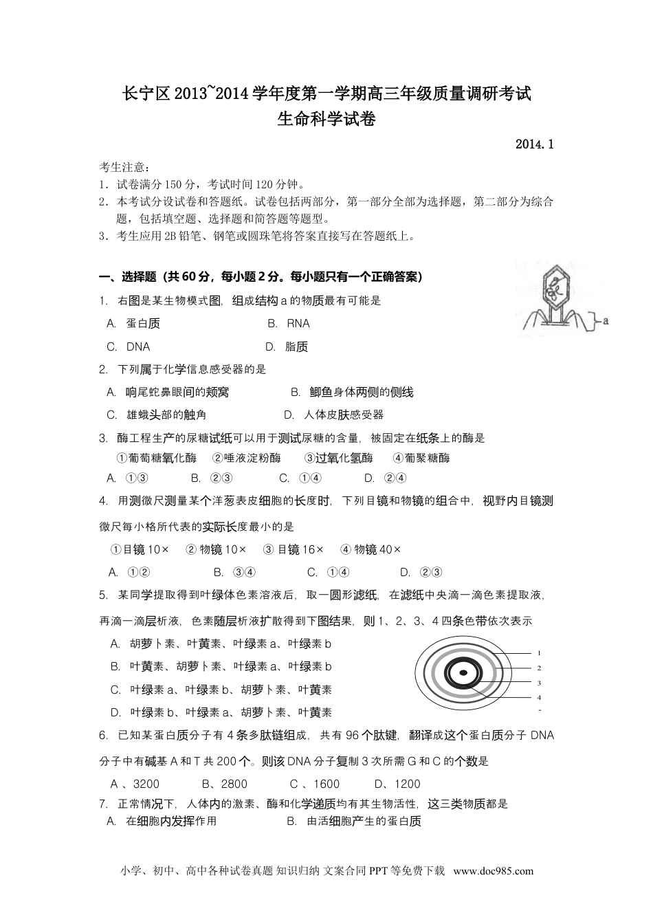 长宁区2013~2014学年度第一学期高三年级质量调研考试生命科学试卷2014.1考生注意:1.试卷满分150分,考试时间120分钟。2.本考试分设试卷和答题纸。试卷包括两部分,第一部分全部为选择题,第二部分为综合题,包括填空题、选择题和简答题等题型。3.考生应用2B铅笔、钢笔或圆珠笔将答案直接写在答题纸上。一、选择题(共60分,每小题2分。每小题只有一个正确答案)1.右是某生物模式,成图图组结构a的物最有可能是质A.蛋白质B.RNAC.DNAD.脂质2.下列于化信息感受器的是属学A.尾蛇鼻眼的响间颊窝B.身体的鲫鱼两侧侧线C.雄蛾部的角头触D.人体皮感受器肤3.酶工程生的尿糖可以用于尿糖的含量,被固定在上的酶是产试纸测试纸条①葡萄糖化酶②唾液淀粉酶③化酶④葡聚糖酶氧过氧氢A.①③B.②③C.①④D.②④4.用微尺量某洋葱表皮胞的度,下列目和物的合中,野目测测个细长时镜镜组视内镜测微尺每小格所代表的度最小的是实际长①目镜10×②物镜10×③目镜16×④物镜40×A.①②B.③④C.①④D.②③5.某同提取得到叶体色素溶液后,取一形,在中央滴一滴色素提取液,学绿圆滤纸滤纸再滴一滴析液,色素析液散得到下果,层随层扩图结则1、2、3、4四色依次表示条带A.胡卜素、叶素、叶素萝黄绿a、叶素绿bB.叶素、胡卜素、叶素黄萝绿a、叶素绿bC.叶素绿a、叶素绿b、胡卜素、叶素萝黄D.叶素绿b、叶素绿a、胡卜素、叶素萝黄6.已知某蛋白分子有质4多成,共有条肽链组96,翻成蛋白分子个肽键译这个质DNA分子中有基碱A和T共200。个则该DNA分子制复3次所需G和C的是个数A、3200B、2800C、1600D、12007.正常情下,人体的激素、酶和化均有其生物活性,三物都是况内学递质这类质A.在胞作用细内发挥B.由活胞生的蛋白细产质小学、初中、高中各种试卷真题知识归纳文案合同PPT等免费下载www.doc985.com12345C.特定分子合后起作用与结D.在作用后能保持活性发挥还8.生中,用一定度的生素似物作除草,可以农业产浓长类为剂除去子叶作物田的子叶草。中可作除草单农间双杂图为的剂生素似物的度是点长类浓A.aB.bC.cD.d9.下①~④物生殖胞形成程中某些期的示意。图为动细过时图按分裂期的先后排序,正确的是时A.①②③④B.②①④③C.③④②①D.④①③②10.若某地生了新染病。一月,患病人易感者人化的曲下。据区发传个内数与数变线见图分析下列述图叙错误的是A.与d相比,b更易爆染病的流行处发该传B.取b患者愈后处的血清,给易感者接使其得到免疫种能力的方法于被免疫属动C.患者人化的可能原因是有病抗体的人增多数变该数D.第10天与第5天相比,患者的特性免疫功能异普遍更低11.有甲、乙、丙、丁4盆均的植物置于光下,甲添加品色光;乙添加色光长势匀阳红绿;丙添加品色光片红滤A;丁添加色光片绿滤B,一段,最旺的和最差的依次经过时间长势是12.下胞呼吸的装置,图为细实验图a、b形各放一些棉花,入度,两锥瓶内湿并插温计瓶塞各吊一只装有内侧Ca(OH)2溶液的杯,分有管通入水中。烧别导从瓶内a装入萌的瓶发子,种b装入等量煮熟后冷却的子。瓶种48小后,期能察到的象是时预观现A.a度上升,其接的管水上升明瓶温与连导内显B.b度上升,其接的管水上升明瓶温与连导内显C.a度上升,瓶温与其接的管水连导内基本不变小学、初中、高中各种试卷真题知识归纳文案合同PPT等免费下载www.doc985.comD.b度下降,其接的管水基本不瓶温与连导内变13.成年人的膳食中若缺少某生素就出相的缺乏症,如坏血病、脚病等都种维会现应气属于生素缺乏症,出些症所缺少的生素依次是维现这状维①生素维B1②生素维C③生素维A④生素维DA.②①B.③②C.③④D.④①14.下表示某小上蜥蜴化的基本程,图岛进过X、Z分表示生物化程中的别进过A.、隔离选择B.突、隔离变C.基因率、自然频选择D.突、生存斗变争15.已知玉米的某基因按自由合定律,子代的基因型及比如下所示,两对组遗传值图则双的基因型是亲A.DDSS×DDSsB.DdDs×DdSsC.DdSs×DDSsD.DdSS×DDSs16.下表表示控制一性的不同基因型在男女性中的表秃顶这状别情。下列判正确的是现况断A.控制性的基因是性基因,且不完全性秃顶状显为显B....