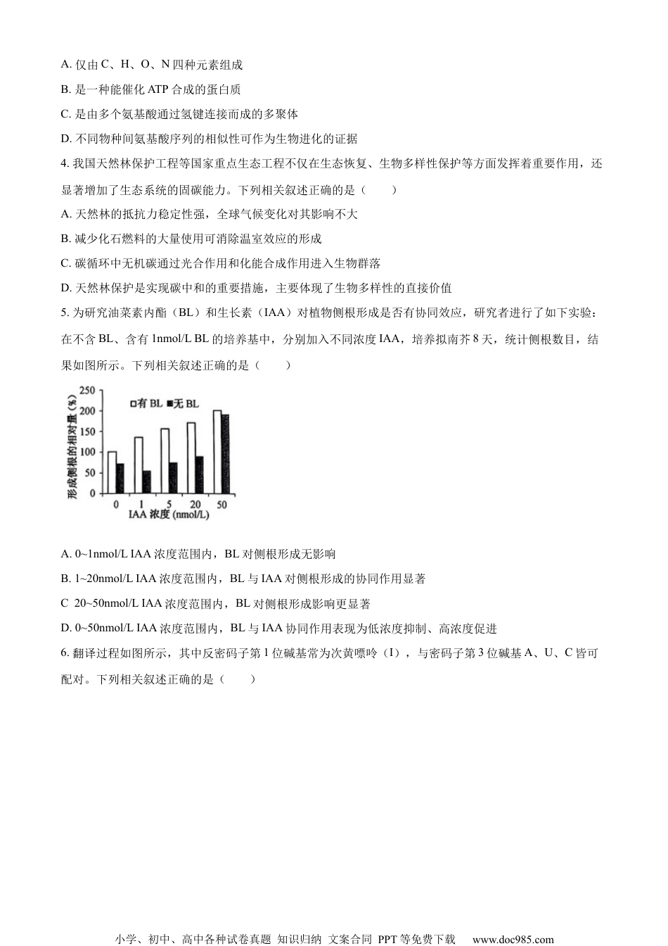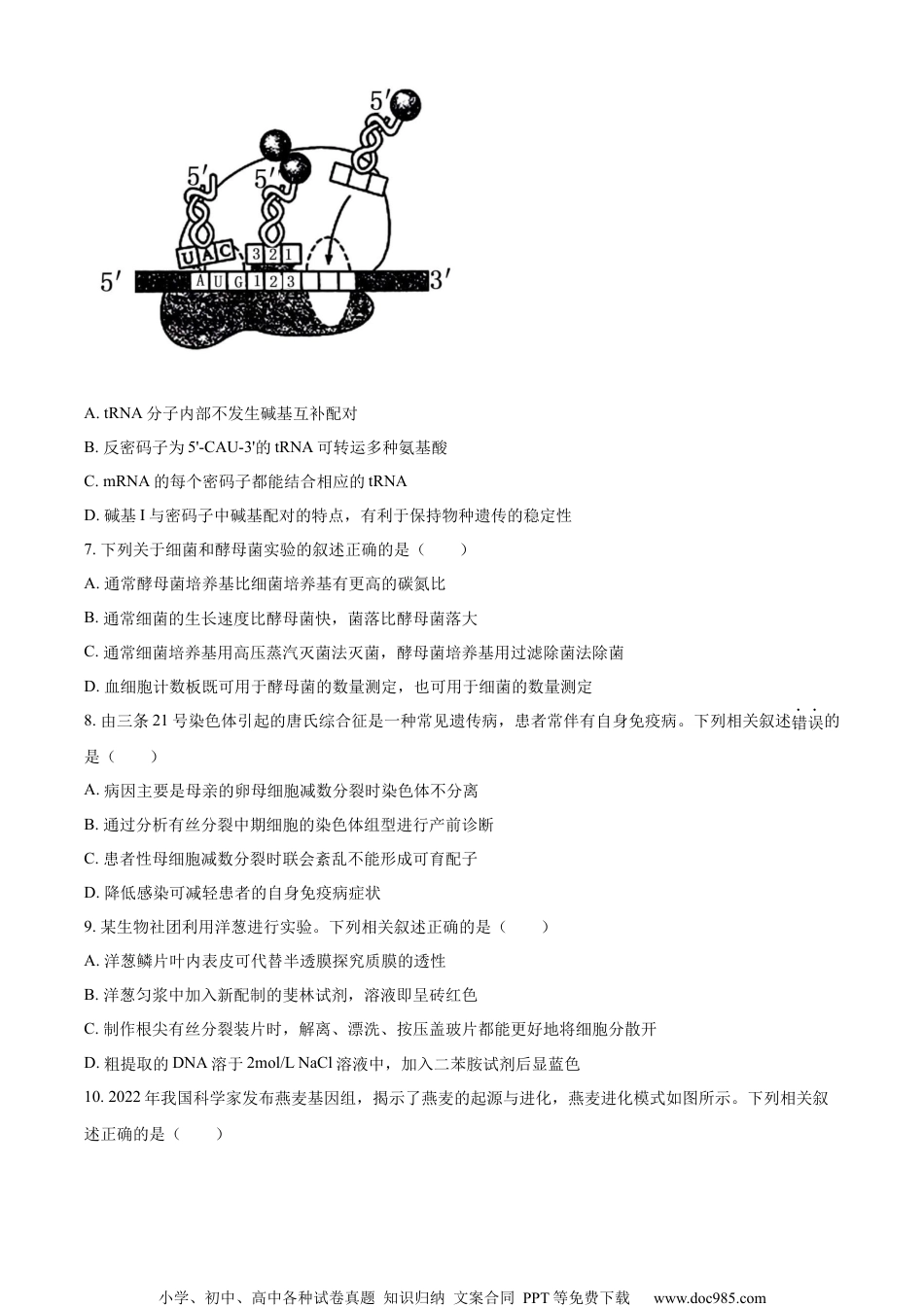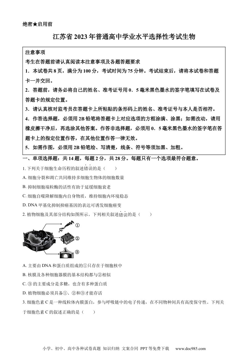 小学、初中、高中各种试卷真题知识归纳文案合同PPT等免费下载www.doc985.com绝密★启用前江苏省2023年普通高中学业水平选择性考试生物注意事项考生在答题前请认真阅读本注意事项及各题答题要求1.本试卷共8页,满分为100分,考试时间为75分钟。考试结束后,请将本试卷和答题卡一并交回。2.答题前,请务必将自己的姓名、准考证号用0.5毫米黑色墨水的签字笔填写在试卷及答题卡的规定位置。3.请认真核对监考员在答题卡上所粘贴的条形码上的姓名、准考证号与本人是否相符。4.作答选择题,必须用2B铅笔将答题卡上对应选项的方框涂满、涂黑;如需改动,请用橡皮擦干净后,再选涂其他答案。作答非选择题,必须用0.5毫米黑色墨水的签字笔在答题卡上的指定位置作答,在其他位置作答一律无效。5.如需作图,必须用2B铅笔绘、写清楚,线条、符号等须加黑、加粗。一、单项选择题:共14题,每题2分,共28分。每题只有一个选项最符合题意。1.下列关于细胞生命历程的叙述错误的是()A.细胞分裂和凋亡共同维持多细胞生物体的细胞数量B.抑制细胞端粒酶的活性有助于延缓细胞衰老C.细胞自噬降解细胞内自身物质,维持细胞内环境稳态D.DNA甲基化抑制抑癌基因的表达可诱发细胞癌变2.植物细胞及其部分结构如图所示。下列相关叙述错误的是()A.主要由DNA和蛋白质组成的①只存在于细胞核中B.核膜及各种细胞器膜的基本结构都与②相似C.③的主要成分是多糖,也含有多种蛋白质D.植物细胞必须具备①、②和③才能存活3.细胞色素C是一种线粒体内膜蛋白,参与呼吸链中的电子传递,在不同物种间具有高度保守性。下列关于细胞色素C的叙述正确的是()小学、初中、高中各种试卷真题知识归纳文案合同PPT等免费下载www.doc985.comA.仅由C、H、O、N四种元素组成B.是一种能催化ATP合成的蛋白质C.是由多个氨基酸通过氢键连接而成的多聚体D.不同物种间氨基酸序列的相似性可作为生物进化的证据4.我国天然林保护工程等国家重点生态工程不仅在生态恢复、生物多样性保护等方面发挥着重要作用,还显著增加了生态系统的固碳能力。下列相关叙述正确的是()A.天然林的抵抗力稳定性强,全球气候变化对其影响不大B.减少化石燃料的大量使用可消除温室效应的形成C.碳循环中无机碳通过光合作用和化能合成作用进入生物群落D.天然林保护是实现碳中和的重要措施,主要体现了生物多样性的直接价值5.为研究油菜素内酯(BL)和生长素(IAA)对植物侧根形成是否有协同效应,研究者进行了如下实验:在不含BL、含有1nmol/LBL的培养基中,分别加入不同浓度IAA,培养拟南芥8天,统计侧根数目,结果如图所示。下列相关叙述正确的是()A.0~1nmol/LIAA浓度范围内,BL对侧根形成无影响B.1~20nmol/LIAA浓度范围内,BL与IAA对侧根形成的协同作用显著C.20~50nmol/LIAA浓度范围内,BL对侧根形成影响更显著D.0~50nmol/LIAA浓度范围内,BL与IAA协同作用表现为低浓度抑制、高浓度促进6.翻译过程如图所示,其中反密码子第1位碱基常为次黄嘌呤(I),与密码子第3位碱基A、U、C皆可配对。下列相关叙述正确的是()小学、初中、高中各种试卷真题知识归纳文案合同PPT等免费下载www.doc985.comA.tRNA分子内部不发生碱基互补配对B.反密码子为5'-CAU-3'的tRNA可转运多种氨基酸C.mRNA的每个密码子都能结合相应的tRNAD.碱基I与密码子中碱基配对的特点,有利于保持物种遗传的稳定性7.下列关于细菌和酵母菌实验的叙述正确的是()A.通常酵母菌培养基比细菌培养基有更高的碳氮比B.通常细菌的生长速度比酵母菌快,菌落比酵母菌落大C.通常细菌培养基用高压蒸汽灭菌法灭菌,酵母菌培养基用过滤除菌法除菌D.血细胞计数板既可用于酵母菌的数量测定,也可用于细菌的数量测定8.由三条21号染色体引起的唐氏综合征是一种常见遗传病,患者常伴有自身免疫病。下列相关叙述错误的是()A.病因主要是母亲的卵母细胞减数分裂时染色体不分离B.通过分析有丝分裂中期细胞的染色体组型进行产前诊断C.患者性母细胞减数分裂时联会紊乱不能形成可育配子D.降低感染可减轻患者的自身免疫病症状9.某生物社团利用洋葱进行实验。下列相关叙述正确的是()A.洋葱鳞片叶内表皮可代替半透膜探究质膜...