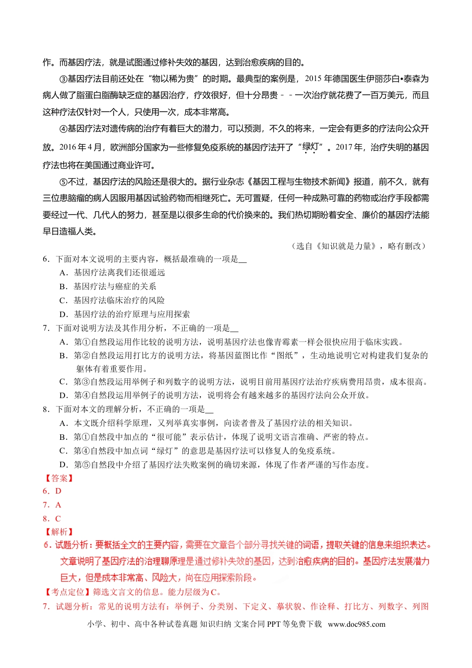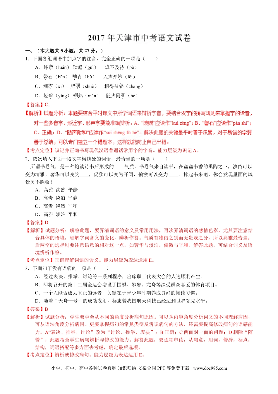 一、(本大题共5小题,共27分。)1.下面各组词语中加点字的注音,完全正确的一项是()A.峰峦(luán)馈赠(guì)迫不及待(pò)B.磐石(bān)哺育(bǔ)人声鼎沸(fèi)C.潮汐(xī)肥硕(shuò)相得益彰(zhāng)D.轻盈(yíng)娴熟(xián)随声附和(hé)【答案】C.【考点定位】识记并正确书写现代汉语普通话常用字的字音。能力层级为识记A。2.依次填入下面一段文字横线处的词语,最恰当的一项是()所谓书卷气,是一种饱读诗书后形成的气质。书卷气来自读书,在幽幽书香的熏陶之下,浊俗可以变为清雅,奢华可以变为,促狭可以变为开阔,偏激可以变为。捧起书来吧,你会发现里面的风景美不胜收!A.高雅淡然平静B.高贵淡泊平静C.高贵淡然平和D.高雅淡泊平和【答案】D【解析】试题分析:解答此题,要弄清词语的意义及常用用法,再次弄清词语的感情色彩,尤其要注意结合具体的语境,理解字词含义的变化,辨析作答。气质有雅俗之别而无贵贱之分,所以高雅最恰当;后两空的选择则要注意语意的相对这一点,如奢华与淡泊,偏激与平和。解答此题,可结合词义及语境辨析作答。【考点定位】正确理解词语的含义。能力层级为表达运用E。3.下面句子没有语病的一项是()A.经过表决、推举、讨论等一系列程序,出席职工代表大会的人选顺利产生。B.即将召开的第十三届全运会增设了围棋、攀岩、龙舟等深受群众喜爱的体育项目。C.一个人能否成为真正的读者,关键在于青少年时期养成良好的阅读习惯。D.随着“天舟一号”的成功发射,标志着我国航天科技已经达到世界领先水平。【答案】B【解析】试题分析:学生要学会从不同的角度分析病句原因。可以从内容角度分析词义的不同理解病因,可从语法角度分析病因。更要掌握病句的常见类型及辨识病句的方法,还需要提高修改病句的语感能力。A“表决、推举、讨论”改为“讨论、推举、表决”;B正确;C两面对一面的问题;D删除“随着”;此题考查学生病句辨析与修改的能力。解答此题,要逐项审读,从句意,用词,修辞,标点,结构,词语搭配等多方面去考虑,确定最后选项。【考点定位】辨析或修改病句。能力层级为表达运用E。小学、初中、高中各种试卷真题知识归纳文案合同PPT等免费下载www.doc985.com4.下面句子中的标点符号,使用不正确的一项是()A.看了媒体发布的收视率报告,我们才知道反腐大剧《人民的名义》到底有多火。B.人生,只有一条路不能选择,那就是放弃;只有一条路不能拒绝,那就是成长。C.大诗人苏轼曾说过:“古之立大事者,不惟有超世之才,亦必有坚忍不拔之志。”D.应该关注的是传统文化的形式?还是传统文化的内涵?这值得我们认真思考。【答案】D【考点定位】正确使用标点符号。能力层级为表达运用E。5.下面对诗句的赏析,不恰当的一项是()A.将军百战死,壮士十年归。(《木兰诗》)采用互文手法,写历经多年征战,有的将士战死沙场,木兰等幸存者胜利归来。B.征蓬出汉塞,归雁入胡天。(王维《使至塞上》)诗人以“征蓬”和“归雁”自比,表达了久居边塞,盼望回家团聚的急切心情。C.为报倾城随太守,亲射虎,看孙郎。(苏轼《江城子•密州出猎》)运用典故,写为回报百姓盛情要像孙权那样挽弓射虎,突出了诗人的“少年狂气”。D.只有那辽远的一角依然完整,温暖,明朗,坚固而蓬勃生春。(戴望舒《我用残损的手掌》)诗中“辽远的一角”指解放区,它明丽而充满生机,诗人对其饱含向往之情。【答案】B【解析】试题分析:要注意仔细分析,同时调动课内积累作答。B.诗人以“蓬”“雁”自比,说自己像随风而去的蓬草一样出临“汉塞”,像振翮北飞的“归雁”一样进入“胡天”。古诗中多用飞蓬比喻漂流在外的游子,这里却是比喻一个负有朝廷使命的大臣,正是暗写诗人内心的激愤和抑郁。并非写盼望回家团聚的急切心情;古诗词鉴赏也成为一门必修的能力,它直接或间接培养一个人的思想底蕴,因此在语文科目中占有的比重比较大,当然学习古诗词鉴赏更需要把握其核心的时代背景与表达感情,循序渐进地学好古诗词鉴赏。学科/网【考点定位】识记文化常识。能力层级为识记A。二、阅读《基因疗法离我们...