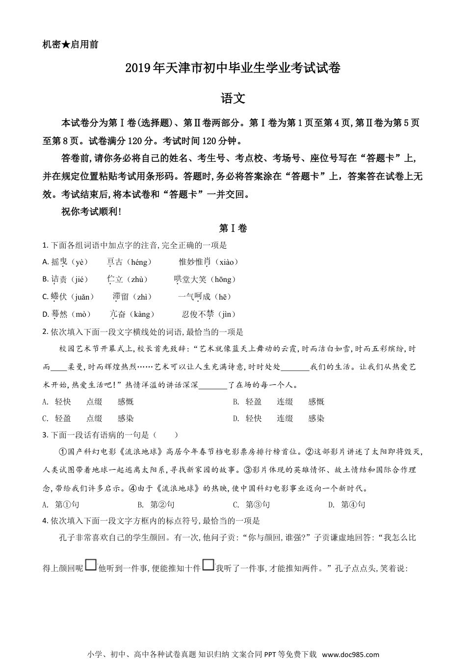 机密★启用前2019年天津市初中毕业生学业考试试卷语文本试卷分为第Ⅰ卷(选择题)、第Ⅱ卷两部分。第Ⅰ卷为第1页至第4页,第Ⅱ卷为第5页至第8页。试卷满分120分。考试时间120分钟。答卷前,请你务必将自己的姓名、考生号、考点校、考场号、座位号写在“答题卡”上,并在规定位置粘贴考试用条形码。答题时,务必将答案涂在“答题卡”上,答案答在试卷上无效。考试结束后,将本试卷和“答题卡”一并交回。祝你考试顺利!第Ⅰ卷1.下面各组词语中加点字的注音,完全正确的一项是A.摇曳(yè)亘古(héng)惟妙惟肖(xiào)B.诘责(jié)伫立(zhù)哄堂大笑(hōng)C.蜷伏(juǎn)滞留(zhì)一气呵成(hē)D.蓦然(mò)亢奋(kàng)忍俊不禁(jìn)2.依次填入下面一段文字横线处的词语,最恰当的一项是校园艺术节开幕式上,校长首先致辞:“艺术就像蓝天上舞动的云霞,时而洁白如雪,时而五彩缤纷,时而柔曼,时而辉煌热烈……艺术可以让人生充满诗意,时时处处我们的生活。让我们从热爱艺术开始,热爱生活吧!”热情洋溢的讲话深深了在场的每一个人。A.轻快点缀感慨B.轻盈连缀感慨C.轻盈点缀感染D.轻快连缀感染3.下面一段话有语病的一句是()①国产科幻电影《流浪地球》高居今年春节档电影票房排行榜首位。②这部影片讲述了太阳即将毁灭,人类试图带着地球一起逃离太阳系,寻找新家园的故事。③影片体现的英雄情怀、故土情结和国际合作理念,带给我们许多启示。④由于《流浪地球》的热映,使中国科幻电影事业迈向一个新时代。A.第①句B.第②句C.第③句D.第④句4.依次填入下面一段文字方框内的标点符号,最恰当的一项是孔子非常喜欢自己的学生颜回。有一次,他问子贡:“你与颜回,谁强?”子贡谦虛地回答:“我怎么比得上颜回呢他听到一件事,便能推知十件我听了一件事,才能推知两件。”孔子点点头,笑着说:小学、初中、高中各种试卷真题知识归纳文案合同PPT等免费下载www.doc985.com“你不如他,我与你都不如他A.,;”!B.?;!”C.?,”!D.,,!”5.下面对《渡荆门送别》一诗的赏析,不恰当的一项是渡荆门送别李白渡远荆门外,来从楚国游。山随平野尽,江入大荒流。月下飞天镜,云生结海楼。仍怜故乡水,万里送行舟。A.首联点题,写出诗人乘舟到遥远的荆门外,将到楚地游览。B.“山随平野尽”一句“随”“尽”两个字,让静止的山峦富于动态。C.颈联描摹的朗月映照下的夜景和黄昏的天边云霞,宛如两幅图画,令人陶醉。D.诗人在尾联直抒胸臆,借自己对家乡之水的恋恋不舍,抒发了浓浓的思乡之情。阅读《啄木鸟真的是益鸟》一文,回答下列小题。啄木鸟真的是益鸟周大庆①啄木鸟一直被人们誉为“森林医生”,是益鸟。但近日,一篇宣称啄木鸟的“啄木”行为破坏树木、加速树木死亡的自媒体文章广泛传播,称啄木鸟绝非“益鸟”。事实真的是这样吗?②其实,鸟本无好坏之分。无论是啄木鸟,还是其他鸟,都是人类的朋友。人类往往按照是否有利于农林业生产经营、是否造成经济损失等,将鸟划分为“益鸟”或“害鸟”。然而,从生物多样性保护的角度看,所有鸟类都是生态系统的组成部分。正是多样的生物促进了整个生态系统的动态稳定,为人类提供了赖以生存的自然环境。③啄木鸟确实偏好在“生病”的树上觅食,科学工作者野外观察发现,啄木鸟的啄洞虽然会为某些病菌、害虫的滋生提供入口,但是,一般来说,不会导致树木死亡。即使啄洞会导致少量树木死亡,对于整个森林生态系统而言也基本没有影响,因为森林本身就是一个动态系统,树木有生有死,整个森林生态系统才会健康运转。④从促进生物多样性的角度来说,啄木鸟发挥着重要的积极作用。啄木鸟属于初级洞巢鸟,自己开凿树洞并在洞内繁殖。同时,还为次级洞巢鸟(指没有啄洞本领,需要利用啄木鸟的旧洞进行繁殖的鸟类)提供“住所”。例如猫头鹰和大山雀,它们很多时候就需要利用啄木鸟的旧洞进行繁殖。如果某区域没有初级洞巢鸟,那么次级洞巢鸟也很可能消失。不仅如此,啄木鸟的啄洞还能为花鼠、貂等哺乳动物提供繁殖栖息场所。可以说,啄木鸟在整个森林生态系统的群落组织方面发挥着举足轻重的作用,是名副其实的“基石”物种。小学、初中、高中各种试卷真题知识归纳文案合同PPT等免费下载www.doc...