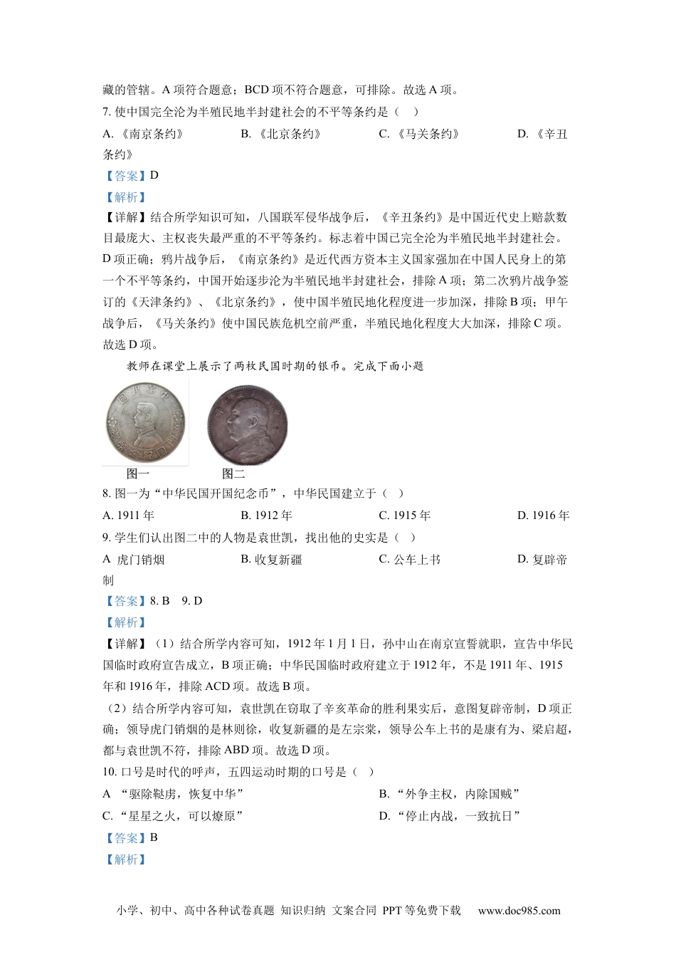 小学、初中、高中各种试卷真题知识归纳文案合同PPT等免费下载www.doc985.com2021年天津市初中学业考查历史试卷第Ⅰ卷一、单项选择题(本大题共23小题,每小题2分,共46分)1.为三国鼎立局面的形成奠定了基础的战役是()A.长平之战B.官渡之战C.赤壁之战D.淝水之战【答案】C【解析】【详解】赤壁之战是公元208年曹操与孙刘联军的战争,孙刘联军以少胜多,大败曹军。为三国鼎立局面形成奠定了基础。C项正确;长平之战是战国时期,排除A项;公元200年袁绍与曹操展开了官渡之战。曹操以少胜多,大败袁军。为曹操统一北方奠定了基础。排除B项;淝水之战是公元383年前秦与东晋的战争。排除D项。故选C项。2.世界上首先将圆周率精确到小数点以后的第七位数字的科学家是()A.贾思勰B.祖冲之C.王羲之D.顾恺之【答案】B【解析】【详解】世界上最早把圆周率精确到小数点后的第七位数字的科学家是祖冲之,祖冲之是中国南北朝时期杰出的数学家、天文学家,一生钻研自然科学,其主要贡献在数学、天文历法和机械制造三方面,他在刘徽开创的探索圆周率的精确方法的基础上,首次将“圆周率”精算到小数第七位,即在3.1415926和3.1415927之间,B项正确;贾思勰的农学著作是《齐民要术》,排除A项;王羲之是书法家,代表作是《兰亭集序》,排除C项;顾恺之是画家,代表作是《女史箴图》和《洛神赋图》,排除D项。故选B项。3.图中贯通南北的大运河开通于()小学、初中、高中各种试卷真题知识归纳文案合同PPT等免费下载www.doc985.comA.隋朝B.唐朝C.元朝D.明朝【答案】A【解析】【详解】结合所学知识可知,大运河开通是隋朝隋炀帝,他修建大运河的目的是加强南北交通巩固隋王朝对全国的统治。A项正确;唐朝与大运河的开通不符,排除B项;元朝与大运河的开通不符,排除C项;明朝与大运河的开通无关,排除D项。故选A项。4.通过“杯酒释兵权”迫使大将纷纷交出兵权的是()A.汉高祖B.唐玄宗C.宋太祖D.明太祖【答案】C【解析】【详解】宋太祖深知唐末以来武将专权的积弊,首先通过“杯酒释兵权”解除禁军高级将领的兵权,牢牢地控制了军队。宋太祖还控制对军队的调动,使禁军将领有握兵之重而无发兵之权。他还经常调换军队将领,定期换防,割断将领与士兵和地方的联系,使兵不识将,将不专兵,C项正确;汉高祖建立西汉,与题干内容无关,排除A项;唐玄宗开创开元盛世的局面,材料没有涉及,排除B项;明太祖建立明朝,题干没有涉及,排除D项。故选C项。5.辽宋夏金元时期,建立大金政权的是()A.契丹族B.女真族C.蒙古族D.党项族【答案】B【解析】【详解】结合所学知识可知,12世纪初期,女真的杰出首领阿骨打在会宁(今黑龙江阿城)称帝,国号金,他就是金太祖,B项正确;综合上述分析可排除ACD项。故选B项。6.与下表史实均相关的地区是()朝代史实唐朝将文成公主嫁给松赞干布元朝设置宣政院清朝册封达赖、班禅A.西藏B.新疆C.台湾D.南海【答案】A【解析】【详解】结合所学知识可知,唐太宗时期,将文成公主嫁给吐蕃赞普松赞干布;文成公主入藏唐蕃和亲促进了吐蕃经济和社会的发展,也增进了汉藏两族的友好关系;元朝设宣政院直接统辖西藏,西藏正式成为中央直接管辖下的一个地方行政区域;顺治帝接见五世达赖,赐予“达赖喇嘛”的封号;后来,康熙帝赐予五世班禅“班禅额尔德尼”的封号,后来清朝设置驻藏大臣,代表中央政府常驻西藏,同达赖、班禅共同管理西藏,加强了对西小学、初中、高中各种试卷真题知识归纳文案合同PPT等免费下载www.doc985.com藏的管辖。A项符合题意;BCD项不符合题意,可排除。故选A项。7.使中国完全沦为半殖民地半封建社会的不平等条约是()A.《南京条约》B.《北京条约》C.《马关条约》D.《辛丑条约》【答案】D【解析】【详解】结合所学知识可知,八国联军侵华战争后,《辛丑条约》是中国近代史上赔款数目最庞大、主权丧失最严重的不平等条约。标志着中国已完全沦为半殖民地半封建社会。D项正确;鸦片战争后,《南京条约》是近代西方资本主义国家强加在中国人民身上的第一个不平等条约,中国开始逐步沦为半殖民地半封建社会,排除A项;第二次鸦片战争签订的《天津条约》、《北京条...