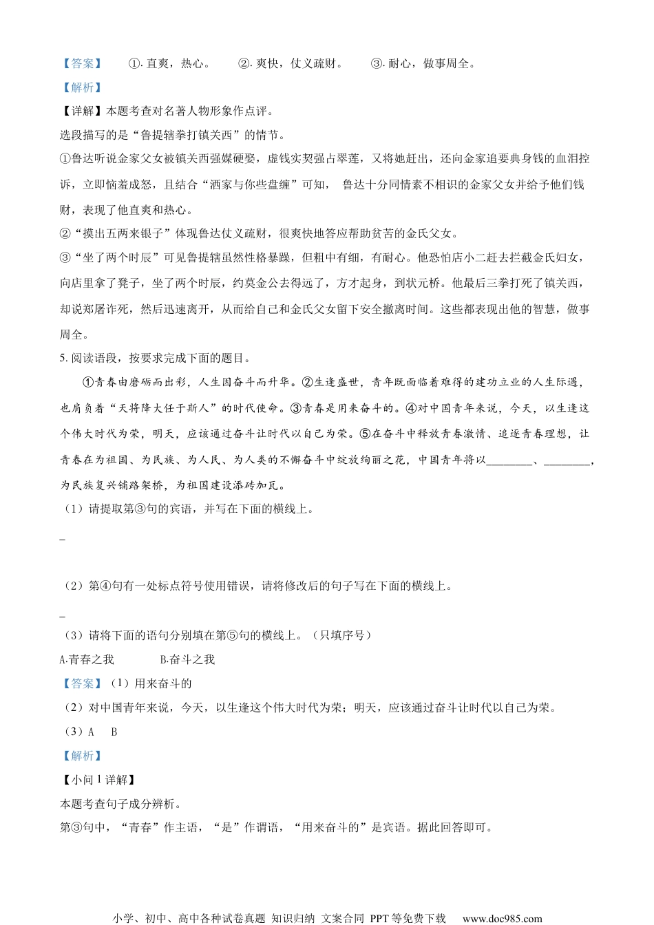 小学、初中、高中各种试卷真题知识归纳文案合同PPT等免费下载www.doc985.com2022年陕西省初中学业水平考试语文试卷注意事项:1.本试卷共8页。全卷总分120分。考试时间150分钟。2.答题前,考生在试卷和答题卡上务必用直径0.5毫米黑色墨水签字笔将自己的姓名、准考证号填写清楚。3.请用直径0.5毫米黑色墨水签字笔在答题卡上各题的答题区域内作答,在试题卷上作答无效。4.考试结束,将本试卷和答题卡一并交回。一、积累和运用(共5小题,计17分)1.下列各组词语中,加点字的读音全都正确的一组是()A.星宿(sù)门框(kuàng)贮蓄(chǔ)屏息凝神(bǐng)B.确凿(záo)翘首(qiǎo)烟囱(cōng)潜滋暗长(qiǎn)C.矩形(jù)矗立(chù)擦拭(chā)强聒不舍(qiǎng)D.殷红(yān)遒劲(jìng)勾当(dàng)不屑置辩(xiè)【答案】D【解析】【详解】A.星宿(sù)——xiù,贮蓄(chǔ)——zhù;B.翘首(qiǎo)——qiáo,潜滋暗长(qiǎn)——qián;C.矩形(jù)——jǔ,擦拭(chā)——cā;故选D。2.下列各组词语中,汉字书写全都正确的一组是()A.帐篷辐射鸠占鹊巢大庭广众B.照璧泄气矫揉造做喜出望外C.独裁狼藉无精打彩眼花缭乱D.取缔决别望眼欲穿断章取意【答案】A【解析】【详解】B.照璧——照壁,矫揉造做——矫揉造作;C.无精打彩——无精打采;D.决别——诀别,断章取意——断章取义;小学、初中、高中各种试卷真题知识归纳文案合同PPT等免费下载www.doc985.com故选A。3.经典诗文默写。[在(1)~(7)题中,任选五题;在(8)~(10)题中,任选一题](1)_______________,君子好逑。(《关雎》)(2)_______________,虽不能察,必以情。(《曹刿论战》)(3)_______________,教然后知困。(《虽有嘉肴》)(4)_______________,采葵持作羹。(《十五从军征》)(5)_______________,恨别鸟惊心。(杜甫《春望》)(6)不应有恨,_______________。(苏轼《水调歌头(明月几时有)》)(7)落红不是无情物,_______________。(龚自珍《己亥杂诗》)(8)“吹面不寒杨柳风”,不错的,_______________。(朱自清《春》)(9)这就是白杨树,西北极普通的一种树,_____________!(茅盾《白杨礼赞》)(10)我是你簇新的理想,_______________。(舒婷《祖国啊,我亲爱的祖国》)【答案】①.窈窕淑女②.小大之狱③.是故学然后知不足④.舂谷持作饭⑤.感时花溅泪⑥.何事长向别时圆⑦.化作春泥更护花⑧.像母亲的手抚摸着你⑨.然而决不是平凡的树⑩.刚从神话的蛛网里挣脱【解析】【详解】默写题作答时,一是要透彻理解诗文的内容;二是要认真审题,找出符合题意的诗文句子;三是答题内容要准确,做到不添字、不漏字、不写错字。本题中的“窈、窕、淑、舂、抚、蛛”等字词容易写错。4.请根据圈点内容,对鲁达做点评。《水浒》选段点评鲁达又道:“①老儿,你来。洒家与你些盘缠,明日便回东京去如何?”父子两个告道:“若是能勾得回乡去时,便是重生父母,再长爷娘。只是店主人家如何肯放?郑大官人须着落他要钱。”鲁提辖道:“这个不妨事,俺自有道理。”②便去身边摸出五两来银子,放在桌上,看着史进道:“洒家今日不曾多带些出来,你有银子借些与俺,洒家明日便送还你。”……且说鲁达寻思,恐怕店小二赶去拦截他,且向店里掇条凳子,③坐了两个时辰。约莫金公去的远了,方才起身,径投状元桥来。①___________②___________③___________小学、初中、高中各种试卷真题知识归纳文案合同PPT等免费下载www.doc985.com【答案】①.直爽,热心。②.爽快,仗义疏财。③.耐心,做事周全。【解析】【详解】本题考查对名著人物形象作点评。选段描写的是“鲁提辖拳打镇关西”的情节。①鲁达听说金家父女被镇关西强媒硬娶,虚钱实契强占翠莲,又将她赶出,还向金家追要典身钱的血泪控诉,立即恼羞成怒,且结合“洒家与你些盘缠”可知,鲁达十分同情素不相识的金家父女并给予他们钱财,表现了他直爽和热心。②“摸出五两来银子”体现鲁达仗义疏财,很爽快地答应帮助贫苦的金氏父女。③“坐了两个时辰”可见鲁提辖虽然性格暴躁,但粗中有细,有耐心。...