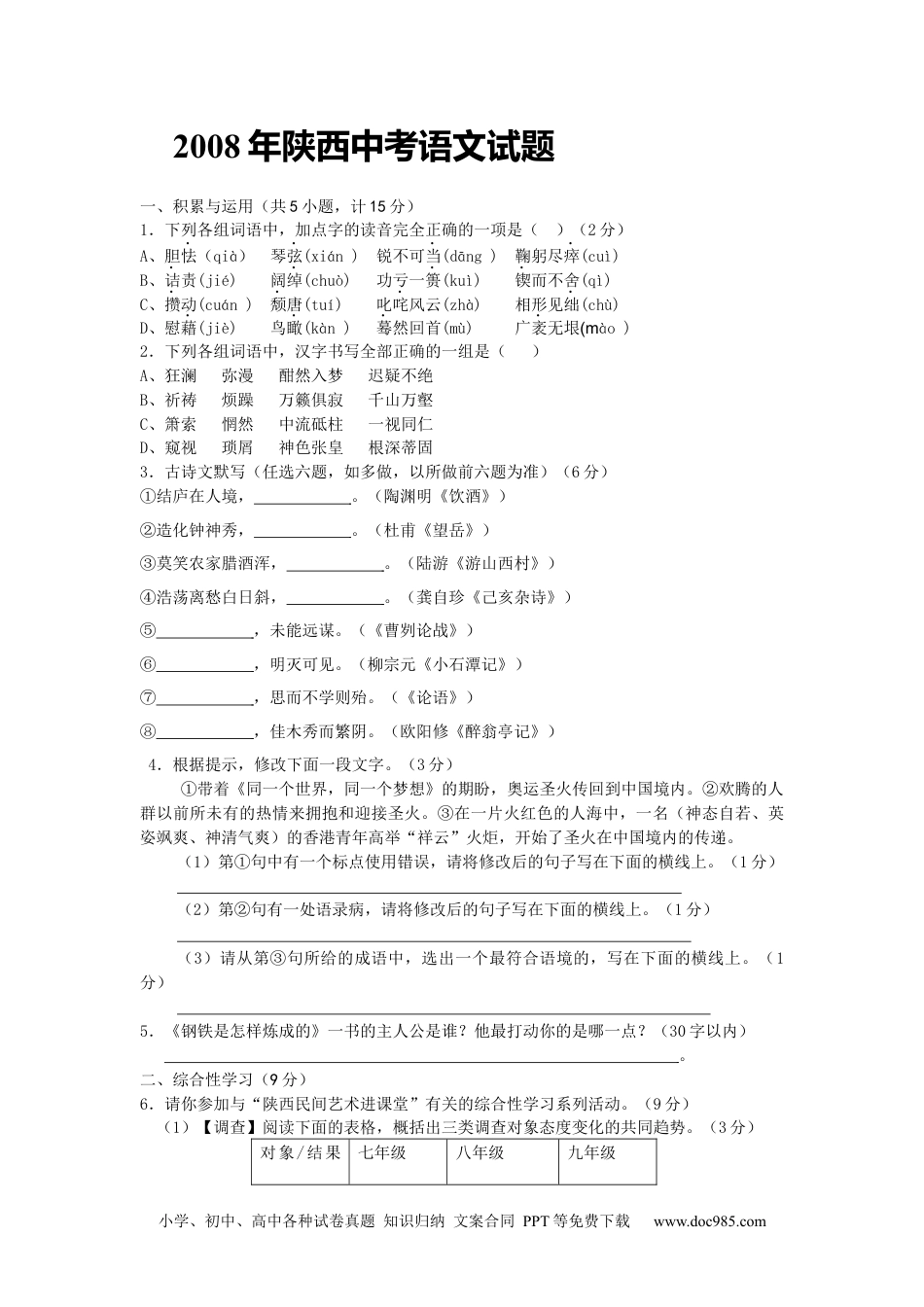 小学、初中、高中各种试卷真题知识归纳文案合同PPT等免费下载www.doc985.com2008年陕西中考语文试题一、积累与运用(共5小题,计15分)1.下列各组词语中,加点字的读音完全正确的一项是()(2分)A、胆怯(qià)琴弦(xián)锐不可当(dāng)鞠躬尽瘁(cuì)B、诘责(jié)阔绰(chuò)功亏一篑(kuì)锲而不舍(qì)C、攒动(cuán)颓唐(tuí)叱咤风云(zhà)相形见绌(chù)D、慰藉(jiè)鸟瞰(kàn)蓦然回首(mù)广袤无垠(mào)2.下列各组词语中,汉字书写全部正确的一组是()A、狂澜弥漫酣然入梦迟疑不绝B、祈祷烦躁万籁俱寂千山万壑C、箫索惘然中流砥柱一视同仁D、窥视琐屑神色张皇根深蒂固3.古诗文默写(任选六题,如多做,以所做前六题为准)(6分)①结庐在人境,。(陶渊明《饮酒》)②造化钟神秀,。(杜甫《望岳》)③莫笑农家腊酒浑,。(陆游《游山西村》)④浩荡离愁白日斜,。(龚自珍《己亥杂诗》)⑤,未能远谋。(《曹刿论战》)⑥,明灭可见。(柳宗元《小石潭记》)⑦,思而不学则殆。(《论语》)⑧,佳木秀而繁阴。(欧阳修《醉翁亭记》)4.根据提示,修改下面一段文字。(3分)①带着《同一个世界,同一个梦想》的期盼,奥运圣火传回到中国境内。②欢腾的人群以前所未有的热情来拥抱和迎接圣火。③在一片火红色的人海中,一名(神态自若、英姿飒爽、神清气爽)的香港青年高举“祥云”火炬,开始了圣火在中国境内的传递。(1)第①句中有一个标点使用错误,请将修改后的句子写在下面的横线上。(1分)(2)第②句有一处语录病,请将修改后的句子写在下面的横线上。(1分)(3)请从第③句所给的成语中,选出一个最符合语境的,写在下面的横线上。(1分)5.《钢铁是怎样炼成的》一书的主人公是谁?他最打动你的是哪一点?(30字以内)。二、综合性学习(9分)6.请你参加与“陕西民间艺术进课堂”有关的综合性学习系列活动。(9分)(1)【调查】阅读下面的表格,概括出三类调查对象态度变化的共同趋势。(3分)对象/结果七年级八年级九年级小学、初中、高中各种试卷真题知识归纳文案合同PPT等免费下载www.doc985.com/年级学生赞成赞成较赞成老师赞成较赞成保留意见家长赞成保留意见反对共同趋势:(2)【讨论】针对下面言论中的一个要点,表明自己的态度并谈出理由。(3分)陕西民间艺术宜纳入原有的音乐、美术、劳技等课程之中,不增加课时,不设为考试科目。针对的要点:态度和理由:(3)【宣传】请为你所在地区富有特色的一种民间艺术写一条宣传语。要求:突出该民间艺术的特点,并使用比喻的修辞方法。(3分)示例:奔放欢快的《二人传》,好比是阳光、空气和水,是东北人不可缺少的精神食粮。(东北某学生写)三、阅读(共15小题,计46分)【现代文阅读】(共9小题,计30分)(一)阅读下面的文字,完成7——10题。(12分)生命探测仪孙科孙晋龙①生命探测仪是一种探测生命迹象的仪器,是一种高科技救援设备。目前常见的有红外生命探测仪、音频生命探测仪和雷达生命探测仪。②红外生命探测仪主要用于地震、爆炸等引起建筑物倒塌、人员被困和埋在地下时,正确测定被困人员的准确位置。它能经受住救援现场的恶劣条件,探测出遇难者身体的热量,利用红外探测器、光学成像物镜将红外辐射能转换成电信号,经处理后通过电视屏或监测器显示红外热像图,从而帮助救援队员很快确定被困者的位置。③第二次世界大战后,美国某公司开发研制了第一代用于军事领域的红外成像装置,称之为红外寻视系统。20世纪60年代早期,瑞典某公司增加了测温的功能,称之为红外热像仪。60年代中期,瑞典研制出第一套工业用的实时成像系统,后经改进,1988年推出的全功能热像仪,将温度的测量、修改、分析、图像采集、存储合于一体,仪器的功能精度和可靠性都得到了显著的提高。④随着社会经济的发展,这种军用的侦察设备也被转变成了救援仪器——红外生命探测仪。目前红外生命探测仪的技术比较成熟,价格也相对较低,良好的性价比促使它普遍装备于各国的抢险救援部门,应用广泛。随着图像转换技术和计算机技术的迅猛发展,红外生命探测仪在成像、定位等方面必然会有更大的提高。⑤音频...