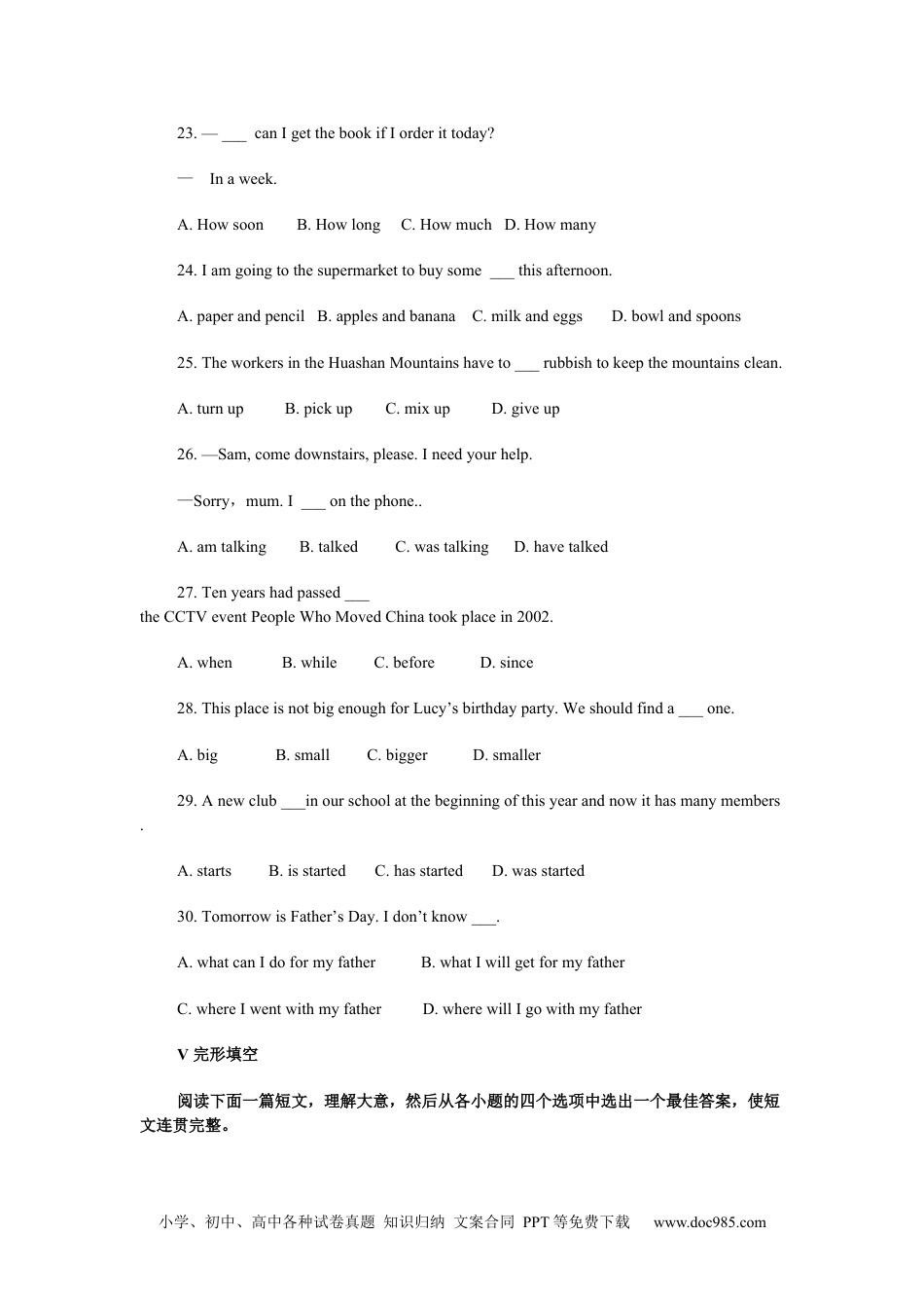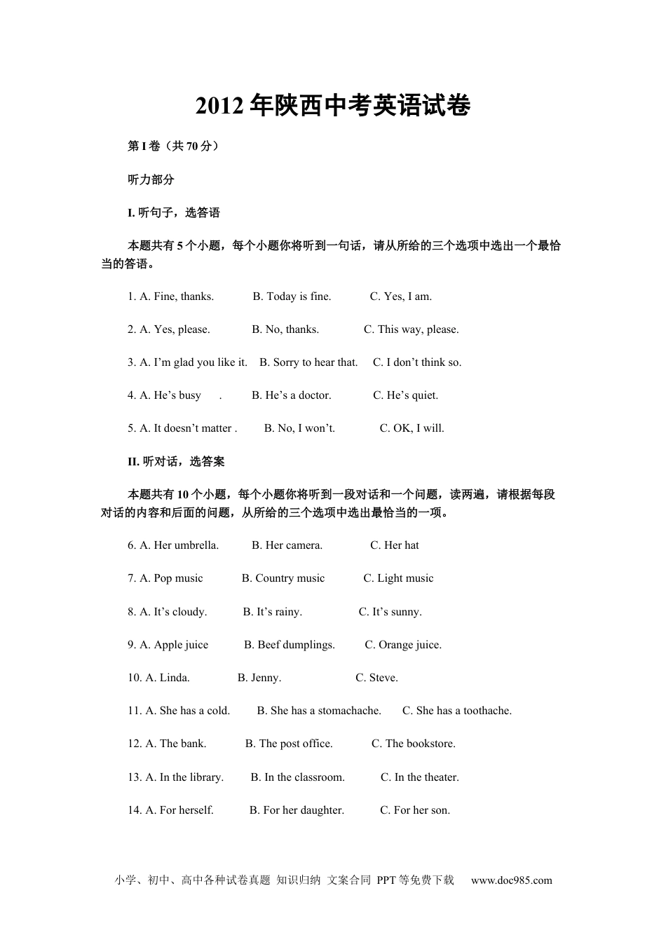 小学、初中、高中各种试卷真题知识归纳文案合同PPT等免费下载www.doc985.com2012年陕西中考英语试卷第I卷(共70分)听力部分I.听句子,选答语本题共有5个小题,每个小题你将听到一句话,请从所给的三个选项中选出一个最恰当的答语。1.A.Fine,thanks.B.Todayisfine.C.Yes,Iam.2.A.Yes,please.B.No,thanks.C.Thisway,please.3.A.I’mgladyoulikeit.B.Sorrytohearthat.C.Idon’tthinkso.4.A.He’sbusy.B.He’sadoctor.C.He’squiet.5.A.Itdoesn’tmatter.B.No,Iwon’t.C.OK,Iwill.II.听对话,选答案本题共有10个小题,每个小题你将听到一段对话和一个问题,读两遍,请根据每段对话的内容和后面的问题,从所给的三个选项中选出最恰当的一项。6.A.Herumbrella.B.Hercamera.C.Herhat7.A.PopmusicB.CountrymusicC.Lightmusic8.A.It’scloudy.B.It’srainy.C.It’ssunny.9.A.ApplejuiceB.Beefdumplings.C.Orangejuice.10.A.Linda.B.Jenny.C.Steve.11.A.Shehasacold.B.Shehasastomachache.C.Shehasatoothache.12.A.Thebank.B.Thepostoffice.C.Thebookstore.13.A.Inthelibrary.B.Intheclassroom.C.Inthetheater.14.A.Forherself.B.Forherdaughter.C.Forherson.小学、初中、高中各种试卷真题知识归纳文案合同PPT等免费下载www.doc985.com15.A.BecauseherfatherlostthekeysB.BecauseshelostherkeysC.Becauseshelostherfather’skeys.III听短文,选答案本题你将听到一篇短文,读两遍,请从每个小题的三个选项中,选出一个正确答案。16.HowoldwasDavidwhenhewenttothemiddleschool?A.12B.13C.1417.Whenhewasinthefirstyearofmiddleschool,Davidalways___..A.tookthebustoschool.B.wenttoschoolbybike.C.rantoschool.18.HowdidDavidgethiscomputer?A.TheschoolgaveittohimB.Hisparentsboughtitforhim.C.Heboughtitforhimself.19.Afterhegotthecomputer,___..A.David’sgradeswerenotsogoodasbeforeB.David’sgradeswerebetterthanbefore.C.Davidstudiedashardasbefore.20.Davidfelt___whenheheardhismother’swords.A.bored.B.happy.C.sorry.笔试部分IV单项选择本题共有10个小题,请从每个小题的四个选项中,选出一个最佳答案。21.Lookat___eraseronthefloor.Whoseisit?A.aB.anC.theD./22.—Whodidyougotothemovie___?—Nobody.Iwentalone.A.withB.aboutC.forD.from小学、初中、高中各种试卷真题知识归纳文案合同PPT等免费下载www.doc985.com23.—___canIgetthebookifIorderittoday?—Inaweek.A.HowsoonB.HowlongC.HowmuchD.Howmany24.Iamgoingtothesupermarkettobuysome___thisafternoon.A.paperandpencilB.applesandbananaC.milkandeggsD.bowlandspoons25.TheworkersintheHuashanMountainshaveto___rubbishtokeepthemountainsclean.A.turnupB.pickupC.mixupD.giveup26.—Sam,comedownstairs,please.Ineedyourhelp.—Sorry,mum.I___onthephone..A.amtalkingB.talkedC.wastalkingD.havetalked27.Tenyearshadpassed___theCCTVeventPeopleWhoMovedChinatookplacein2002.A.whenB.whileC.beforeD.since28.ThisplaceisnotbigenoughforLucy’sbirthdayparty.Weshouldfinda___one.A.bigB.smallC.biggerD.smaller29.Anewclub___inourschoolatthebeginningofthisyearandnowithasmanymembers.A.startsB.isstartedC.hasstartedD.wasstarted30.TomorrowisFather’sDay.Idon’tknow___.A.whatcanIdoformyfatherB.whatIwillgetformyfatherC.whereIwentwithmyfatherD.wherewillIgowithmyfatherV完形填空阅读下面一篇短文,理解大意,然后从各小题的四个选项中选出一个最佳答案,使短文连贯完整。小学、初中、高中各种试卷真题知识归纳文案合同PPT等免费下载www.doc985.comWangYaniwasbornin1975.Evenasababyshelovedtodraw.Herfatherwasan31.Yaniwantedtobelikehim.Soshetriedtostandlikeherfatherasshepainted,whichmadehimlaugh.Oneday,Yanipaintedlinesonherfaher’spainting.Hegot32.Atthetimeshewasonlytwoandahalfyearsold.Shecriedandsaid,“Iwantto33likeyou!”Herfatherlookedatherwithoutsayinganythin...