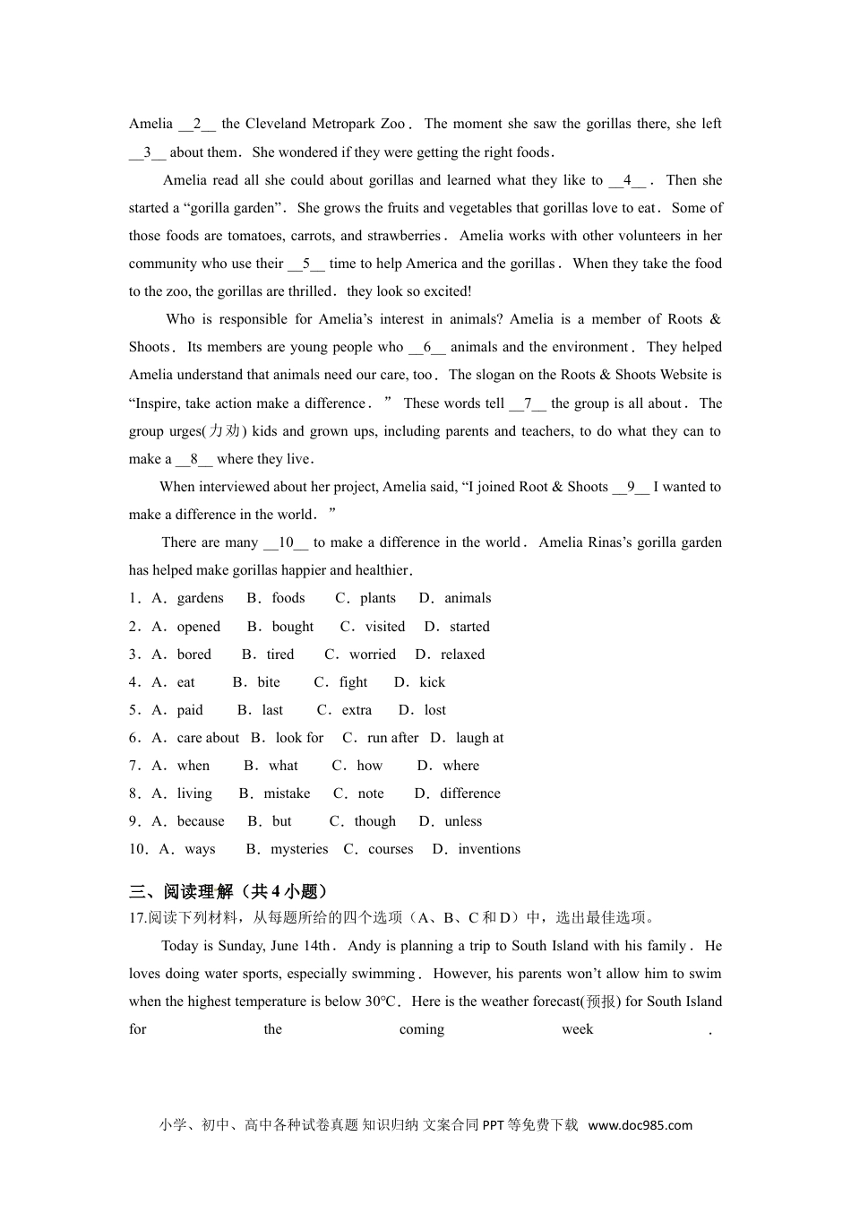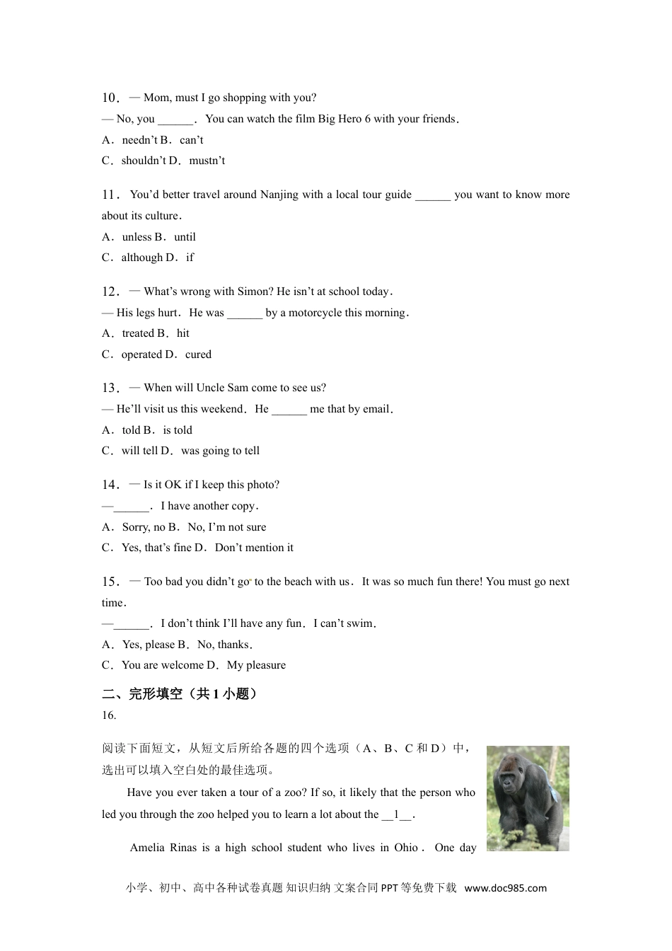 江苏省南京市2015年中考试题英语试卷一、单选题(共15小题)1.Inthepicture,thechairis______thetable.A.underB.onC.aboveD.beside2.Everyonemakesmistakesinhisorherlife.Theimportantthingisnottorepeat______.A.itB.themC.himD.her3.—Whydidn’tPeter______hishomework?—Hesaidhehadlosthisworkbook.Ithinkit’sanexcuse.A.doesB.doingC.doD.did4.PukouRailwayStation______in1911andithasbecomeafilminglocationforfilmsandTVplaysinrecentyears.A.buildB.isbuiltC.builtD.wasbuilt5.—Whatwouldyouliketodrink?—I’mverythirsty.______youcanget.Justgetitnow.A.AnythingB.SomethingC.NothingD.Otherthings6.Thiskindofplantis______seeninourcitybecauseitlives4500mabovesealevelandishardtofind.A.commonlyB.always[C.seldomD.easily7.Lisawasstillveryweakwhenshelefthospital.Butafteraweek’srest,shefeltmuch______andwentbacktoschool.A.goodB.betterC.badD.worse8.—IsawDavidintheteachers’officethismorning.Doyouknow______hewasthere?—Hewenttheretohandinhishomework.A.howB.whetherC.whenD.why9.It’simportantforustoprotectnaturebecausewe______itsrichresourcestolive.A.dependonB.leaveforC.giveupD.leadto小学、初中、高中各种试卷真题知识归纳文案合同PPT等免费下载www.doc985.com10.—Mom,mustIgoshoppingwithyou?—No,you______.YoucanwatchthefilmBigHero6withyourfriends.A.needn’tB.can’tC.shouldn’tD.mustn’t11.You’dbettertravelaroundNanjingwithalocaltourguide______youwanttoknowmoreaboutitsculture.A.unlessB.untilC.althoughD.if12.—What’swrongwithSimon?Heisn’tatschooltoday.—Hislegshurt.Hewas______byamotorcyclethismorning.A.treatedB.hitC.operatedD.cured13.—WhenwillUncleSamcometoseeus?—He’llvisitusthisweekend.He______methatbyemail.A.toldB.istoldC.willtellD.wasgoingtotell14.—IsitOKifIkeepthisphoto?—______.Ihaveanothercopy.A.Sorry,noB.No,I’mnotsureC.Yes,that’sfineD.Don’tmentionit15.—Toobadyoudidn’tgotothebeachwithus.Itwassomuchfunthere!Youmustgonexttime.—______.Idon’tthinkI’llhaveanyfun.Ican’tswim.A.Yes,pleaseB.No,thanks.C.YouarewelcomeD.Mypleasure二、完形填空(共1小题)16.阅读下面短文,从短文后所给各题的四个选项(A、B、C和D)中,选出可以填入空白处的最佳选项。Haveyouevertakenatourofazoo?Ifso,itlikelythatthepersonwholedyouthroughthezoohelpedyoutolearnalotaboutthe__1__.AmeliaRinasisahighschoolstudentwholivesinOhio.Oneday小学、初中、高中各种试卷真题知识归纳文案合同PPT等免费下载www.doc985.comAmelia__2__theClevelandMetroparkZoo.Themomentshesawthegorillasthere,sheleft__3__aboutthem.Shewonderediftheyweregettingtherightfoods.Ameliareadallshecouldaboutgorillasandlearnedwhattheyliketo__4__.Thenshestarteda“gorillagarden”.Shegrowsthefruitsandvegetablesthatgorillaslovetoeat.Someofthosefoodsaretomatoes,carrots,andstrawberries.Ameliaworkswithothervolunteersinhercommunitywhousetheir__5__timetohelpAmericaandthegorillas.Whentheytakethefoodtothezoo,thegorillasarethrilled.theylooksoexcited!WhoisresponsibleforAmelia’sinterestinanimals?AmeliaisamemberofRoots&Shoots.Itsmembersareyoungpeoplewho__6__animalsandtheenvironment.TheyhelpedAmeliaunderstandthatanimalsneedourcare,too.ThesloganontheRoots&ShootsWebsiteis“Inspire,takeactionmakeadifference.”Thesewordstell__7__thegroupisallabout.Thegroupurges(力劝)kidsandgrownups,includingparentsandteachers,todowhattheycantomakea__8__wheretheylive.Wheninterviewedaboutherproject,Ameliasaid,...