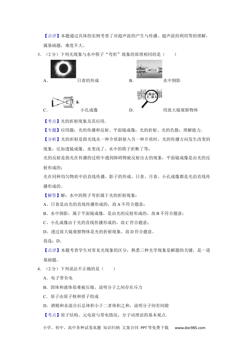 小学、初中、高中各种试卷真题知识归纳文案合同PPT等免费下载www.doc985.com2021年陕西省中考物理试卷(副卷)参考答案与试题解析一、选择题(共10小题,每小题2分,计20分.每小题只有一个选项是符合题意的)1.(2分)下列物质中通常情况下属于导体的是()A.橡胶B.木材C.铜D.塑料【考点】导体.【专题】电流和电路.【分析】常见的导体包括:人体、大地、各种金属、酸碱盐的溶液等。常见的绝缘体有陶瓷、玻璃、橡胶、油等;导体和绝缘体没有绝对的界限。【解答】解:通常情况下,橡胶、木材、塑料都属于绝缘体,铜是金属,属于导体。故选:C。【点评】此题考查了导体与绝缘体的概念以及生活中常见的实例;生活中哪些物体为导体,哪些物体为绝缘体,属于识记的内容,比较简单。2.(2分)有一种随身携带的“声波盒”,它利用47000Hz超声波使液体高频振动产生无数微小的气泡,再立即使其破裂,这个短暂的过程,会产生强烈冲击力,将物体表面的污渍、油脂撞击、剥离下来,达到高效清洁的目的。下列说法正确的是()A.超声波不是由物体振动产生的B.超声波只能在水中传播C.利用超声波清洗物品说明声波具有能量D.超声波和人耳可听到的声波在同种情况下传播的速度不同【考点】声与能量;声音的产生;声速;超声波与次声波.【专题】应用题;定性思想;应用能力.【分析】声音是由物体的振动产生的,声音的传播需要介质,超声波是指频率高于20000Hz的声音,声音能传递能量和信息,声音在不同介质中的传播速度不同,结合具体实例可做出判断。【解答】解:A、超声波也是由物体振动产生的,故A错误;B、超声波可以在固体、液体以及气体中传播,故B错误;C、利用超声波清洗物品说明声波具有能量,故C正确;D、超声波和人耳可听到的声波在同种情况下传播的速度相同,故D错误。故选:C。小学、初中、高中各种试卷真题知识归纳文案合同PPT等免费下载www.doc985.com【点评】本题通过具体的实例考查了对超声波的产生与传播、超声波的利用等的理解,属基础题,难度不大。3.(2分)下列光现象与水中筷子“弯折”现象的原理相同的是()A.日食的形成B.水中倒影C.小孔成像D.用放大镜观察物体【考点】光的折射现象及其应用.【专题】应用题;光的传播和反射、平面镜成像;光的折射、光的色散;理解能力.【分析】光的折射是指光线从一种介质斜射入另一种介质时,光的传播方向发生改变的现象,比如透镜成像、水变浅了、水中的筷子折断了等;光的反射是指光在传播的过程中遇到障碍物被反射出去的现象,平面镜成像是由光的反射形成的;光在同种均匀物质中沿直线传播,影子的形成、日食、月食、小孔成像都是光沿直线传播形成的。【解答】解:水中的筷子弯折属于光的折射现象;A、日食是由光的直线传播形成的,故A不符合题意;B、水中倒影,属于平面镜成像,是由光的反射形成的,故B不符合题意;C、小孔成像由于光的直线传播形成的,故C符合题意;D、透过放大镜观察物体是光的折射现象,故D符合题意。故选:D。【点评】本题考查学生对常见光现象的区分,熟悉三种光学现象是解题的关键,是一道基础题。4.(2分)下列说法不正确的是()A.电子带负电B.固体和液体很难被压缩,说明分子之间存在斥力C.原子由原子核和质子组成D.酒精和水混合后总体积小于二者体积之和,说明分子间有间隙【考点】原子结构、元电荷与带电情况;分子动理论的基本观点.小学、初中、高中各种试卷真题知识归纳文案合同PPT等免费下载www.doc985.com【专题】应用题;分子热运动、内能;应用能力.【分析】(1)原子由原子核和核外电子组成,原子核带正电,而电子带负电;(2)分子之间存在相互作用的引力和斥力;分子之间有间隙。【解答】解:A、电子带负电,故A正确;B、固体和液体很难被压缩,说明分子之间存在斥力,故B正确;C、原子由原子核和核外电子组成,故C错误;D、酒精和水混合后总体积小于二者体积之和,说明分子间有间隙,故D正确。故选:C。【点评】本题主要考查了分子动理论的相关知识点,是一道基础题。5.(2分)有关体育运动项目中涉及到的物理知识,说法正确的是()A.游泳时使人前进的力是手向后...