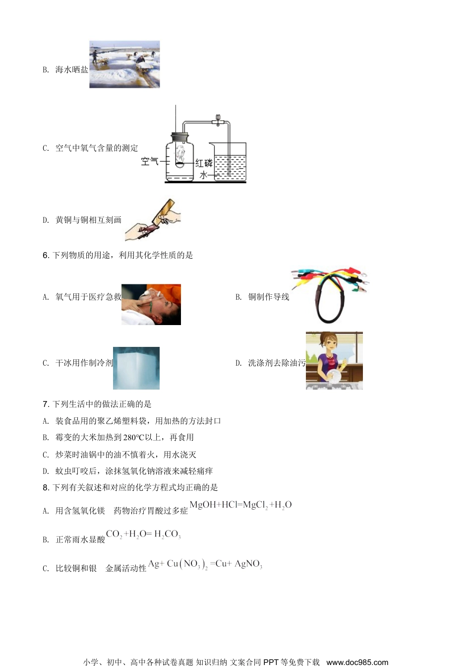 哈尔滨市2021年初中升学考试综合试卷考生须知:1.本试卷满分为140分,考试时间为120分钟。2.答题前,考生先将自己的“姓名”、“考号”、“考场”、“座位号”书写(填涂)在答题卡正面和背面的规定位置,将“条形码”准确粘贴在条形码区城处。3.请按照题号顺序在答题卡各题目的答题区域内作答,超出答题区域书写的答案无效;在草稿纸、试题纸上答题无效。4.选择题必须使用2B铅笔填涂;非选择题必须使用0.5毫米黑色字迹的签字笔书写,字体工整、笔迹清楚。5.保持卡面整洁,不要折叠、不要弄脏、不要弄皱,不准使用涂改液、修正带、刮纸刀。可能用到的相对原子质量:H-1O-16S-32Fe-56Cu-64一、选择题(1-27小题,每小题2分,共54分,每小题只有一个正确答案)1.“建党百年,龙江巨变!”品味与时尚并存的哈尔滨也一直行走在打造幸福的路上,在不断的发展中散发着迷人的魅力。结合图示及文字判断下列有关叙述错误的是A.氮气填充霓虹灯B.新能源汽车C.化学建筑材料小学、初中、高中各种试卷真题知识归纳文案合同PPT等免费下载www.doc985.comD.地铁的正常运行2.下列原子所属元素位于元素周期表第一周期的是A.B.C.D.3.下列实验操作正确的是A.过滤液体B.浓硫酸的稀释C.液体的倾倒D.液体的量取4.下列对实验现象的部分描述错误的是A.灼烧羊毛:闻到一股烧毛发的焦糊味B.铁丝在氧气中燃烧:产生浓厚白烟C.向稀盐酸中加入氧化铁:溶液由无色变成黄色D.用玻璃棒蘸取浓硫酸在白纸上写字:纸上显出黑色字迹5.下列过程中发生化学变化的是A.大理石做华表小学、初中、高中各种试卷真题知识归纳文案合同PPT等免费下载www.doc985.comB.海水晒盐C.空气中氧气含量的测定D.黄铜与铜相互刻画6.下列物质的用途,利用其化学性质的是A.氧气用于医疗急救B.铜制作导线C.干冰用作制冷剂D.洗涤剂去除油污7.下列生活中的做法正确的是A.装食品用的聚乙烯塑料袋,用加热的方法封口B.霉变的大米加热到280℃以上,再食用C.炒菜时油锅中的油不慎着火,用水浇灭D.蚊虫叮咬后,涂抹氢氧化钠溶液来减轻痛痒8.下列有关叙述和对应的化学方程式均正确的是A.用含氢氧化镁的药物治疗胃酸过多症B.正常雨水显酸C.比较铜和银的金属活动性小学、初中、高中各种试卷真题知识归纳文案合同PPT等免费下载www.doc985.comD.乙醇燃烧9.“关爱生命、拥抱健康”是永恒的主题。下列叙述错误的是A.健康人体内胃液的pH范围在0.9-1.5B.老年人缺钙会患佝偻病C.缺乏维生素A会引起夜盲症D.利用活性炭来吸附装修产生的对人体有害的气体10.对下列事实的微观解释错误的是选项事实解释A氧气和二氧化碳化学性质不同分子构成不同B丁香花开,香满冰城分子在不断的运动C氧气加压液化可以装入钢瓶中加压后,分子变小D蔗糖溶液不导电溶液中没有自由移动的带电粒子A.AB.BC.CD.D11.下列关于资源、能源的叙述错误的是A.空气是人类生产活动的重要资源B.燃料充分燃烧,对于节约能源非常重要C.因为海水淡化已经广泛使用,所以不用担心淡水资源短缺D.废旧电池的回收,不仅可以节约金属资源,还可以减少对环境的污染12.区分下列各组物质的方法正确的是选项需区分的物质方法A硝酸铵和硝酸钾加水搅拌,看是否溶解B空气和呼出气体分别滴入等量的澄清石灰水,振荡,观察现象C硬水和软水尝味道D二氧化锰粉末和木炭粉观察颜色A.AB.BC.CD.D13.如图是甲、乙两种固体物质(均不含结晶水)的溶解度曲线,结合图示判断,下列说法正确的是小学、初中、高中各种试卷真题知识归纳文案合同PPT等免费下载www.doc985.comA.甲的溶解度大于乙的溶解度B.乙中混有少量甲,用冷却热的饱和溶液的方法提纯乙C.t1℃时,甲、乙饱和溶液中溶质的质量分数相等D.t2℃时,甲、乙溶液中所含溶质的质量一定相等14.除去下列物质中的少量杂质,所用试剂和操作方法都正确的是选项物质少量杂质所用试剂和操作方法AN2CO通过灼热的CuOBNaClNa2SO4加入Ba(NO3)2溶液CMnO2KCl加入足量水溶解,过滤、洗涤、干燥DAlCl3MgCl2加入AgNO3溶液,过滤A.AB.BC.CD.D15.实验室为测定铁和铜的固体混合物中铜的质量分数,取11.2g该混合物,向其中加入足量的硫酸铜溶液,充分反应后过滤、洗涤,将不溶性固体在空气中加热,待其...