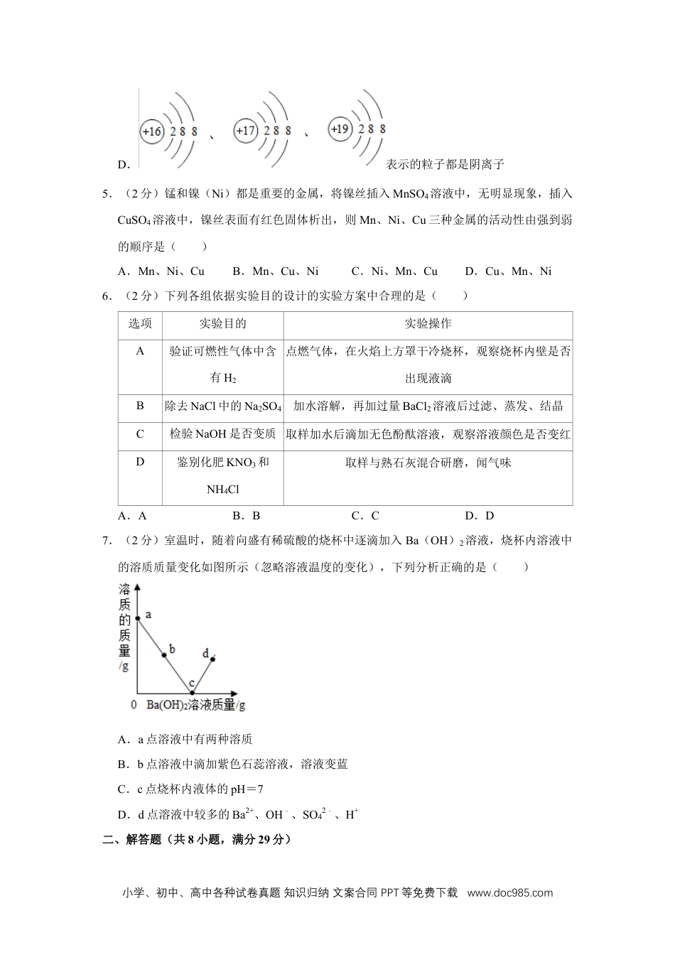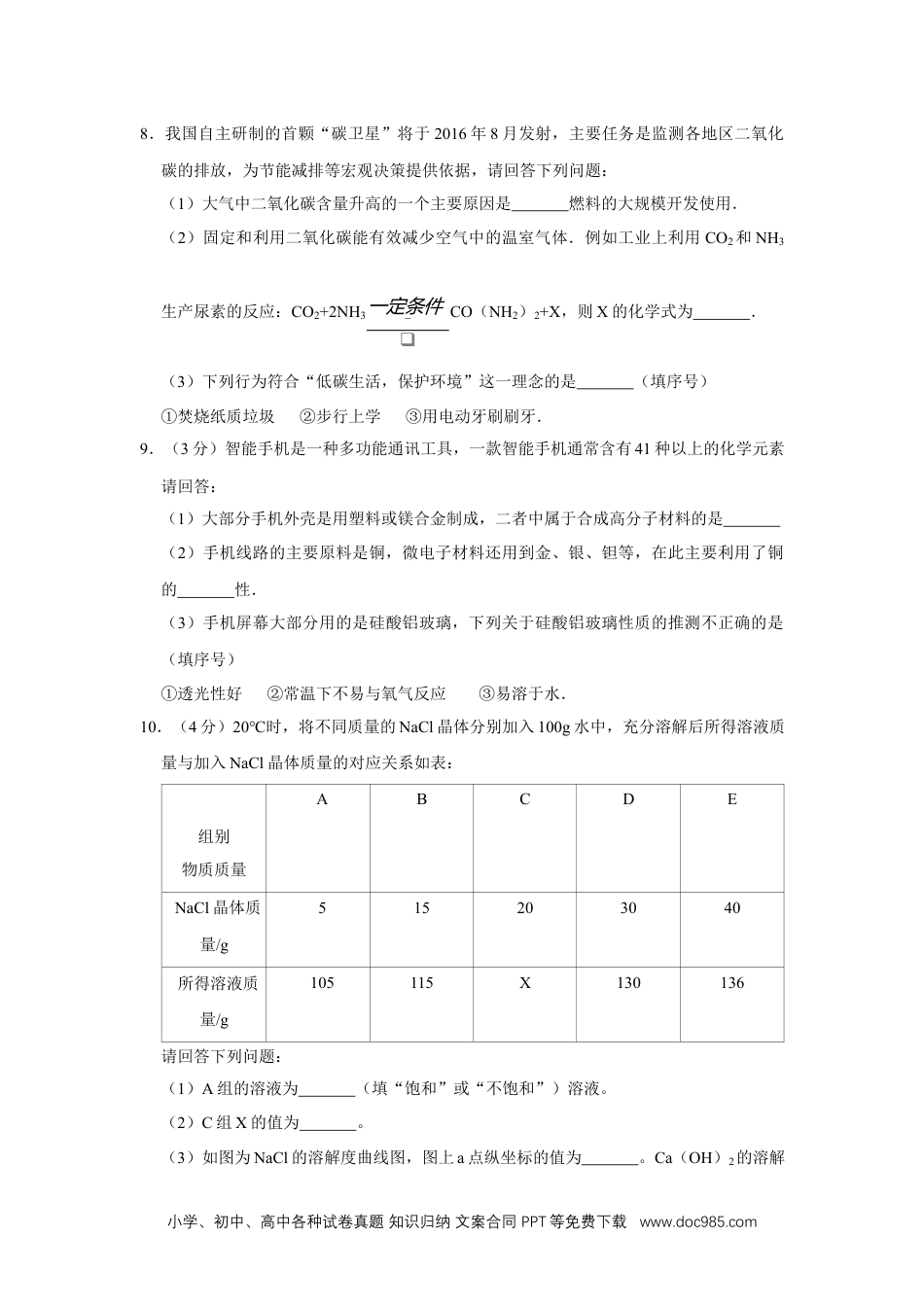 小学、初中、高中各种试卷真题知识归纳文案合同PPT等免费下载www.doc985.com2016年陕西省中考化学试卷一、选择题(共7小题,每小题2分,满分14分)1.(2分)化学在工农业生产、科技发展和社会生活中发挥着重要作用,下列说法不正确的是()A.用铝合金制飞机外壳是因其硬度大、密度小、耐腐蚀B.无土栽培的营养液中常含的K2SO4是一种复合肥C.发射火箭采用的液氢、液氧都是无污染的纯净物D.生活中常用加热煮沸的方法降低水的硬度2.(2分)规范操作是实验成功的保证,下列实验操作正确的是()A.加大理石B.取烧碱C.称粗盐的质量D.量水的体积3.(2分)对比分析不同物质的共性与差异性是学习化学的有效方法,下列关于CO2和CO的各项对比,有错误的是()选项共性差异性A均由分子构成分子的种类不同B均由碳元素和氧元素组成元素的质量比不同C均能与水化合化合时现象不同D常温下均是无色气体相同条件下气体的密度不同A.AB.BC.CD.D4.(2分)正确使用和理解化学用语是重要的学科素养,下列说法正确的是()A.H2O、H2CO3中均含有氢分子B.KClO3、KCl中氯元素的化合价不相同C.Na+、Mg2+、Al3+原子核内质子数均为10小学、初中、高中各种试卷真题知识归纳文案合同PPT等免费下载www.doc985.comD.表示的粒子都是阴离子5.(2分)锰和镍(Ni)都是重要的金属,将镍丝插入MnSO4溶液中,无明显现象,插入CuSO4溶液中,镍丝表面有红色固体析出,则Mn、Ni、Cu三种金属的活动性由强到弱的顺序是()A.Mn、Ni、CuB.Mn、Cu、NiC.Ni、Mn、CuD.Cu、Mn、Ni6.(2分)下列各组依据实验目的设计的实验方案中合理的是()选项实验目的实验操作A验证可燃性气体中含有H2点燃气体,在火焰上方罩干冷烧杯,观察烧杯内壁是否出现液滴B除去NaCl中的Na2SO4加水溶解,再加过量BaCl2溶液后过滤、蒸发、结晶C检验NaOH是否变质取样加水后滴加无色酚酞溶液,观察溶液颜色是否变红D鉴别化肥KNO3和NH4Cl取样与熟石灰混合研磨,闻气味A.AB.BC.CD.D7.(2分)室温时,随着向盛有稀硫酸的烧杯中逐滴加入Ba(OH)2溶液,烧杯内溶液中的溶质质量变化如图所示(忽略溶液温度的变化),下列分析正确的是()A.a点溶液中有两种溶质B.b点溶液中滴加紫色石蕊溶液,溶液变蓝C.c点烧杯内液体的pH=7D.d点溶液中较多的Ba2+、OH﹣、SO42﹣、H+二、解答题(共8小题,满分29分)小学、初中、高中各种试卷真题知识归纳文案合同PPT等免费下载www.doc985.com8.我国自主研制的首颗“碳卫星”将于2016年8月发射,主要任务是监测各地区二氧化碳的排放,为节能减排等宏观决策提供依据,请回答下列问题:(1)大气中二氧化碳含量升高的一个主要原因是燃料的大规模开发使用.(2)固定和利用二氧化碳能有效减少空气中的温室气体.例如工业上利用CO2和NH3生产尿素的反应:CO2+2NH3一定条件¯❑CO(NH2)2+X,则X的化学式为.(3)下列行为符合“低碳生活,保护环境”这一理念的是(填序号)①焚烧纸质垃圾②步行上学③用电动牙刷刷牙.9.(3分)智能手机是一种多功能通讯工具,一款智能手机通常含有41种以上的化学元素请回答:(1)大部分手机外壳是用塑料或镁合金制成,二者中属于合成高分子材料的是(2)手机线路的主要原料是铜,微电子材料还用到金、银、钽等,在此主要利用了铜的性.(3)手机屏幕大部分用的是硅酸铝玻璃,下列关于硅酸铝玻璃性质的推测不正确的是(填序号)①透光性好②常温下不易与氧气反应③易溶于水.10.(4分)20℃时,将不同质量的NaCl晶体分别加入100g水中,充分溶解后所得溶液质量与加入NaCl晶体质量的对应关系如表:组别物质质量ABCDENaCl晶体质量/g515203040所得溶液质量/g105115X130136请回答下列问题:(1)A组的溶液为(填“饱和”或“不饱和”)溶液。(2)C组X的值为。(3)如图为NaCl的溶解度曲线图,图上a点纵坐标的值为。Ca(OH)2的溶解小学、初中、高中各种试卷真题知识归纳文案合同PPT等免费下载www.doc985.com度温度变化的趋势与NaCl相反,则室温时,向饱和石灰水加入少量生石灰,并恢复到室温,此时溶液中溶质的质量(填“>”、“<”或“=”)原溶液中溶质的质量。11.(5...