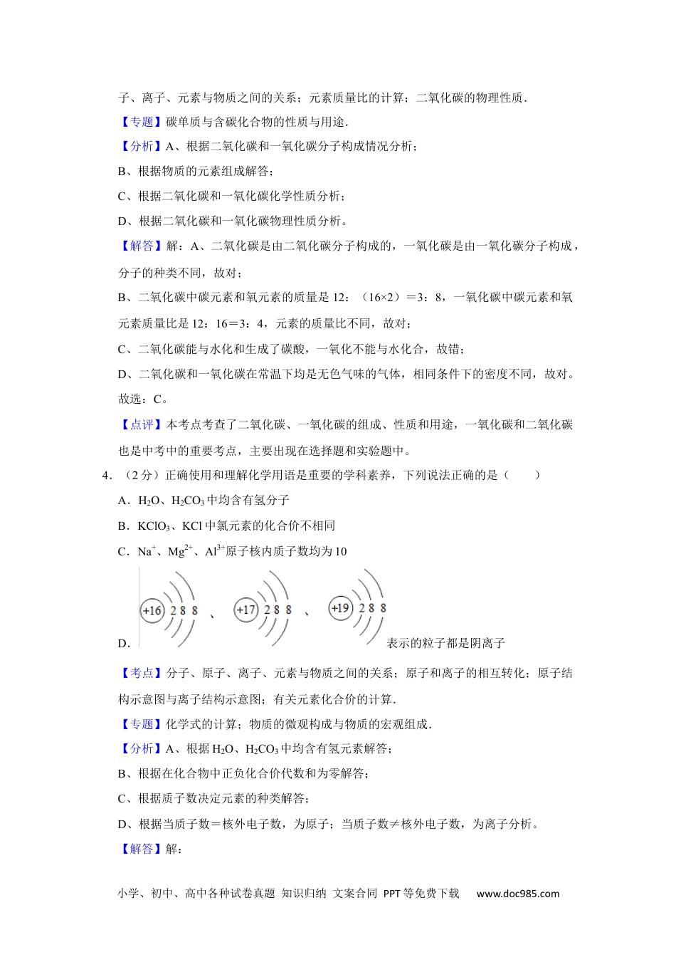 小学、初中、高中各种试卷真题知识归纳文案合同PPT等免费下载www.doc985.com2016年陕西省中考化学试卷参考答案与试题解析一、选择题(共7小题,每小题2分,满分14分)1.(2分)化学在工农业生产、科技发展和社会生活中发挥着重要作用,下列说法不正确的是()A.用铝合金制飞机外壳是因其硬度大、密度小、耐腐蚀B.无土栽培的营养液中常含的K2SO4是一种复合肥C.发射火箭采用的液氢、液氧都是无污染的纯净物D.生活中常用加热煮沸的方法降低水的硬度【考点】合金与合金的性质;常见化肥的种类和作用;纯净物和混合物的判别;硬水与软水.【专题】物质的分类;空气与水;金属与金属材料;常见的盐化学肥料.【分析】A、根据合金的性质解答;B、根据肥料的类别解答;C、根据物质的类别解答;D、根据降低水的硬度的方法解答.【解答】解:A、用铝合金制飞机外壳是因其硬度大、密度小、耐腐蚀,正确;B、K2SO4是一种钾肥,错误;C、发射火箭采用的液氢、液氧都是无污染的纯净物,正确;D、生活中常用加热煮沸的方法降低水的硬度,正确;故选:B。【点评】本题考查的是化学与生活的知识,完成此题,可以依据已有的知识进行.2.(2分)规范操作是实验成功的保证,下列实验操作正确的是()A.加大理石B.取烧碱小学、初中、高中各种试卷真题知识归纳文案合同PPT等免费下载www.doc985.comC.称粗盐的质量D.量水的体积【考点】固体药品的取用;测量容器﹣量筒;称量器﹣托盘天平.【专题】常见仪器及化学实验基本操作.【分析】A、取用块状药品或金属颗粒时可以用药匙,或者用镊子夹取.操作要领是:“一横、二放、三慢竖”;B、根据固体药品取用时:取下瓶塞倒放在实验台上进行分析;C、根据托盘天平的使用要遵循“左物右码”的原则进行分析判断;D、根据量筒读数时视线要与凹液面的最低处保持水平进行分析判断.【解答】解:A、取用固体药品时可以用药匙,或者用镊子夹取。具体的操作是:先把容器横放,把块状药品或金属颗粒放入容器口,再把容器慢慢的竖立起来,使药品滑落到试管底部,以免打破容器。故错误;B、固体药品取用时,瓶塞取下后要倒放在试验台上,所以图中操作错误,故错误;C、托盘天平的使用要遵循“左物右码”的原则,图中所示操作砝码与药品位置放反了,图中所示操作错误;D、量取液体时,视线与液体的凹液面最低处保持水平,操作正确。故选:D。【点评】掌握量筒的正确读数方法,就能轻松解答题目.熟悉常见仪器的使用方法与注意事项,掌握化学实验基本操作是解答此类题目的关键.3.(2分)对比分析不同物质的共性与差异性是学习化学的有效方法,下列关于CO2和CO的各项对比,有错误的是()选项共性差异性A均由分子构成分子的种类不同B均由碳元素和氧元素组成元素的质量比不同C均能与水化合化合时现象不同D常温下均是无色气体相同条件下气体的密度不同A.AB.BC.CD.D【考点】二氧化碳的化学性质;一氧化碳的物理性质;一氧化碳的化学性质;分子、原小学、初中、高中各种试卷真题知识归纳文案合同PPT等免费下载www.doc985.com子、离子、元素与物质之间的关系;元素质量比的计算;二氧化碳的物理性质.【专题】碳单质与含碳化合物的性质与用途.【分析】A、根据二氧化碳和一氧化碳分子构成情况分析;B、根据物质的元素组成解答;C、根据二氧化碳和一氧化碳化学性质分析;D、根据二氧化碳和一氧化碳物理性质分析。【解答】解:A、二氧化碳是由二氧化碳分子构成的,一氧化碳是由一氧化碳分子构成,分子的种类不同,故对;B、二氧化碳中碳元素和氧元素的质量是12:(16×2)=3:8,一氧化碳中碳元素和氧元素质量比是12:16=3:4,元素的质量比不同,故对;C、二氧化碳能与水化和生成了碳酸,一氧化不能与水化合,故错;D、二氧化碳和一氧化碳在常温下均是无色气味的气体,相同条件下的密度不同,故对。故选:C。【点评】本考点考查了二氧化碳、一氧化碳的组成、性质和用途,一氧化碳和二氧化碳也是中考中的重要考点,主要出现在选择题和实验题中。4.(2分)正确使用和理解化学用语是重要的学科素养,下列说法正确的是()A.H2O、H2CO3中均含有氢分子B.KClO3、KCl...