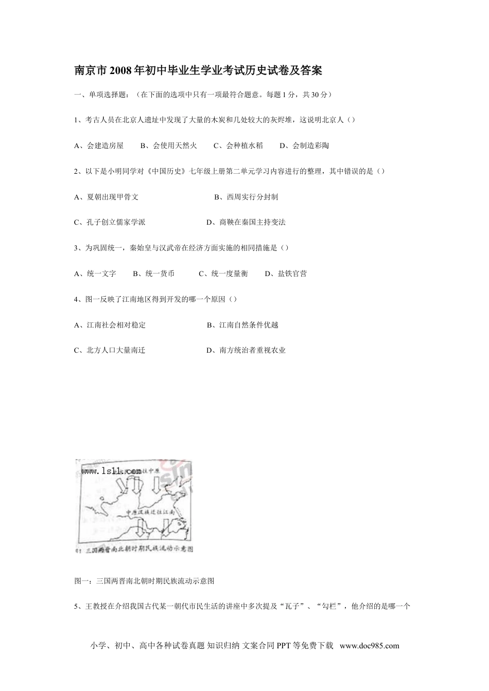 南京市2008年初中毕业生学业考试历史试卷及答案一、单项选择题:(在下面的选项中只有一项最符合题意。每题1分,共30分)1、考古人员在北京人遗址中发现了大量的木炭和几处较大的灰烬堆,这说明北京人()A、会建造房屋B、会使用天然火C、会种植水稻D、会制造彩陶2、以下是小明同学对《中国历史》七年级上册第二单元学习内容进行的整理,其中错误的是()A、夏朝出现甲骨文B、西周实行分封制C、孔子创立儒家学派D、商鞅在秦国主持变法3、为巩固统一,秦始皇与汉武帝在经济方面实施的相同措施是()A、统一文字B、统一货币C、统一度量衡D、盐铁官营4、图一反映了江南地区得到开发的哪一个原因()A、江南社会相对稳定B、江南自然条件优越C、北方人口大量南迁D、南方统治者重视农业图一:三国两晋南北朝时期民族流动示意图5、王教授在介绍我国古代某一朝代市民生活的讲座中多次提及“瓦子”、“勾栏”,他介绍的是哪一个小学、初中、高中各种试卷真题知识归纳文案合同PPT等免费下载www.doc985.com朝代的生活()A、秦朝B、汉朝C、唐朝D、宋朝6、下列清朝巩固统一多民族国家的措施中,搭配正确的是()A、顺治帝----平定大小和卓叛乱B、康熙帝-------赐予“班禅额尔德尼”称号C、雍正帝------赐予“达赖喇嘛”封号D、乾隆帝--------组织雅克萨之战抗击沙俄7、下列著作中,介绍我国古代农业生产技术的是()A、<九章算术>B、《水经注》C、《齐民要术》D、《本草纲目》8、马克思说:“俄国不花费一分钱,不出动一兵一卒,而能比任何一个参战国(从中国)获取更多的好处”这句话指的是俄国在第二次鸦片战争中()A、取得约定关税特权B、掠得圆明园大量珍宝C、获取中国大量赔款D、割占中国大片领土9、洋务派认为“自强以练兵为要,练兵又以制器为先”。洋务运动的内容中能体现“制器为先”的是()A、创办军事工业B、创办民用工业C、兴办新式学堂D、派遣学生出国10、“国内专电:免曹(汝霖)令以下”此电文反映了1919年那一个运动取得初步成果A、戊戌变法运动B、新文化运动C、五四运动D、国民革命运动11.1945年8月,《新华日报》的一篇社论中写道:“八年间的死亡惨烈,苦难艰辛。在今天这一天获得了报酬了……接受了你们无条件投降。”材料中的“这一天”是A.8月5日B.8月10日C.8月12日D.8月15日12.他主持设计修建了中国第一条铁路干线,他是A.李四光B.詹天佑C.候德榜D.邓稼先13.某班播演历史话剧《上甘岭》,小刚在剧中扮演舍身堵枪眼的志愿军战士。他扮演的是小学、初中、高中各种试卷真题知识归纳文案合同PPT等免费下载www.doc985.comA.彭德怀B.邱少云C.黄继光D.罗盛教近代以来,中国为实现工业化进行了不懈的探索.据此回答第14——15题14.图二反映了第一次世界大战期间中国民族工业发展的哪一特点A.轻工业发展迅速,重工业发展缓慢B.沿海地区发展快于内地C.总体发展比较落后D.资金少,规模小15.为改变下表中我国工业落后状况,中国第一个五年计划集中主要力量发展项目中国(1952年产量)印度(1950年产量)美国(1950年产量)钢产量(人均)2.37千克4千克638.3千克发电量(人均)2.76千瓦时10.9千瓦时2949千瓦时A.农业B.轻工业C.重工业D.商业16.改革开放新时期,下列城市中属于经济特区的有①深圳②汕头③香港④澳门小学、初中、高中各种试卷真题知识归纳文案合同PPT等免费下载www.doc985.comA.①②B.①③C.①④D.②④17.联合国安理会召开常任理事国会议,成员国中的出现我中华人民共和国应始于A.1949年B.1954年C.1971年D.1978年18.改革开放后我国社会保障体系初步完善.图3反映了社会保障体系中哪一方面的内容A.教育保障B.C.失业保险D.医疗保障19.模仿与创新相结合是日本民族的一大特色,以下能体现这一特色的是A、《汉谟拉比法典》B、大化改新C.奴隶制民主政治D.种姓制度大国兴衰更替的故事,留下了各具特色的发展道路和经验教训,启迪着今天也影响着未来.据此回答第20-22题20.1789年7月14日,法国国王路易十六在日记中写下"今日无事",他认为无事的这一天却成为改写法国...