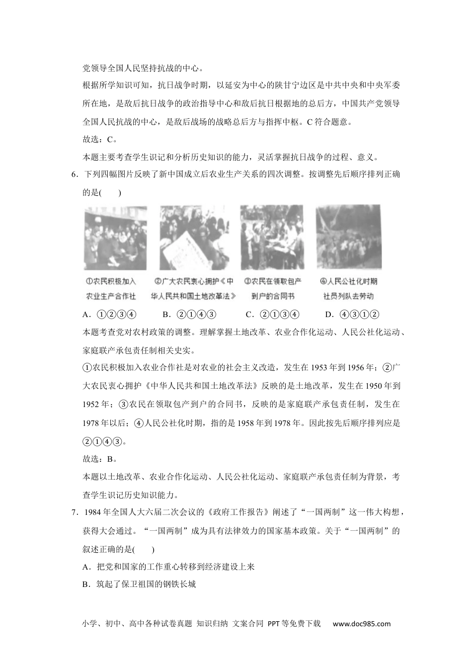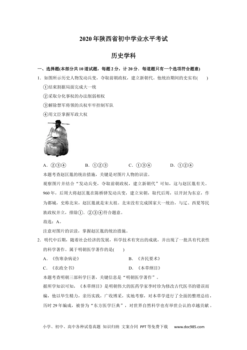 小学、初中、高中各种试卷真题知识归纳文案合同PPT等免费下载www.doc985.com2020年陕西省初中学业水平考试历史学科一、选择题(本部分共10道试题,每题2分,计20分.每道题只有一个选项符合题意)1.如图所示历史人物发动兵变,夺取前朝政权,建立新朝代。他统治期间的史实有()①结束割据局面完成大一统②采取分化事权的办法削弱相权③解除禁军将领的兵权牢牢控制军队④用文臣掌握军政大权A.②③④B.①②③C.①③④D.①②④本题考查赵匡胤的统治措施,关键是对图片人物的识读。观察图片并结合“发动兵变,夺取前朝政权,建立新朝代”可知,这与赵匡胤有关。960年,后周大将赵匡胤在陈桥驿发动兵变,建立宋朝,取代后周,以开封为东京,作为都城,史称北宋,赵匡胤就是宋太祖。北宋没有完成国家大一统治,与辽、西夏等民族政权并立,排除①.②③④符合题意。故选:A。注意对图片的识读,掌握赵匡胤的统治措施。2.明代中后期,随着社会经济的发展,科学技术有突出的成就,并出现了一批具有代表性的科学著作。属于明朝医学著作的是()A.《伤寒杂病论》B.《齐民要术》C.《农政全书》D.《本草纲目》本题考查明朝三部科学巨著,关键信息是“明朝医学著作”。据所学知识可知,《本草纲目》是明朝伟大的医药学家李时珍为修改古代医书的错误而编,他以毕生精力,亲历实践,广收博采,实地考察,对本草学进行了全面的整理总结,历时29年编成,被誉为“东方医学巨典”,对世界自然科学也有举世公认的卓越贡献。小学、初中、高中各种试卷真题知识归纳文案合同PPT等免费下载www.doc985.com被译成多国文字,是中国也是世界医学史上的宝贵遗产。故选:D。本题考查学生再现历史知识的能力。建议学生综合梳理明朝三部科技著作的相关知识。3.从1915年开始,一场新文化运动在中华大地上应运而生。这场运动的口号是()A.自强求富B.君主立宪C.民主科学D.实业救国本题主要考查新文化运动的口号,1915年的新文化运动以民主和科学为口号,促进人们思想的大解放。通过题干分析,“1915”、“一场新文化运动在中华大地上应运而生”,可知这是新文化运动,该运动的口号是民主科学,故C符合题意。A自强求富,洋务运动。B君主立宪,戊戌变法。D实业救国,近代民族资本主义。故选:C。本题主要考查学生对新文化运动这一基础知识的识记情况,题目简单。4.在新民主主义革命和社会主义建设时期,中国共产党召开多次会议。下列表述属于“八七会议”的是()A.在中国历史上第一次提出了彻底的反帝反封建的民主革命纲领B.通过了土地革命和武装反抗国民党反动统治的总方针C.指出我国的主要任务是尽快地从落后的农业国变为先进的工业国D.“三个代表”重要思想被确立为中国共产党的指导思想本题主要考查八七会议的内容的相关史实。八七会议是中国革命由国民革命失败到土地革命战争兴起的转折点。1927年8月7日,中共中央在汉口召开紧急会议,即“八七会议”,通过了土地革命和武装反抗国民党反动统治的总方针,决定在秋收时节发动武装起义。在会上,毛泽东提出了“政权是由枪杆子中取得”的著名论断。选项A是中共二大的内容,选项C是中共八大的内容,选项D是中共十六大的内容。选项B符合题意。故选:B。本题主要考查综合运用所学知识进行判断分析的能力。理解并识记八七会议的内容的相关史实。5.抗日战争时期,敌后战场的战略总后方与指挥中枢是()A.瑞金B.会宁C.延安D.西柏坡本题主要考查抗日战争时期,红军长征结束后,中共中央进驻延安,延安成为中国共产小学、初中、高中各种试卷真题知识归纳文案合同PPT等免费下载www.doc985.com党领导全国人民坚持抗战的中心。根据所学知识可知,抗日战争时期,以延安为中心的陕甘宁边区是中共中央和中央军委所在地,是敌后抗日战争的政治指导中心和敌后抗日根据地的总后方,中国共产党领导全国人民抗战的中心,是敌后战场的战略总后方与指挥中枢。C符合题意。故选:C。本题主要考查学生识记和分析历史知识的能力,灵活掌握抗日战争的过程、意义。6.下列四幅图片反映了新中国成立后农业生产关系的四次调整。按调整先后顺序排列正确的是()A.①②③④B.②①④③C....