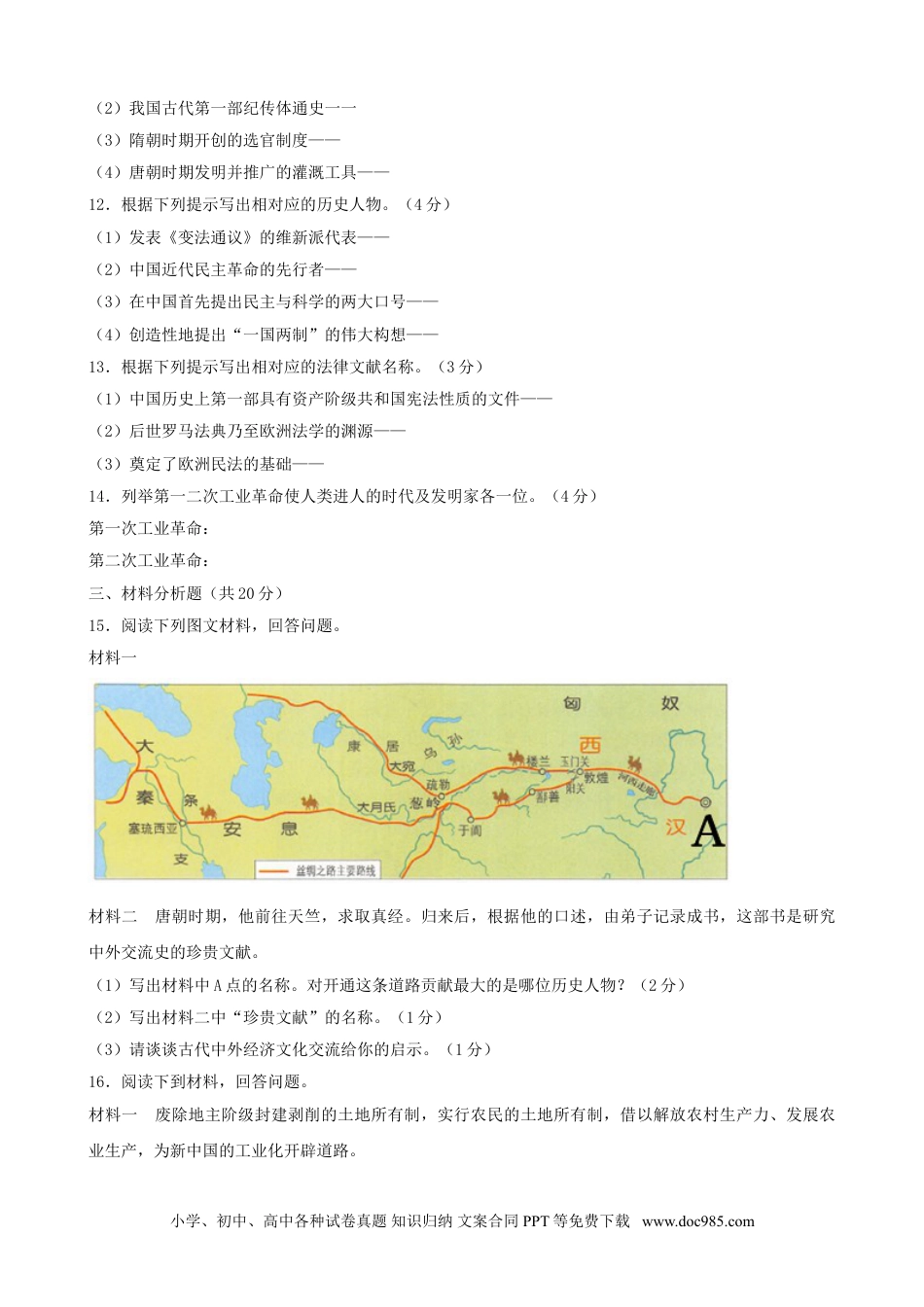 2019年吉林省中考历史试题一、单项选择题(每小题1分,共10分)1.西汉初期,政治清明,经济发展的统治局面历史上称为()A.“文景之治”B.“光武中兴”C.“贞观之治”D.“开元盛世”2.唐朝的国势由盛转衰的标志性事件是()A.陈胜、吴广起义B.黄巾起义C.安史之乱D.黄巢起义3.中国近代史上第一个丧权辱国的不平等条约是()A.《南京条约》B.《北京条约》C.《马关条约》D.《辛丑条约》4.解放战争时期,使华北全境基本解放的战役是()A.挺进大别山B.辽沈战役C.淮海战役D.平津战役5.中国共产党领导中国人民实现民族解放和独立自主的标志是()A.南京解放B.中华人民共和国成立C.第一届全国人民代表大会召开D.香港回归祖国6.由周恩来首次提出并成为处理国与国之间关系的基本准则是()A.独立自主的和平外交政策B.和平共处五项原则C.“求同存异”的方针D.不结盟的对外政策7.世界各族人民共同创造了人类光辉灿烂的文化。与右图呈现内容相关的文化成就是()A.“儒略历”B.《医学集成》C.阿拉伯数字D.《天方夜谭》8.世界开始连为一个整体,世界的观念也从此逐步确立起来的事件是()A.亚历山大东征B.基督教的兴起和传播C.文艺复兴D.新航路开辟9.进化论在科学上的影响是深远的。达尔文提出进化论观点的著作是()A.《自然哲学的数学原理》B.《物种起源》C.《复话》D.《向日葵》10.罗斯福新政期间,为加强对工业的计划指导而颁布的法律文献是()A.《全国工业复兴法》B.《社会保障法》C.《紧急银行法案》D.《国策基准》二、归纳列举题(共15分)11.根据下列提示写出相对应的成就。(4分)(1)秦朝时期修筑的举世闻名的防御工程——小学、初中、高中各种试卷真题知识归纳文案合同PPT等免费下载www.doc985.com(2)我国古代第一部纪传体通史一一(3)隋朝时期开创的选官制度——(4)唐朝时期发明并推广的灌溉工具——12.根据下列提示写出相对应的历史人物。(4分)(1)发表《变法通议》的维新派代表——(2)中国近代民主革命的先行者——(3)在中国首先提出民主与科学的两大口号——(4)创造性地提出“一国两制”的伟大构想——13.根据下列提示写出相对应的法律文献名称。(3分)(1)中国历史上第一部具有资产阶级共和国宪法性质的文件——(2)后世罗马法典乃至欧洲法学的渊源——(3)奠定了欧洲民法的基础——14.列举第一二次工业革命使人类进人的时代及发明家各一位。(4分)第一次工业革命:第二次工业革命:三、材料分析题(共20分)15.阅读下列图文材料,回答问题。材料一材料二唐朝时期,他前往天竺,求取真经。归来后,根据他的口述,由弟子记录成书,这部书是研究中外交流史的珍贵文献。(1)写出材料中A点的名称。对开通这条道路贡献最大的是哪位历史人物?(2分)(2)写出材料二中“珍贵文献”的名称。(1分)(3)请谈谈古代中外经济文化交流给你的启示。(1分)16.阅读下到材料,回答问题。材料一废除地主阶级封建剥削的土地所有制,实行农民的土地所有制,借以解放农村生产力、发展农业生产,为新中国的工业化开辟道路。小学、初中、高中各种试卷真题知识归纳文案合同PPT等免费下载www.doc985.com材料二到1956年底,我国实现了生产资料私有制向社会主义公有制的转变,社会主义基本制度在中国建立起来,我国开始了全面的大规模的社会主义建设。材料三会议作出了把党和国家的工作中心转移到经济建设上来,实行改革开放的历史性决策。(1)材料描述的是什么事件?为实现“新中国的工业化”,我国编制了什么国民经济发展计划?(2分)(2)材料二中“社会主义基本制度在中国建立起来”的标志是什么?写出一位在“全面的大规模的社会主义建设”过程中涌现出的英雄模范人物。(2分)(3)材料三是哪次会议的内容?我国对内改革在农村实行的土地政策是什么?写出首批对外开放的经济特区,一例即可。(3分)(4)请为你的家乡经济发展提一条合理化建议。(1分)17.阅读下列材料,回答问题。材料一:英国资产阶级革命揭开了欧洲和北美资产阶级革命运动的序幕,推动了世界历史发展的进程。材料二:马克思主义诞生后,无...