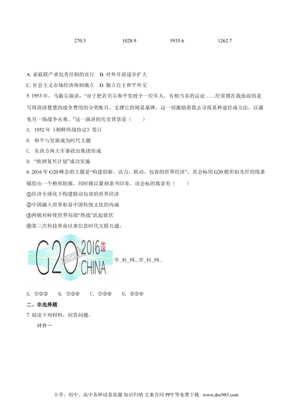 【精编word版】2017年中考真题精品解析历史(陕西省)(解析版)一、选择题1.与看见新科进士感叹“天下英雄入吾毅中矣”和鉴真第六次东渡成功这两件事有关的统治者分别是()A.唐高祖和唐玄宗B.唐太宗和武则天C.唐太宗和唐玄宗D.武则天和唐玄宗2.下面是1895年美国《PUCK》杂志上刊登的一幅漫画。漫画中一只全副武装、手拿军刀的日本鸡破中日战争的蛋壳而出,脚下踩着清政府的龙旗。此漫画所反映的历史事件使()A.中国地主阶级开始近代化的探索B.清政府沦为列强统治中国的工具C.中国结束两千多年君主专制统治D.列强对中国殖民掠夺进一步升级3.1931年日本发动的侵华战争给中华人民带来巨大灾难,也给日本人民带来极大痛苦。回顾这场战争,我们应铭记的历史经验教训是()①日本令人发指的侵略屠杀启迪国人牢记国耻振兴中华②国共合作抗战成功证明民族团结是民族独立于振兴的根本保障③反法西斯同盟的形成提示当今须加强国际合作来解决人类共同面临的问题④美化侵华战争史告诫世人要警惕日本右翼军国主义势力对世界和平的威胁。A.①②③B.①③④C.②③④D.①②④4.下面是我国对外贸易和引进外资的增长统计表(单位:亿美元),该局面的出现主要得益于()对外贸易(进出口)1980年1990年2000年2015年381.41154.44722.939600引进外资1984年1990年2000年2015年小学、初中、高中各种试卷真题知识归纳文案合同PPT等免费下载www.doc985.com270.51028.95935.61262.7A.家庭联产承包责任制的实行B.对外开放逐步扩大C.社会主义市场经济体制确立D.独立自主和平外交5.1953年,马歇尔演讲:“对于把若贝尔和平奖授予一位军人,有相当多的议论……经常摆在我面前的是写得清清楚楚的战争费用的分类账目,支撑它的则是墓碑。这一切激励着我去寻找某种途径或方法,以避免另一场战争灾难。”这一演讲的历史背景是()A.1952年《朝鲜停战协定》签订B.和平与发展成为时代主题C.东西方两大军事政治集团形成D.“欧洲复兴计划”成功实施6.2016年G20峰会的主题是“构建创新、活力、联动、包容的世界经济”,其会标用G20根形似光纤的线条描绘出一个桥形轮廓,同时辅以篆刻隶书印章。该会标的寓意有()①经济全球化下构建联动包容的世界经济②中国融入世界彰显中国传统文化的内涵③两极对峙使世界局部“热战”此起彼伏④第三次科技革命以来信息时代互联互通。学_科_网...学_科_网...A.①②③B.①②④C.①③④D.②③④二、非选择题7.阅读下列材料,回答问题。材料一小学、初中、高中各种试卷真题知识归纳文案合同PPT等免费下载www.doc985.com材料二丝绸之路最初是军事路、外交路,汉武帝派使臣联合西域的大宛、乌孙、大月氏等国,成立了一个松散的合作联盟,旨在孤立和削弱匈奴势力。之后是民生路、商业路、世贸路,再之后发展成了当时世界上最繁忙的物流大通道。物质交流的同时,中国文化……基督文化也相互间交集共生。﹣﹣穆涛《汉代的政治丰碑和国家隐痛》材料三历史上的海上丝绸之路是在东亚直到非洲东海岸之间一系列港口组成的海上贸易网络,从唐后期到宋朝形成高度繁荣态势,促成了贸易交流与地理知识、航海科技的传播。在古代这就是中国与南亚、东南亚各国和平友好往来的见证,也反映了中国在历史上的强大时期与周边国家睦邻友好、注重平等的经贸往来,这与欧洲的殖民主义做法完全不同。﹣﹣杨亮《海上新“思路”》(1)材料一图A中宫殿占地广阔,表明城市职能突出。图B城市商业功能增加,城内瓦子(瓦舍)盛行,主要原因是;族建立的金政权,1127年攻破东京,北宋灭亡。由图A到图B表明我国古代政治中心逐渐转移,以此同时,我国古代经济重心由北向南转移。(2)选做题:以下两个小题,请你任选一个作答。(如果两个都答,按第①小题计分)①根据材料二,结合所学知识,概括我国古代丝绸之路的特点。并分析其没有推动世界市场形成的原因。②根据材料三,概括我国古代海上丝绸之路的特点。结合所学知识,指出古代中国对外活动与近代欧洲的不同之处。我选做:()(3)综合上述材料,你认为我国应如何继续推进“一带一路”建设?8.阅读下列材料,回答问题。材料一小学、初中、高中各种试卷真题知识归纳文...