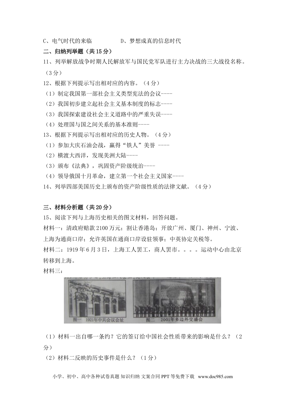 吉林省2013年初中毕业生学业考试历史试题一、单项选择题(每小题1分,共10分)1、近代史上,通过不平等条约割占我国北方领土150多万平方千米的国家是[来源:Zxxk.Com]A、英国B、法国C、俄国D、美国[来源:学科网ZXXK]2、下列事件中,成为中国共产党历史上生死攸关转折点的是A、南昌起义B、遵义会议C、中共七大D、中共十一届三中全会3、捉蒋----英雄壮举;放蒋----大局为重;送蒋----情真意切。与此评价相关的人物是A、彭德怀B、李宗仁C、张学良D、周恩来4、洗雪百年国耻,标志我国在完成祖国统一大业道路上迈出重要一步的事件是A、汪辜会谈B、“一国两制”构想的提出C、西藏和平解放D、香港、澳门回归祖国5、1971年10月,中国在外交上取得重大胜利,开始重返国际政治舞台。与此相关的事件是A、中日建交B、签署《中美联合公报》C、中美建交D、中国恢复在联合国的合法席位6、尼罗河流域是人类文明的摇篮。下列文明成果中属于这一地区的是A、象形文字金字塔B、种姓制度佛教C、楔形文字汉谟拉比法典D、公元纪年基督教7、马克思主义诞生的标志是A、《人民宪章》的发表B、《共产党宣言》的发表C、巴黎公社的成立D、《国际歌》的诞生8、提出遵守各国在中国“门户开放”、“机会均等”原则的条约是A、《辛丑条约》B、《凡尔赛和约》C、《四国条约》D、《九国公约》9、把绥靖政策推向顶峰,使法西斯国家侵略野心日益膨胀的事件是A、国会纵火案B、慕尼黑阴谋C、德国突袭波兰D、德国突袭苏联10、某班准备开展关于第三次科技革命的研究性学习,下列主题中最恰当的是A、资本主义时代的曙光B、改变世界面貌的蒸汽革命小学、初中、高中各种试卷真题知识归纳文案合同PPT等免费下载www.doc985.comC、电气时代的来临D、梦想成真的信息时代二、归纳列举题(共15分)11、列举解放战争时期人民解放军与国民党军队进行主力决战的三大战役名称。(3分)12、根据下列提示写出相对应的内容。(4分)(1)制定我国第一部社会主义类型宪法的会议----(2)我国初步建立起社会主义基本制度的标志----(3)我国探索建设社会主义道路中的严重失误----(4)处理国与国之间关系的基本准则----13、根据下列提示写出相对应的历史人物。(4分)(1)参加大庆石油会战,赢得“铁人”美誉----(2)横渡大西洋,发现美洲大陆----(3)颁布《法典》,巩固资产阶级统治----(4)领导俄国十月革命,建立第一个社会主义国家----14、列举四部美国历史上颁布的资产阶级性质的法律文献。(4分)三、材料分析题(共20分)15、阅读下列与上海历史相关的图文材料,回答问题。材料一:清政府赔款2100万元;割让香港岛;开放广州、厦门、神州、宁波、上海为通商口岸;允许英国在通商口岸设驻领事;中英协定关税等。材料二:1919年6月3日,上海工人罢工,商人罢市。。。。运动中心由北京转移到上海。材料三:(1)材料一出自哪一条约?它的签订给中国社会性质带来的影响是什么?(2分)(2)材料二反映的历史事件是什么?(1分)小学、初中、高中各种试卷真题知识归纳文案合同PPT等免费下载www.doc985.com(3)根据材料三依次写出两次会议的名称。(2分)(4)阅读上述材料,你有什么感悟?(1分)16、阅读下列材料,回答问题。材料一:1914年8月,当战争爆发时,一位德国官员绝望地评论道:“这一切都来自这种该死的聪明体系,它们是现代战争的祸根。”材料二:在雅尔塔会议上,斯大林指出“战时,要保持团结并不太难,因为有一个打败共同敌人的共同目标,这一点谁都清楚。艰难的工作在战后,那时,各种不同的利害关系往往会使同盟国分裂。”---------摘自《全球通史》(1)材料一中“战争”的导火线是什么?“联盟体系”指的是哪两大军事集团?(3分)(2)材料二中为实现“打败共同敌人的共同目标“而成立的国际组织是什么?写出一例这一组织成员国协同作战的战役。(2分)(3)材料二中“同盟国”因“各种不同的利害关系”产生分裂,其正式分裂的标志是什么?(1分)(4)阅读上述材料,你有什么感悟?(1分)17、阅读下列材料,回答问题。材料一:19世纪欧洲对世界的支配不仅建立在欧洲工业革命和基础上,也建立在欧洲政治革命的基础...