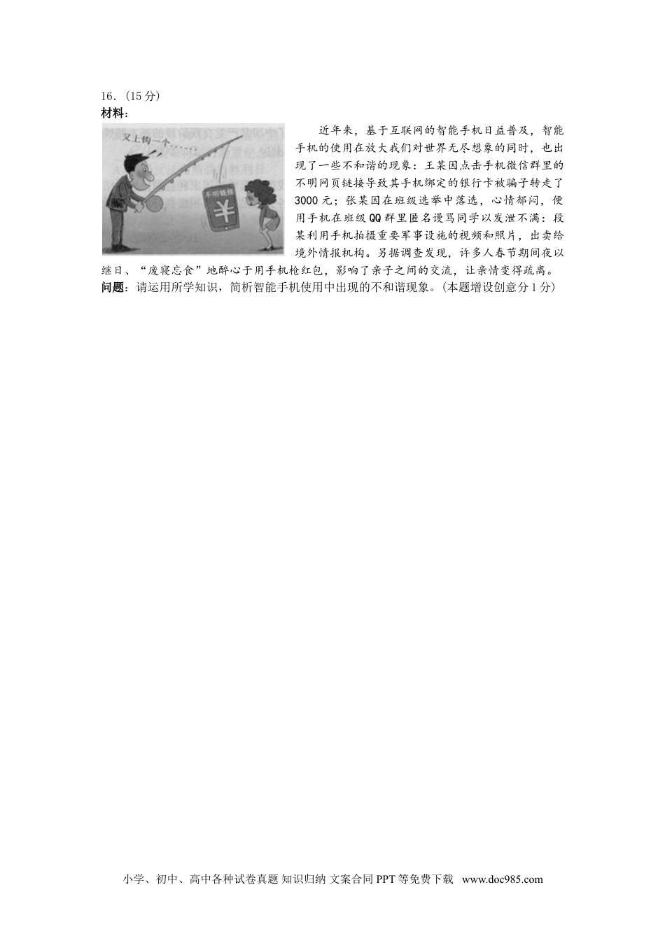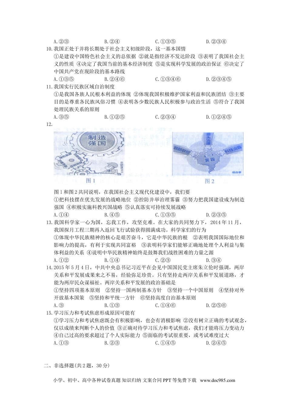 南京市2015年初中毕业生学业考试思想品德(开卷)一、单项选择题(在下列各题的四个选项中,只有一项是最符合题意的。每小题2分,共30分)1.2014年8月31日,十二届全国人大常委会第十次会议审议通过,将每年9月30日确定为▲,国家将举行隆重纪念活动。A.世界反法西斯战争胜利日B.南京大屠杀死难者国家公祭日C.烈士纪念日D.中国人民抗日战争胜利纪念日2.2015年3月28日,《推动共建▲经济带和2l世纪▲的愿景与行动》经国务院授权发布。建设“一带一路”将让中国与世界更加紧密地联系在一起,推动更多国家和地区开展全方位合作。A.丝绸之路海上丝绸之路B.丝绸之路长江经济带C.京津冀海上丝绸之路D.海上丝绸之路丝绸之路3.2015年4月15日,▲意向创始成员国全部确定,它是由中国倡议设立的一个政府间性质的亚洲区域多边开发机构。A.亚洲商业银行B.亚洲基础设施投资银行C.亚洲开发银行D.亚太基础设施投资基金4.“天生我材必有用”,这句话启示我们A.扬长避短是自强的捷径B.肯定自己的长处是自强不息的关键C.即使遭遇挫折也不能失去自信D.客观认识自我是增强自信心最重要的支柱5.2014年10月15日,某校初二学生周某放学回家,在公交车上看到小偷正在行窃,准备上前制止。青少年同违法犯罪作斗争A.就会危害到自己的生命健康B.违背了法律对未成年人的特殊保护C.既要勇敢面对,又要见义智为D.虽符合法律规定,但违背道德要求6.正确与同学交往,我们应该做到A.尊重同学与自己的差异B.遵从同学对自己的评价C.宽容同学犯的各种错误D.与同学合作,避免竞争7.我们会对父母产生逆反心理,这可能是因为A.逆反心理既惩罚自己,也会极大伤害父母B.我们与父母之间思想观念存在明显的差异C.消极的逆反心理可以通过积极沟通来克服D.逆反心理和逆反行为不可以一概说是错的8.初中生陈某屡有逃学等违反校纪行为,学校劝其退学,陈某表示愿意接受,陈某家长质疑:学校侵犯了孩子的受教育权。对陈某的行为,下列认识正确的是A.学校行为违背了受教育权强制性公益性特征B.陈某家长的言行割裂了权利和义务的关系C.陈某做到了正确与学校领导和老帅交往D.陈某没有做到自觉履行受教育的义务9.某培训机构盗版他人教材进行培训,很多人明知这一情况,却图便宜去报名。对此认识正确的是①该培训机构侵犯了他人的隐私权②该培训机构侵犯了他人的智力成果权③该培训机构侵犯了上述报名者的公平交易权④上述报名者的做法纵容了该培训机构的违法行为⑤上述报名者作为消费者的知情权被该培训机构侵犯小学、初中、高中各种试卷真题知识归纳文案合同PPT等免费下载www.doc985.comA.②③B.②④C.①③⑤D.②③④10.我国正处于并将长期处于社会主义初级阶段,这一基本国情①是建设中国特色社会主义的总依据②就是指经济不发达阶段③表明了我国社会主义的性质④决定了我国当前的基本经济制度⑤是实现科学发展的政治保证⑥决定了中国共产党在现阶段的基本路线A.①③⑤B.②④⑥C.①③④⑥D.②③④⑤11.我国实行民族区域自治制度①是我国各族人民根本利益的体现②体现我国积极维护国家利益和民族团结③主要目的是尊重各民族风俗习惯④表明各少数民族人民积极参与政治生活⑤符合了我国处理民族关系的原则A.③⑤B.①②⑤C.②③④D.①②④⑤12.图l和图2共同说明,在我国社会主义现代化建设中,我们要①把科技摆在优先发展的战略地位②控防并举治理雾霾③努力把我国建设成为制造强国④积极实施科教兴国战略⑤认真落实可持续发展战略A.①④B.④⑤C.①③⑤D.②③⑤13.我国科学家一心为国,忘我工作,攻坚克难。在大家的共同努力下,2014年11月,我国探月工程三期再入返回飞行试验获得圆满成功。科学家们的行为①体现中华民族精神的核心是艰苦奋斗,它是中华民族的根②表明我国国际地位和影响力的提高,有利于实现共同富裕③表明科学家们能够正确地处理个人利益与集体利益的关系④说明中华民族精神始终是鼓舞我们战胜困难的力量之源A.①②B.①④C.②③D.③④14.2015年5月4日,中共中央总书记习近平在会见中国国民党主席朱立伦时强调,两岸关系和平发展成果来之不易,经验弥足珍贵。只有坚持走两岸关系和平发展道路,才能为两岸民众谋福祉。两岸关系...