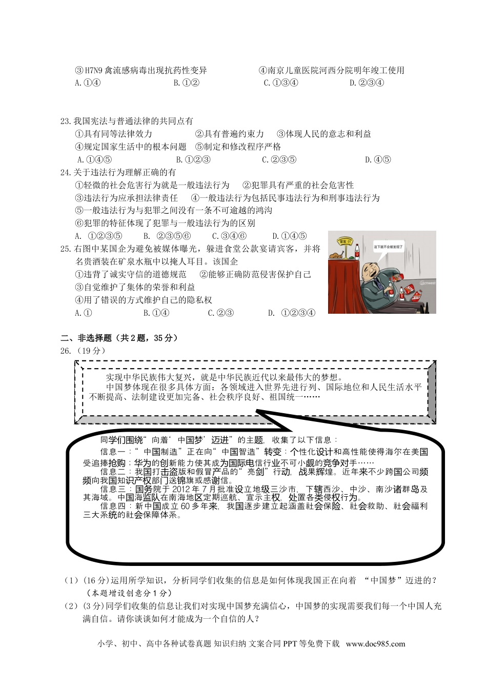 2013年南京中考思想品德试题(开卷)一、单项选择题(在下列各题的四个选项中,只有一项是最符合题意的。每小题1分,共25分)1.中国第一艘航空母舰▲于2012年9月25日正式交付海军,中国海军从此进入航母时代。A.青岛舰B.郑和舰C.马鞍山舰D.辽宁舰2.2012年12月26日,世界运营里程最长的北京至▲高速铁路全线开通运营。A.南京B.广州C.上海D.厦门3.2012年诺贝尔奖在瑞典揭晓,中国作家莫言获A.诺贝尔物理奖B.诺贝尔和平奖C.诺贝尔文学奖D.诺贝尔化学奖4.经国务院、江苏省政府批复同意,2013年2月20日起,南京市行政区划进行较大幅度调整,调整后南京市共有▲个行政区。A.11B.13C.6D.45.第二届亚洲青年运动会将于2013年8月16日至24日在南京举办。2013年亚青会的吉祥物是6.青少年正处在兴趣高峰时期,碰到新鲜事物总想知道为什么。这说明好奇心A.总是有助于培养高雅的生活情趣B.是青少年特有的心理特征C.总是会导致庸俗生活情趣的产生D.能推动我们探索未知世界7.“在珍惜自己生命健康权的同时,也必须尊重他人生命健康权。”这一观点强调A.要珍爱自己的生命健康权B.公民的权利与义务具有一致性C.要尊重他人的生命健康权D.公民的法定权利同时也是义务8.小林购买到质量有瑕疵的商品,商场以“特价商品概不退换”为由拒绝退换,小林只得就此算了。对小林这一做法,认识正确的是A.小林的合法财产所有权受到侵犯B.小林应当同违法行为作斗争C.小林的消费者合法权益受到侵犯D.小林合理调控了自己的情绪9.我国法律保护公民智力成果权A.是指保护我国公民的著作权B.主要是保护知识分子的合法权利C.能够激励人们创造无形财产D.主要是保护未成年人的知识产权10.我国制定计划生育基本国策的主要依据是A.社会主义初级阶段的国情B.控制人口数量,提高人口素质C.晚婚、晚育、少生、优生D.有利于更好地抚育高素质后代11.下列能直接体现公民积极参与我国政治生活的是A.学生向校长建议为教学楼安装防护拦B.居民林某向派出所建议加强夜巡工作C.小明积极参与学校组织的“光盘行动”D.我国采取财政补贴方式推广节能家电12.现阶段我国各族人民的共同理想是A.培养一代又一代有理想、有道德、有文化、有纪律的公民B.毫不动摇坚持中国共产党在社会主义初级阶段的基本路线C.坚持沿着中国特色社会主义道路集中力量进行现代化建设D.把我国建设成为富强民主文明和谐的社会主义现代化国家13.同学们一起复习迎接中考,在此过程中小学、初中、高中各种试卷真题知识归纳文案合同PPT等免费下载www.doc985.comB.A.C.D.A.同学们能感受到的学习压力都是一样的B.树立正确的考试观念能够消除学习压力C.以分数判断个人价值容易产生学习压力D.存在压力就无法体验学习的乐趣和意义14.祖国各民族文化异彩纷呈,这直接体现出A.文化的丰富性、多样性B.各民族自主创新独立发展C.文化的融合性、统一性D.民族交往中礼仪的多样性15.下列关于我国发展的三幅图片共同反映出A.我国社会主义制度优越性已充分显现B.我们中华民族伟大复兴的目标已经实现C.我国人民的消费观念发生了巨大变化D.我国进入全面建设小康社会新发展阶段16.某地12岁女孩因偷了一个发夹和三颗糖被超市捆绑示众。对女孩行为认识正确的是A.超市的违法行为要承担相应法律责任B.作为未成年人,她应得到宽容,不予计较C.超市未能履行对未成年人的保护义务D.她的行为警示我们防微杜渐远离违法犯罪17.下列属于直接体现我国社会主义性质的政治制度有①推进改革开放②公有制为主体、多种所有制经济共同发展③民族区域自治制度④人民代表大会⑤按劳分配为主体、多种分配方式并存A.③④B.②⑤C.③D.①②⑤18.李文波20多年来先后29次赴南沙执行守礁任务,创造了国内守礁次数最多、时间最长、成果最丰的纪录。据此可以看出李文波具有①自强不息的品质②团结合作的品质③艰苦奋斗的精神④爱国主义精神A.①②B.②④C.②③④D.①③④19.下列关于逆反心理的观点中正确的有①在与老师和同学交往中要学会正确处理逆反心理②逆反心理是我们成长过程中的阻力③有逆反行为是不孝敬父母的表现④逆反心理是青春期心理发展中的一种正常现象⑤正确认识逆反心理有助于正确认识自己A.③④B.①③⑤C....