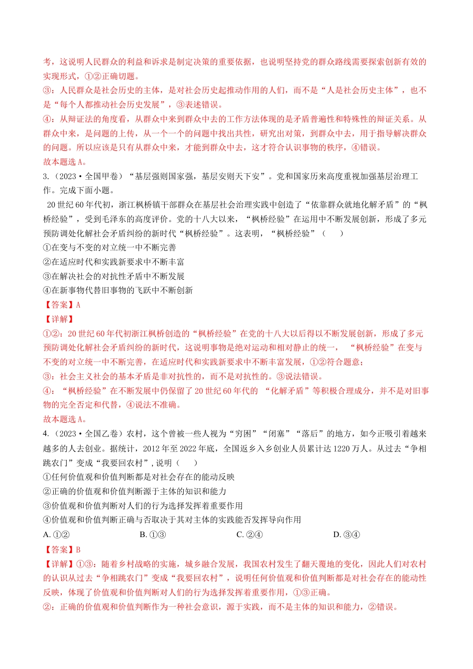 五年(2019-2023)年高考政治真题分项汇编专题16认识社会与价值选择1.(2023·全国甲卷)在讲究效率、与时间赛跑的时代,“治愈”“解压”“诗和远方”等网络热词在青年群体中广泛传播,面对成长中的挑战与困难不“躺平”、不消沉、不抱怨,而是主动营造“治愈瞬间”、仔细体味“幸福时刻”,让人生充满温暖与亮色,成为青年人进行心理调适、积蓄昂扬斗志的新手段。这说明()①价值观正确与否取决于人们的价值评价②价值观是社会存在的反映并随其发展而变化③价值观往往因人而异,都应当得到包容与认同④价值观对人生道路和生活方式的选择有着重要影响A.①②B.①③C.②④D.③④【答案】C【详解】①:价值观正确与否,不是取决于人们的价值评价,而是取决于是否遵循社会发展的客观规律和是否站在最广大人民的立场上,①排除。②:在讲究效率、与时间赛跑的时代,“治愈”“解压”“诗和远方”等网络热词在青年群体中广泛传播,这表明价值观是社会存在的反映并随其发展而变化,②正确。③:价值观是两面性,不是所有的价值观而是只有正确的价值观才应当得到包容与认同,③排除。④:面对成长中的挑战与困难不“躺平”、不消沉、不抱怨,而是主动营造“治愈瞬间”、仔细体味“幸福时刻”,让人生充满温暖与亮色,成为青年人进行心理调适、积蓄昂扬斗志的新手段。这说明价值观对人生道路和生活方式的选择有着重要影响,④正确。故本题选C。2.(2023·全国甲卷)党的二十大相关工作网络征求意见活动于2022年4月15日至5月16日开展,在人民日报社、新华社、中央广播电视总台所属官网、新闻客户端以及“学习强国”学习平台分别开设专栏,听取全社会意见建议,累计收到网民建言854.2万余条,为党的二十大相关工作提供了有益参考。从中获得的启示是()①人民群众的利益和诉求是制定决策的重要依据②坚持党的群众路线需要探索创新有效的实现形式③人是社会历史主体,每个人都推动社会历史发展④只要坚持“到群众中去”,就能实现“从群众中来”A.①②B.①④C.②③D.③④【答案】A【详解】①②:党的二十大相关工作通过网络等媒体全社会意见,这为党的二十大相关工作提供有益参考,这说明人民群众的利益和诉求是制定决策的重要依据,也说明坚持党的群众路线需要探索创新有效的实现形式,①②正确切题。③:人民群众是社会历史的主体,是对社会历史起推动作用的人们,而不是“人是社会历史主体”,也不是“每个人都推动社会历史发展”,③表述错误。④:从辩证法的角度看,从群众中来到群众中去的工作方法体现的是矛盾普遍性和特殊性的辩证关系。从群众中来,是问题的上传,从一个一个的问题中找出共性,研究出对策,到群众中去,用于指导解决群众的问题。所以应该是只有从群众中来,才能到群众中去,这才符合认识事物的秩序,④错误。故本题选A。3.(2023·全国甲卷)“基层强则国家强,基层安则天下安”。党和国家历来高度重视加强基层治理工作。完成下面小题。20世纪60年代初,浙江枫桥镇干部群众在基层社会治理实践中创造了“依靠群众就地化解矛盾”的“枫桥经验”,受到毛泽东的高度评价。党的十八大以来,“枫桥经验”在运用中不断发展创新,形成了多元预防调处化解社会矛盾纠纷的新时代“枫桥经验”。这表明,“枫桥经验”()①在变与不变的对立统一中不断完善②在适应时代和实践新要求中不断丰富③在解决社会的对抗性矛盾中不断发展④在新事物代替旧事物的飞跃中不断创新【答案】A【详解】①②:20世纪60年代初浙江枫桥创造的“枫桥经验”在党的十八大以后得以不断发展创新,形成了多元预防调处化解社会矛盾纠纷的新时代,这说明事物是绝对运动和相对静止的统一,“枫桥经验”在变与不变的对立统一中不断完善,在适应时代和实践新要求中不断丰富发展,①②符合题意;③:社会主义社会的基本矛盾是非对抗性的,而不是对抗性的。③说法错误。④:“枫桥经验”在不断发展中仍保留了20世纪60年代的“化解矛盾”等积极合理成分,并不是对旧事物的完全否定和代替,④说法不准确。故本题选A。4.(2023·全国乙卷)农村,这个曾被一些人视为“穷困”“闭塞”“落后”的地方,如今正吸引着越来...