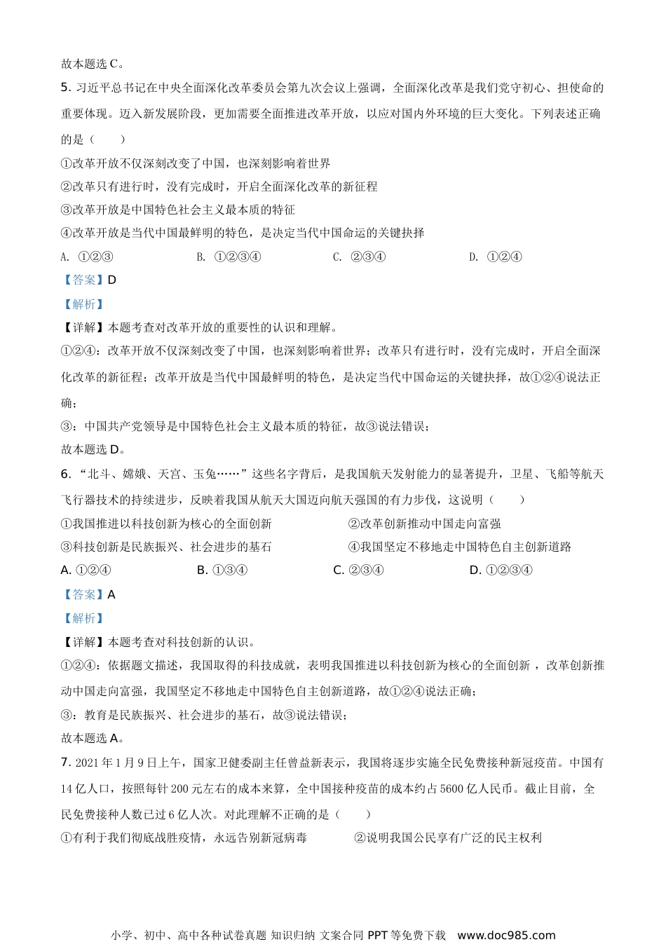 达州市2021年高中阶段学校招生统一考试暨初中学业水平考试道德与法治温馨提示:1.答题前,考生需用0.5毫来黑色签字笔将自己的姓名、准考证号、座位号正确填写在答题卡对应位置。待监考老师粘贴条形码后,再认真核对条形鸡上的信息与自己的准考证上的信息是否一致。2.选择题必须使用2B铅笔在答题卡相应位置规范填涂。如需改动,用橡皮擦擦干净后,再选涂其他答案标号;非选择题用0.5毫来黑色签字笔作答,答案必须写在答题卡对应的框内,超出答题区答案无效;在草稿纸、试题卷上作答无数。3.保持答题卡整洁,不要折叠、弄破、弄皱,不得使用涂改液、修正带、刮纸刀。4.考试结束后,将试卷及答题卡一并交回。第Ⅰ卷一、单项选择题1.2021年2月5日20时,首次火星探测任务________探测器发动机点火工作顺利完成地火转移段第四次轨道中途修正。此前,此探测器在距离火星约220万公里处,获取首幅火星图像,成为我国第一颗人造火星卫星,实现“绕、着、巡”第一步“绕”的目标。()A.天宫一号B.北斗三号C.天问一号D.嫦娥五号【答案】C【解析】【详解】时事题,解析略。2.2020年10月26日至29日,党的十九届五中全会在北京召开。会议审议通过了《中共中央关于制定国民经济和社会发展第________个五年规划和________年远景目标的建议》()A.十四二O五OB.十三二0二0C.十五本世纪中叶D.十四二0三五【答案】D【解析】【详解】时事题,解析略。3.阅读漫画,分析下列对自由、平等、公正、法治之间关系表述正确的是()小学、初中、高中各种试卷真题知识归纳文案合同PPT等免费下载www.doc985.com①法律面前人人平等,是社会主义法治的基本原则之一②自由平等是法治社会的核心价值③法治是实现自由平等、公平正义的保证④自由标定了法治的界限,自由的实现不能触碰法律的红线A.①②B.①③C.②④D.③④【答案】B【解析】【详解】本题考查对社会主义核心价值观的理解和把握。①:法律面前人人平等,是社会主义法治的基本原则之一,故①说法正确;②:公平正义是法治社会的核心价值,故②说法错误;③:法治是实现自由平等、公平正义的保证,故③说法正确;④:法治标定了自由的界限,自由的实现不能触碰法律的红线,故④说法错误;故本题选B。4.2020年10月17日,中华人民共和国主席习近平颁布第57号主席令:《中华人民共和国未成年人保护法》已由中华人民共和国第十三届全国人民代表大会常务委员会第二十一次会议于2020年10月17日修订通过,现予公布,自2021年6月1日起施行。这体现了国家主席行使的职权是()A.立法权B.决定权C.公布法律、发布命令D.外事权【答案】C【解析】【详解】本题考查国家主席的职权。C:根据所学,国家主席根据全国人民代表大会的决定和全国人民代表大会常务委员会的决定,公布法律,发布特赦令,宣布进入紧急状态,宣布战争状态,发布动员令。据此,“中华人民共和国主席习近平颁布第57号主席令:《中华人民共和国未成年人保护法》……现予公布,自2021年6月1日起施行”,体现了国家主席行使的职权是公布法律、发布命令,所以C正确;AB:这是人民代表大会的职权,不是国家主席的职权,AB错误;D:在题干中未涉及,D不符合题意;小学、初中、高中各种试卷真题知识归纳文案合同PPT等免费下载www.doc985.com故本题选C。5.习近平总书记在中央全面深化改革委员会第九次会议上强调,全面深化改革是我们党守初心、担使命的重要体现。迈入新发展阶段,更加需要全面推进改革开放,以应对国内外环境的巨大变化。下列表述正确的是()①改革开放不仅深刻改变了中国,也深刻影响着世界②改革只有进行时,没有完成时,开启全面深化改革的新征程③改革开放是中国特色社会主义最本质的特征④改革开放是当代中国最鲜明的特色,是决定当代中国命运的关键抉择A.①②③B.①②③④C.②③④D.①②④【答案】D【解析】【详解】本题考查对改革开放的重要性的认识和理解。①②④:改革开放不仅深刻改变了中国,也深刻影响着世界;改革只有进行时,没有完成时,开启全面深化改革的新征程;改革开放是当代中国最鲜明的特色,是决定当代中国命运的关键抉择,故①②④说法正确;③:中国共产党领导是中国...