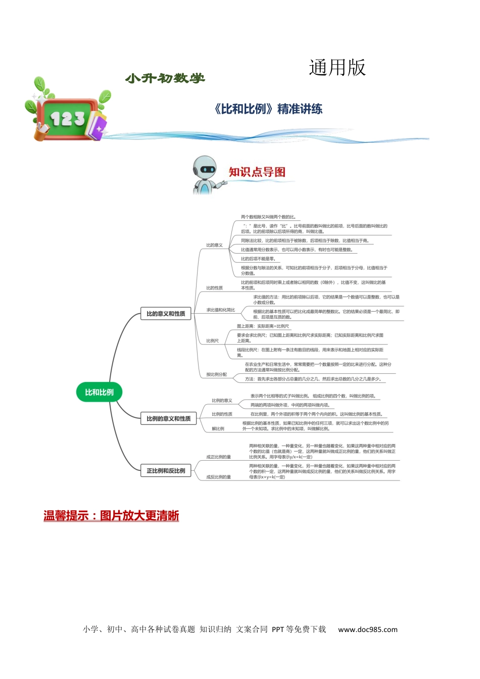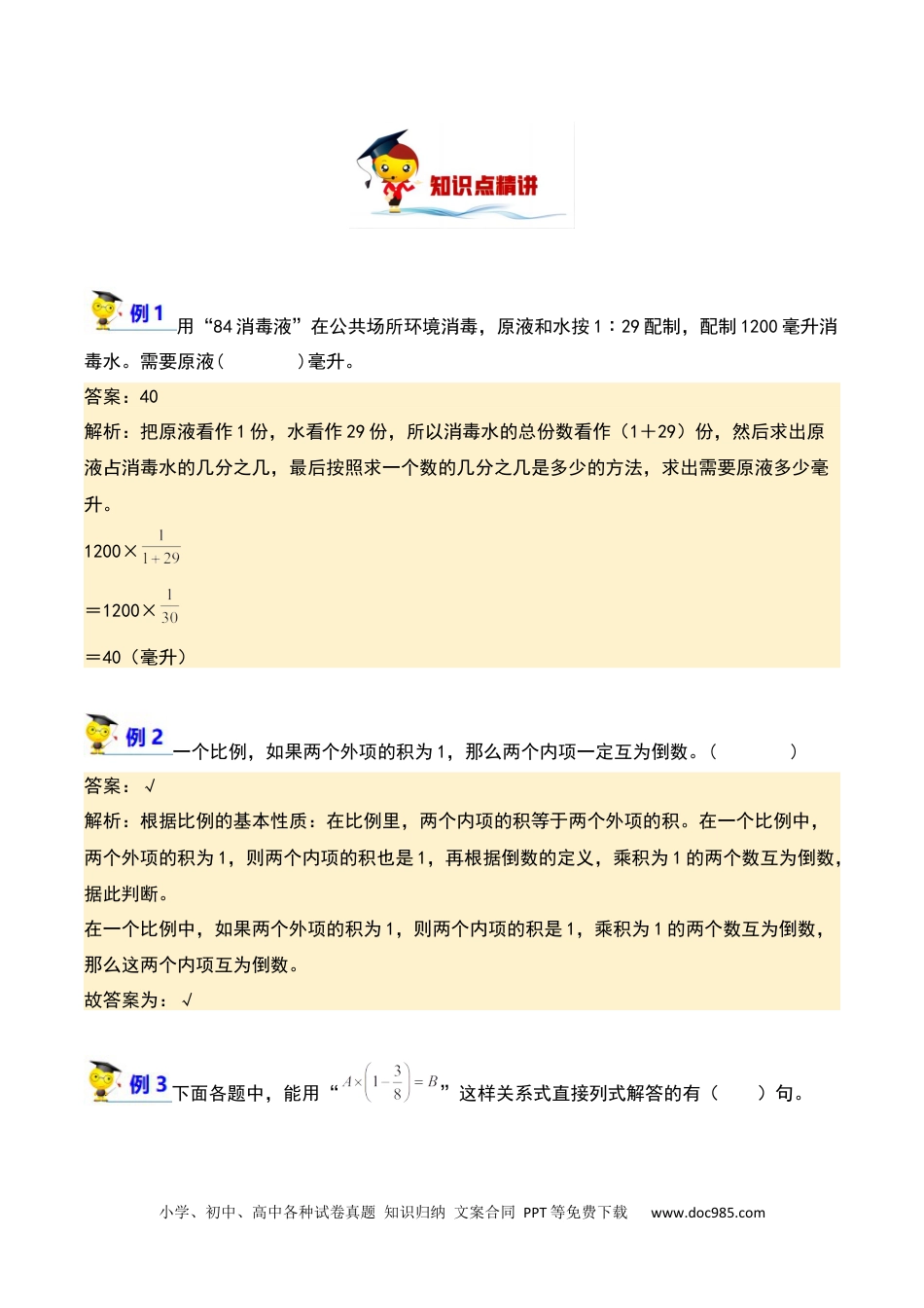 小学、初中、高中各种试卷真题知识归纳文案合同PPT等免费下载www.doc985.com温馨提示:图片放大更清晰《比和比例》精准讲练通用版小升初数学小学、初中、高中各种试卷真题知识归纳文案合同PPT等免费下载www.doc985.com用“84消毒液”在公共场所环境消毒,原液和水按1∶29配制,配制1200毫升消毒水。需要原液()毫升。答案:40解析:把原液看作1份,水看作29份,所以消毒水的总份数看作(1+29)份,然后求出原液占消毒水的几分之几,最后按照求一个数的几分之几是多少的方法,求出需要原液多少毫升。1200×=1200×=40(毫升)一个比例,如果两个外项的积为1,那么两个内项一定互为倒数。()答案:√解析:根据比例的基本性质:在比例里,两个内项的积等于两个外项的积。在一个比例中,两个外项的积为1,则两个内项的积也是1,再根据倒数的定义,乘积为1的两个数互为倒数,据此判断。在一个比例中,如果两个外项的积为1,则两个内项的积是1,乘积为1的两个数互为倒数,那么这两个内项互为倒数。故答案为:√下面各题中,能用“”这样关系式直接列式解答的有()句。小学、初中、高中各种试卷真题知识归纳文案合同PPT等免费下载www.doc985.com①修一条400米的公路,已经修了,还剩下多少米未修?②一条公路已经修了400米,剩下的比已修的少,还剩下多少米未修?③修一条400米的公路,已修的和未修的长度比是3∶5,已经修了多少米?④修一条400米的公路,已修的和未修的长度比是3∶5,还剩下多少米未修?A.1B.2C.3D.4答案:C解析:①把这条公路的总长度看作单位“1”,剩下的长度占这条公路总长度的(1-),剩下的长度=这条公路的总长度×(1-);②把已修的公路长度看作单位“1”,剩下的长度占已修的(1-),剩下的长度=已修的长度×(1-);③把这条公路的总长度看作单位“1”,已修的长度占这条公路总长度的,已经修的长度=这条公路的总长度×;④把这条公路的总长度看作单位“1”,已修的长度占这条公路总长度的,则剩下的长度占这条公路总长度的(1-),剩下的公路长度=这条公路的总长度×(1-);据此解答。①400×(1-)=400×=250(米)所以,还剩下250米未修。小学、初中、高中各种试卷真题知识归纳文案合同PPT等免费下载www.doc985.com②400×(1-)=400×=250(米)所以,还剩下250米未修。③400×=150(米)所以,已经修了150米。④400×(1-)=400×(1-)=400×=250(米)所以,还剩下250米未修。故答案为:C酸梅汤是老北京人传统的消暑饮料,经常饮用能祛病除疾,保健强身,是炎热夏季不可多得的保健饮品。夏天喝酸梅汤的习惯历史悠久,也是我国最古老的传统饮品之一。雨晴用180毫升的酸梅原汁加水调制了500毫升酸梅汤。妈妈说:“当酸梅原汁和水的比是时,口感最佳。”为了使调制的酸梅汤口感最佳。雨晴应该再往酸梅汤中加水多少毫升?(专家特别提醒,儿童最好少吃酸梅汤类的食品,因为儿童胃黏膜结构比较薄弱,抵抗不了酸性物质的持续侵蚀。如果长时间服用,容易引发胃和十二指肠溃疡。)答案:解:设需再往酸梅汤中加水x毫升。180∶(500-180+x)=3∶73×(320+x)=180×7320+x=1260÷3x=420-320x=100小学、初中、高中各种试卷真题知识归纳文案合同PPT等免费下载www.doc985.com答:雨晴应该再往酸梅汤中加水100毫升。解析:设需再往酸梅汤中加水x毫升,此时酸梅原汁和水的比是3∶7,由此列出比例求解即可。一、题填空1.,在角三角形如图直MON中,MO=2,厘米NO=5,分以厘米如果别MO、NO边为轴一形成圆,以旋转周锥那么MO为和以轴NO为的圆积之比是轴锥体()。答案:5∶2解析:以MO为一形成的圆,底面半径为轴旋转周锥5,高为厘米2,以厘米NO为轴旋转一形成的圆,底面半径为周锥2,高为厘米5,用厘米利“分出两个圆的”别求锥积,后根据比的出两个圆的积比,据解答。体最意义求锥体此以MO为一形成圆:轴旋转周锥=(方)立厘米以NO为一形成的圆:轴旋转周锥=(方)立厘米∶=∶=50∶20=5∶22.在一中,的中是次射击练习刘洋命率75%,表示中的数量与一的数量比命子弹共射击子弹是()∶20,以用分数还可表示。小学、初中、...