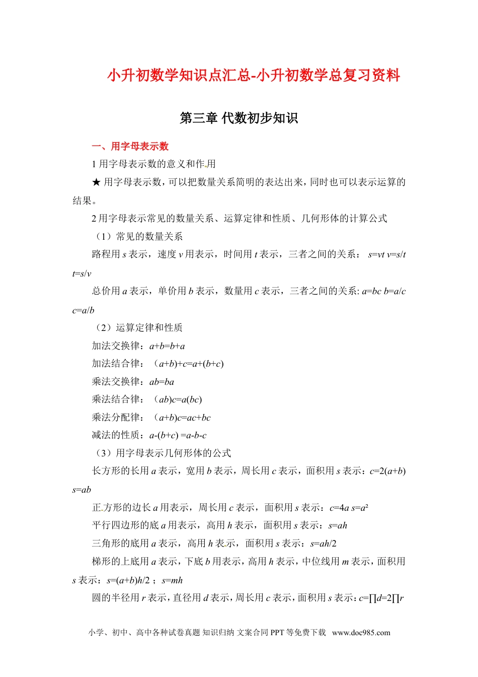 小升初数学知识点汇总-小升初数学总复习资料第三章代数初步知识一、用字母表示数1用字母表示数的意义和作用★用字母表示数,可以把数量关系简明的表达出来,同时也可以表示运算的结果。2用字母表示常见的数量关系、运算定律和性质、几何形体的计算公式(1)常见的数量关系路程用s表示,速度v用表示,时间用t表示,三者之间的关系:s=vtv=s/tt=s/v总价用a表示,单价用b表示,数量用c表示,三者之间的关系:a=bcb=a/cc=a/b(2)运算定律和性质加法交换律:a+b=b+a加法结合律:(a+b)+c=a+(b+c)乘法交换律:ab=ba乘法结合律:(ab)c=a(bc)乘法分配律:(a+b)c=ac+bc减法的性质:a-(b+c)=a-b-c(3)用字母表示几何形体的公式长方形的长用a表示,宽用b表示,周长用c表示,面积用s表示:c=2(a+b)s=ab正方形的边长a用表示,周长用c表示,面积用s表示:c=4as=a²平行四边形的底a用表示,高用h表示,面积用s表示:s=ah三角形的底用a表示,高用h表示,面积用s表示:s=ah/2梯形的上底用a表示,下底b用表示,高用h表示,中位线用m表示,面积用s表示:s=(a+b)h/2;s=mh圆的半径用r表示,直径用d表示,周长用c表示,面积用s表示:c=∏d=2∏r小学、初中、高中各种试卷真题知识归纳文案合同PPT等免费下载www.doc985.coms=∏r²扇形的半径用r表示,n表示圆心角的度数,面积用s表示:s=∏nr²/360长方体的长用a表示,宽用b表示,高用h表示,表面积用s表示,体积用v表示:v=sh;s=2(ab+ah+bh);v=abh正方体的棱长用a表示,底面周长c用表示,底面积用s表示,体积用v表示:s=6a²;v=a³圆柱的高用h表示,底面周长用c表示,底面积用s表示,体积用v表示.:s侧=ch;s表=s侧+2s底;v=sh圆锥的高用h表示,底面积用s表示,体积用v表示.:v=sh/33用字母表示数的写法[来源:学科网ZXXK]数字和字母、字母和字母相乘时,乘号可以记作“.”,或者省略不写,数字要写在字母的前面。当“1”与任何字母相乘时,“1”省略不写。在一个问题中,同一个字母表示同一个量,不同的量用不同的字母表示。用含有字母的式子表示问题的答案时,除数一般写成分母,如果式子中有加号或者减号,要先用括号把含字母的式子括起来,再在括号后面写上单位的名称4将数值代入式子求值★把具体的数代入式子求值时,要注意书写格式:先写出字母等于几,然后写出原式,再把数代入式子求值。字母表示的是数,后面不写单位名称。★同一个式子,式子中所含字母取不同的数值,那么所求出的式子的值也不相同。二、简易方程(一)方程和方程的解1方程:含有未知数的等式叫做方程。注意方程是等式,又含有未知数,两者缺一不可。方程和算术式不同。算术式是一个式子,它由运算符号和已知数组成,它表示未知数。方程是一个等式,在方程里的未知数可以参加运算,并且只有当未知数为特定的数值时,方程才成立。小学、初中、高中各种试卷真题知识归纳文案合同PPT等免费下载www.doc985.com2方程的解:使方程左右两边相等的未知数的值,叫做方程的解。三、解方程解方程,求方程的解的过程叫做解方程。四、列方程解应用题1列方程解应用题的意义★用方程式去解答应用题求得应用题的未知量的方法。2列方程解答应用题的步骤★弄清题意,确定未知数并用x表示;★找出题中的数量之间的相等关系;★列方程,解方程;★检查或验算,写出答案。3列方程解应用题的方法[来源:学科网]★综合法:先把应用题中已知数(量)和所设未知数(量)列成有关的代数式再找出它们之间的等量关系,进而列出方程。这是从部分到整体的一种思维过程其思考方向是从已知到未知。★分析法:先找出等量关系,再根据具体建立等量关系的需要,把应用题中已知数(量)和所设的未知数(量)列成有关的代数式进而列出方程。这是从整体到部分的一种思维过程,其思考方向是从未知到已知。4列方程解应用题的范围小学范围内常用方程解的应用题:a一般应用题;b和倍、差倍问题;c几何形体的周长、面积、体积计算;d分数、百分数应用题;e比和比例应用题。五比和比例1比的意义和性质小学、初中、高中各种试卷真题知识归纳文案合同PPT等免费下载www.doc985.com(1)比的意义:两个数相除又叫做两个数的比...