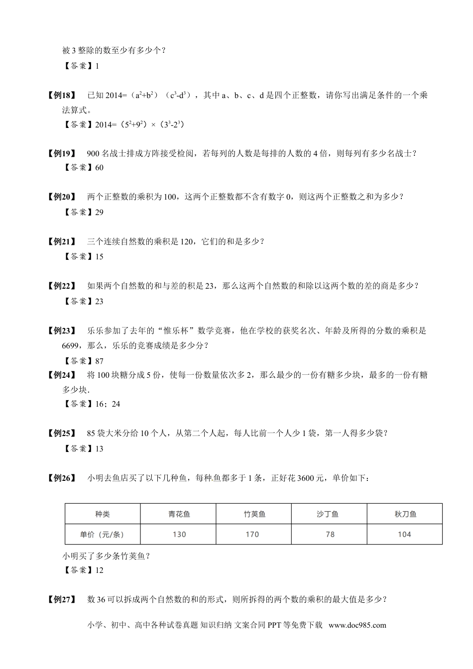 第5讲整数的裂项与拆分第一关【知识点】整数的列项与分拆:就是把一个自然数表示成为若干个自然数的和的形式,每一种表示方法,就是自然数的一个分拆.整数的分拆是古老而又有趣的问题,其中最著名的是哥德巴赫猜想.在国内外数学竞赛中,整数分拆的问题常常以各种形式出现,如,存在性问题、计数问题、最优化问题等.【例1】电视台要播放一部30集电视连续剧,若要求每天安排播出的集数互不相等,则该电视连续剧最多可以播几天?【答案】7天【例2】把135个苹果分成若干份且任意两份的苹果数都不相同,最多可以分多少份?【答案】15【例3】一次数学考试的满分是100分,6位同学在这次考试中平均得分是91分,这6位同学的得分互不相同,其中有一位同学仅得65分.则得分排在第三名的同学至少得多少分?【答案】95分【例4】五名选手在一次数学竞赛中共得404分,每人得分互不相同,并且其中得分最高为90分,那么得分最低的选手至少得多少分?【答案】50【例5】七个小队共种树100棵,各小队种的棵数都不同,其中种树最多的小队种了18棵,种树最少的小队至少种了多少棵?【答案】7【例6】将11个球分别放在三个盒子里,使盒子里球的个数彼此不同,那么,放球最多的盒子里最多可放多少个球,至少要放多少个球?【答案】8;5【例7】甲、乙、丙、丁四个朋友,共分苹果18个,每人依次少一个.甲、乙、丙、丁各有几个苹果?【答案】甲有6个苹果,乙有5个苹果,丙有4个苹果,丁有3个苹果【例8】7名选手在一次数学竞赛中共得170分,每人得分互不相等,并且其中得分最高的选手得30分,那么得分最少的选手至少得多少分,至多得多少分?【答案】5;20【例9】7个工人共生产100个零件,每个工人的生产零件数不同,其中最多的生产了18个,最少多小学、初中、高中各种试卷真题知识归纳文案合同PPT等免费下载www.doc985.com少个?【答案】7【例10】把44块糖分给9个小朋友,每人都分到了,并且任何两人都不相同,这_______做到.(填“能”或“不能”)【答案】不能【例11】某学校有80名小学生参加夏令营,其中男生50人,女生30人,他们住的宾馆有11人间、7人间、5人间三种房间,要求男、女生住不同的房间,并且不能有空床位,他们至少要住多少间?【答案】12【例12】将66个乒乓球放入10个盒子中,要求每只盒子都要有乒乓球,有且只有两个盒子中的乒乓球的个数相同,能办到吗?若能办到,请说明一种具体方法.若办不到,请说明理由.【答案】能将66个乒乓球放入10个盒子中;10个盒子里面的数目为:1,2,3,5,5,6,7,8,9,20。第二关【例13】有三个箱子,如果两箱两箱的称它们的重量,分别是15千克、23千克、26千克,那么其中最重的箱子重多少千克?【答案】17千克第三关[来源:Z#xx#k.Com]【例14】在横线处填上合适的数,使等式成立:8000=____×____×____×____×____【答案】2;4;5;4;50【例15】计算20140309=7×(2877000+17×_________)【答案】11【例16】计算:20140601=13×(1000000+13397×_________)【答案】41【例17】将一个不能被3整除的自然数,拆分成若干个自然数的和.那么,在这若干个自然数中不能小学、初中、高中各种试卷真题知识归纳文案合同PPT等免费下载www.doc985.com被3整除的数至少有多少个?【答案】1【例18】已知2014=(a2+b2)(c3-d3),其中a、b、c、d是四个正整数,请你写出满足条件的一个乘法算式。【答案】2014=(52+92)×(33-23)【例19】900名战士排成方阵接受检阅,若每列的人数是每排的人数的4倍,则每列有多少名战士?[来源:Z|xx|k.Com]【答案】60【例20】两个正整数的乘积为100,这两个正整数都不含有数字0,则这两个正整数之和为多少?【答案】29【例21】三个连续自然数的乘积是120,它们的和是多少?【答案】15【例22】如果两个自然数的和与差的积是23,那么这两个自然数的和除以这两个数的差的商是多少?【答案】23【例23】乐乐参加了去年的“惟乐杯”数学竞赛,他在学校的获奖名次、年龄及所得的分数的乘积是6699,那么,乐乐的竞赛成绩是多少分?【答案】87[来源:学科网ZXXK]【例24】将100块糖分成5份,使每一份数量依次多2,那么最少的一份有糖多少块...