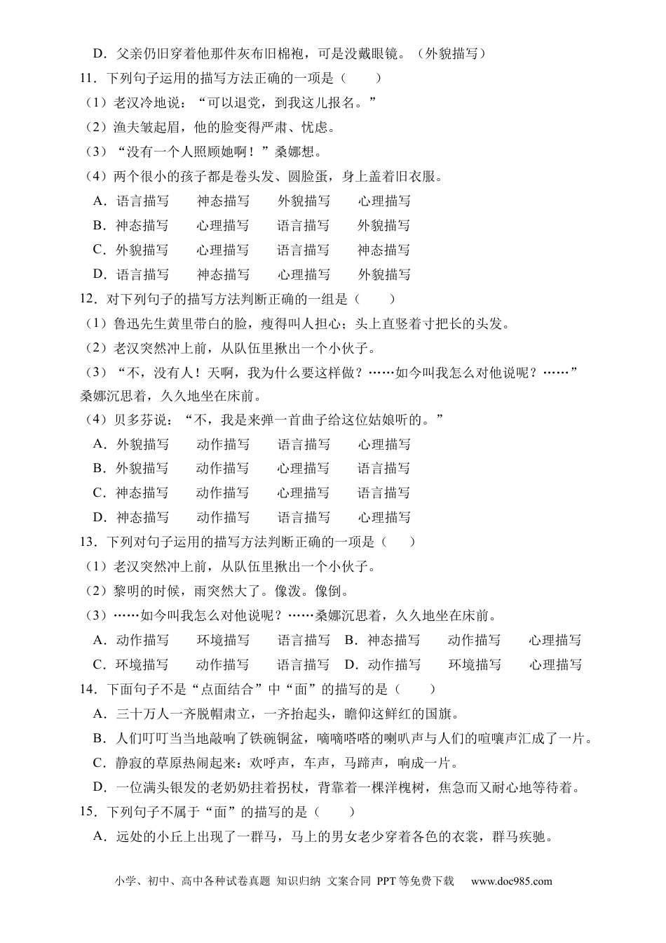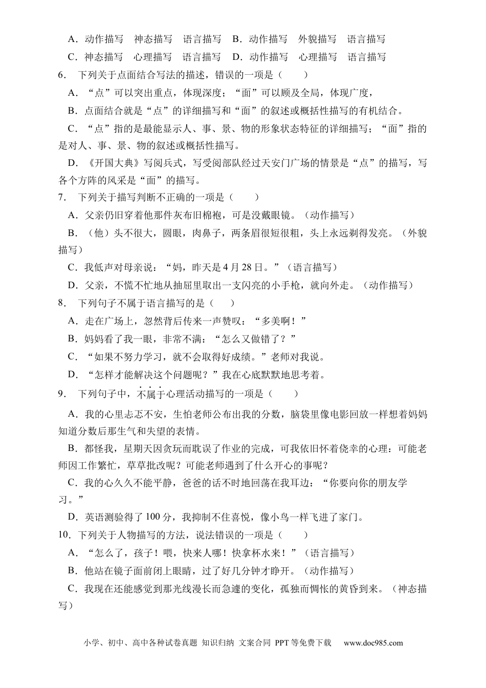 小学、初中、高中各种试卷真题知识归纳文案合同PPT等免费下载www.doc985.com小升初语文易错知识点专项集训描写方法1.下列对句子的描写方法判断错误的是哪一项?()A.车厢里一片寂静,静得可怕。(环境描写)B.她忐忑不安地想:“他会说什么呢?这是闹着玩的吗?”(语言描写)C.战士宋学义扔手榴弹总是把胳膊抢一个圈,好使出浑身的力气。(动作描写)D.“没有一个人照顾她啊!”桑娜一边想一边敲着门。(心理描写)2.下列句子属于心理描写的是()A.泪水模糊了我的眼睛,我看不见同学和张先生的反应,只知道全班忽然异样的寂静。B.我为少男少女们歌唱,我歌唱早晨,我歌唱希望。C.我一声不吭,盼着。我想我再也不离开半步,再不把觉睡过头。D.我感到母亲惊惶地甩了甩手上的水,把我拉进她的怀里。3.对下列句子所运用的描写方法判断不正确的一项是()A.车厢里一片寂静,静得可怕。(环境描写)B.“不,没有人!天啊,我为什么要这样做?……如今叫我怎么对他说呢?……”桑娜沉思着。(语言描写)C.渔夫皱起眉,他的脸变得严肃、忧虑。(神态描写)D.老汉突然冲上前,从队伍里揪出一个小伙子。(动作描写)4.下列句子所用的描写方法判断有误的一项是()A.我的心绷得紧紧的。这怎么忍受得了呢?我担心邱少云会突然跳起来,或者突然叫起来。(心理描写)B.只见罗丹一会儿上前,一会儿后退,嘴里叽里咕噜的,好像在跟谁说悄悄话。(动作描写)C.“小姐,他说,“当我告诉你们这位可怜的夫人就是我的妻子时,你们大概不会再笑了。”(语言描写)D.胡德林和胡福才这两个小战士把脸得紧紧的,全神贯注地瞄准敌人射击。(外貌描写)5.对下列句子所运用的描写方法判断正确的一项是()①三十万人一齐脱帽肃立,一齐抬起头,瞻仰这鲜红的国旗。②桑娜沉思:丈夫不顾惜身体,冒着寒冷和风暴出去打鱼,她自己也从早到晚地干活,还只能勉强填饱肚子。③老汉沙哑地喊话:“桥窄!排成一队,不要挤!党员排在后边!”小学、初中、高中各种试卷真题知识归纳文案合同PPT等免费下载www.doc985.comA.动作描写神态描写语言描写B.动作描写外貌描写语言描写C.神态描写心理描写语言描写D.动作描写心理描写语言描写6.下列关于点面结合写法的描述,错误的一项是()A.“点”可以突出重点,体现深度;“面”可以顾及全局,体现广度,B.点面结合就是“点”的详细描写和“面”的叙述或概括性描写的有机结合。C.“点”指的是最能显示人、事、景、物的形象状态特征的详细描写;“面”指的是对人、事、景、物的叙述或概括性描写。D.《开国大典》写阅兵式,写受阅部队经过天安门广场的情景是“点”的描写,写各个方阵的风采是“面”的描写。7.下列关于描写判断不正确的一项是()A.父亲仍旧穿着他那件灰布旧棉袍,可是没戴眼镜。(动作描写)B.(他)头不很大,圆眼,肉鼻子,两条眉很短很粗,头上永远剃得发亮。(外貌描写)C.我低声对母亲说:“妈,昨天是4月28日。”(语言描写)D.父亲,不慌不忙地从抽屈里取出一支闪亮的小手枪,就向外走。(动作描写)8.下列句子不属于语言描写的是()A.走在广场上,忽然背后传来一声赞叹:“多美啊!”B.妈妈看了我一眼,非常不满:“怎么又做错了?”C.“如果不努力学习,就不会取得好成绩。”老师对我说。D.“怎样才能解决这个问题呢?”我在心底默默地思考着。9.下列句子中,不属于心理活动描写的一项是()A.我的心里忐忑不安,生怕老师公布出我的分数,脑袋里像电影回放一样想着妈妈知道分数后那生气和失望的表情。B.都怪我,星期天因贪玩而耽误了作业的完成,可我依旧怀着侥幸的心理:可能老师因工作繁忙,草草批改呢?可能老师遇到了什么开心的事呢?C.我的心久久不能平静,爸爸的话不时地回荡在我耳边:“你要向你的朋友学习。”D.英语测验得了100分,我抑制不住喜悦,像小鸟一样飞进了家门。10.下列关于人物描写的方法,说法错误的一项是()A.“怎么了,孩子!喂,快来人哪!快拿杯水来!”(语言描写)B.他站在镜子面前闭上眼睛,过了好几分钟才睁开。(动作描写)C.我现在还能感觉到那光线漫长而急遽的变...