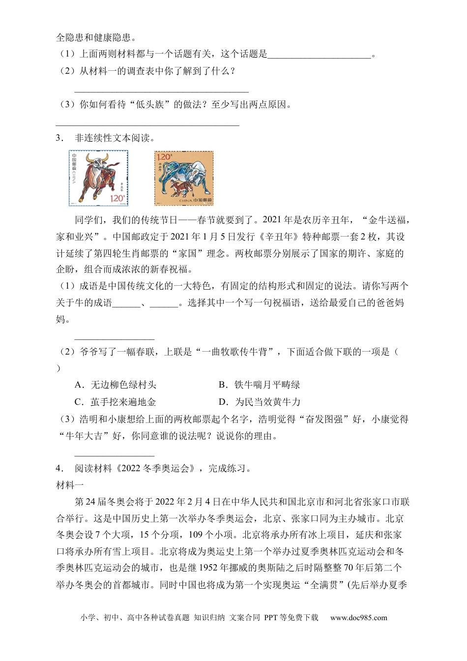 小学、初中、高中各种试卷真题知识归纳文案合同PPT等免费下载www.doc985.com小升初语文易错知识点专项集训非连续性文本阅读1.非连续性文本阅读。材料一锄禾日当午,汗滴禾下土。谁知盘中餐,粒粒皆辛苦。材料二有关数据显示,我国消费者每年仅餐饮浪费的食物蛋白和脂肪就分别达八百万吨和三百万吨,每年浪费食物总量折合粮食约五百亿公斤,接近全国粮食总量的十分之一。即使保守推算,每年最少倒掉约两亿人一年的口粮。与此同时,饥饿却仍是人类的头号杀手。全球平均每年有一千万人因饥饿丧生,每六秒就有一名儿童因饥饿而死亡。(1)从材料二中,你发现的问题是:()针对以上问题,你的解决方法是:()(2)有些人请客摆阔气,认为餐桌上的菜剩得越多越有面子,请你劝说几句。___________________________________________(3)如果你餐馆老板,你准备采用哪些有效措施,既能鼓励广大消费积极加入“光盘行动”中来,又保证餐馆不折本。①餐馆大门口,地面,墙面等全方位,将“说直盘中餐,粒粒皆辛苦”改编成“光盘行动”海报宣传标语——(),让宣传入脑入心。②推出“()”,老板将免费赠送()和()活动。2.非连续性文本阅读。材料一:对280人使用微信情况的调查统计材料二:什么是低头族低头族,是指如今在地铁、公交车里那些作“低头看屏幕”状的人群。他们看手机或平板电脑里的微信,上网玩游戏,看视频,想通过盯住屏幕的方式,把零碎的时间填满。低着头是他们共同的特征,他们的视线和智能手机或平板电脑难分难解。低头族主要出现在城市的地铁上、公交车上,甚至大街小巷,他们的行为存在极大的安小学、初中、高中各种试卷真题知识归纳文案合同PPT等免费下载www.doc985.com全隐患和健康隐患。(1)上面两则材料都与一个话题有关,这个话题是______________________。(2)从材料一的调查表中你了解到了什么?_____________________________________(3)你如何看待“低头族”的做法?至少写出两点原因。_______________________________________3.非连续性文本阅读。同学们,我们的传统节日——春节就要到了。2021年是农历辛丑年,“金牛送福,家和业兴”。中国邮政定于2021年1月5日发行《辛丑年》特种邮票一套2枚,其设计延续了第四轮生肖邮票的“家国”理念。两枚邮票分别展示了国家的期许、家庭的企盼,组合而成浓浓的新春祝福。(1)成语是中国传统文化的一大特色,有固定的结构形式和固定的说法。请你写两个关于牛的成语______、______。选择其中一个写一句祝福语,送给最爱自己的爸爸妈妈。_________________(2)爷爷写了一幅春联,上联是“一曲牧歌传牛背”,下面适合做下联的一项是()A.无边柳色绿村头B.铁牛喘月平畴绿C.茧手挖来遍地金D.为民当效黄牛力(3)浩明和小康想给上面的两枚邮票起个名字,浩明觉得“奋发图强”好,小康觉得“牛年大吉”好,你同意谁的说法呢?说说你的理由。_________________4.阅读材料《2022冬季奥运会》,完成练习。材料一第24届冬奥会将于2022年2月4日在中华人民共和国北京市和河北省张家口市联合举行。这是中国历史上第一次举办冬季奥运会,北京、张家口同为主办城市。北京冬奥会设7个大项,15个分项,109个小项。北京将承办所有冰上项目,延庆和张家口将承办所有雪上项目。北京将成为奥运史上第一个举办过夏季奥林匹克运动会和冬季奥林匹克运动会的城市,也是继1952年挪威的奥斯陆之后时隔整整70年后第二个举办冬奥会的首都城市。同时中国也将成为第一个实现奥运“全满贯”(先后举办夏季小学、初中、高中各种试卷真题知识归纳文案合同PPT等免费下载www.doc985.com奥运会、残奥会、青奥会、冬奥会、冬残奥会)的国家。材料二冬奥会吉祥物第一次问世是在1968年的格勒诺布尔冬奥会上,当时是一个身上印着法国国旗红白蓝三色的滑雪人。有意思的是,这个吉祥物的设计只用了一个晚上的时间,但销量特别好,因此吉祥物也成了历届冬奥会的一部分。但这个吉祥物并不是官方的奥运吉祥物,真正的官方吉祥物在1972年夏奥会诞生,冬奥会的首个官方吉祥物是1976年因斯布鲁克冬奥会的雪人Schneemann。材料三2019年9月17日,2022年...