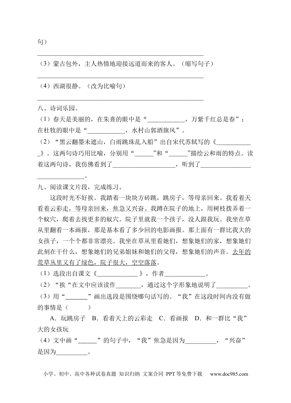 小学、初中、高中各种试卷真题知识归纳文案合同PPT等免费下载www.doc985.com2021-2022学年度小升初检测试卷语文考试时间:90分钟;满分:100分注意事项:1.答题前填写好自己的姓名、班级、考号等信息2.请将答案正确填写在答题卡上一、读下面这段话,根据拼音提示写出相应的词语。抗美援朝时期,面对xiōnɡyǒnɡpénɡpài_______的河水,面对敌军的狂轰乱炸,志愿军们没有bàoyuàn_______,没有jīnɡhuānɡ_______,更没有tuìsuō_______,他们用shòuxuē_______的身躯筑起金刚川上的水路通道,保障了前线物资的输送,为战争的胜利作出了巨大的ɡònɡxiàn_______,受到了人民的yōnɡdài_______。二、下列加点字注音全错的一项是()A.俯身(fú)乐谱(pǔ)铲平(chǎn)寝不安席(qínɡ)B.魁梧(wǔ)晶莹(yínɡ)威胁(xíe)无法割舍(ɡē)C.眷恋(juàn)一扭(niú)咳嗽(shòu)囫囵吞枣(záo)D.日寇(koù)天津(jínɡ)霎时(sà)抑扬顿挫(chuò)三、下词语书写准确无误的一组是()A.起源迷蒙心满意足B.壮列橡皮大步流星C.斑点报怨惊天动地D.斗篷摇蓝一望无际内…………○…………装…………○…………订…………○…………线…………○…………学校:___________姓名:___________班级:___________考号:___________小学、初中、高中各种试卷真题知识归纳文案合同PPT等免费下载www.doc985.com四、查字典。在课外阅读中遇到“秉公办事”中的“秉”字不认识,应用_______查字法查字典,先查_______再查_______画。当知道这个字读“bǐnɡ”时,可用_______查字法,先查_______再查_______。字典里“秉”字的意思有:①拿着,握着;②掌握,主持;③古代容量单位。“秉公办事”的“秉”应选_______;“秉烛夜游”的“秉”应选_______。五、词语盘点,先把词语补充完整,然后选词填空。天寒地____闭目____听积劳成____汗流____背乐极生________不应求心怀不____喜笑____开(1)含有一对反义词的词语是_________、_________,“眉开眼笑”的近义词是__________。(2)用恰当的词语替换画线部分。①我看你才是祸害,一看就是谋划越出常规、法度之事的大魔头。__________②周总理为了祖国和人民的事业因长期工作,劳累过度而生了病,献出了他那宝贵的生命。__________六、将下列句子填在横线上,顺序最恰当的一组是()美国技术专家尼古拉斯.卡尔在《网络也有黑暗一面》一书中说:“我目前的思考方式与过去相比已经截然不同:,;,。①如今往往阅读两三页后我的注意力就开始漂移了②持久地阅读一本书或一篇长文③所以我一直在试图将自己任性的大脑找回到书本④曾经易如反掌A.①③②④B.②④①③C.①③④②D.②④③①七、按要求写句子。(1)唱的是什么。听者会露出会心的微笑。(用恰当的关联词把两个句子连成一句话)_____________________________________________________(2)人生中的问题也是解不完的,不然,且不太平淡无味了吗?(改为陈述…………○…………小学、初中、高中各种试卷真题知识归纳文案合同PPT等免费下载www.doc985.com句)_____________________________________________________(3)蒙古包外,主人热情地迎接远道而来的客人。(缩写句子)_____________________________________________________(4)西湖很静。(改为比喻句)_____________________________________________________八、诗词乐园。(1)春天是美丽的,在朱熹的眼中是“____________,万紫千红总是春”;在杜牧的眼中是“____________,水村山郭酒旗风”。(2)“黑云翻墨未遮山,白雨跳珠乱入船”出自宋代苏轼写的《____________》。这两句诗巧用比喻,分别用“______”和“______”描绘云和雨的特点。读着这两句诗,我仿佛看到了____________________,听到了_______________________________。九、阅读课文片段,完成练习。这段时光不好挨。我踏着一块块方砖跳,跳房子,等母亲回来。我看着天看着云彩走,等母亲回来,焦急又兴奋。我蹲在院子的地上,用树枝拨弄着一个蚁穴,爬着去找更多的蚁穴。院子里就我一个孩子,没人跟我玩。我坐在...