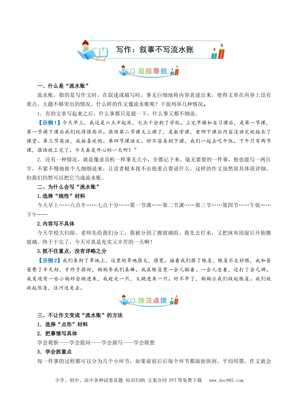 小学、初中、高中各种试卷真题知识归纳文案合同PPT等免费下载www.doc985.com写作:叙事不写流水账[来源:学科网ZXXK]一、什么是“流水账”流水账,指的是写作文时,在叙述或描写时,事无巨细地将内容表述出来,使得文章在内容上没有重点,主题不够突出的情况。什么样的作文像流水账呢?下面列举几种情况。1.有的文章写起来之后,什么事都只是提一下,什么事又都不细说。【示例1】今天早上,我还是六点半起床,七点十分到了学校。上完早操和自习课后,是第一节课,第一节课下课后我们玩得很高兴。很快第二节课又上课了,是数学课,老师下课后内容没讲完就拖长了课堂。第三节英语,我挺喜欢的。第四节课语文。好不容易到下课,我们一起去吃午饭。下午只有两节课,很快就上完了。今天真是开心的一天啊!”2.还有一种情况,就是像录音机一样事无大小,全都记下来。毫无紧要的一件事,他也能写一两百字,不紧不慢地挨个儿细细说来,让读者根本找不出他重点要说什么。这样的作文虽然很具体很详细,但我们仍然可以把它当成流水账。二、为什么会写“流水账”1.选择“线性”材料今天早上……六点半……七点十分……第一节课……第二节课……第三节……第四节……午饭……下午……2.内容写不具体今天学校大扫除。老师先给我们分工,我被分到了擦玻璃组。我先去打水,又把抹布浸湿后开始擦玻璃。终于干完了,今天可真是充实又辛苦的一天啊!3.抓不住重点,没有详略之分【示例2】我们来到了草地上,这里的草地很大,很宽。接着我们搭了帐篷,帐篷不太好搭,我和爸爸费了半天劲,才终于搭好,妈妈夸我们真棒。我在帐篷里一会儿躺着、一会儿坐着,还打了会几牌。我发现有一些小妈蚱会跳进来,我赶走一只,又跳进来一只。时不早了,妈妈让我们收起帐篷。我们就收起怅篷,往河边走去。三、不让作文变成“流水账”的方法1.选择“点形”材料2.把事情写具体学会观察——学会提问——学会描写——学会联想3.学会抓重点每一件事的过程都可以分为几个小环节,如果前前后后每个环节都面面俱到、平均用墨,作文就会小学、初中、高中各种试卷真题知识归纳文案合同PPT等免费下载www.doc985.com写成流水账;反之,如果我们抓住自己感受最深的一个环节去写,其余的简单带过或干脆不写,就能写出一篇重点突出的好文章。(1)慎审题,抓题眼——围绕题眼详写什么是题眼?题眼就是暗示作文的重点或中心的词语。比如《一个乐于助人的同学》,“乐于助人”就是题眼。怎样抓题眼?①单词题:题目就是题眼。如《悔恨》《关怀》等。②短语和句子题:题眼往往是修饰词,如《特别的礼物》中“特别”是题眼。③没有修饰词:题眼往往是动词。如《家乡变了》中的“变”是题眼。(2)合理安排结构①头不重:文章的开头并不一定要交代那么多东西才行,只要它能达到两个要点就够了:第一,要能围绕所要表达的中心思想引出下面的内容;第二,能吸引别人读下去。②脖不细:人的脖子起着连接大脑指挥部和身体阵地的作用,部分同学在写作文时,开头第一段说一件事,第二段说另一件事,两件事并没有必然或因果的联系,看文章的人根本不知道文章要重点说什么。我们可以把这种情况理解成“脖细”。因此我们在写作时要做到恰当运用铺垫的表现手法,它可以起到三个主要作用:承上启下、介绍故事发生的原由和设置伏笔。③腰不粗:有的同学刚开始写作文时,不管文章里写到多少字,都是三大段。作文宝宝除了“头”和“脚”之外,其它部分都堆成一坨了。层次不清,段落不明,重点不突出。因此,我们要注意作文的合理分段,一个意思则分一段,重点段落详写。④尾不大:文章的结尾应是重点要处理的部位,但好多同学在结尾处花的功夫却明显不够,好多结尾,往往都成了点缀,说明整个文章已经写完了,并没能发挥作用。好的结尾如画龙点睛。要简洁有力,收束全文,有引申,令人回味无穷。《一件珍贵的衬衫》,开头写了“在我的家里,珍藏着一种白色的确凉衬衫。”结尾写道:“四年来,这件珍贵的衬衫,我精心地收藏着,没有舍得穿它一次。”小兴安岭是一座巨大的宝库,也是一座美丽的大花园。——《美丽的小兴安岭》范文展示篮球比赛一年一度的...