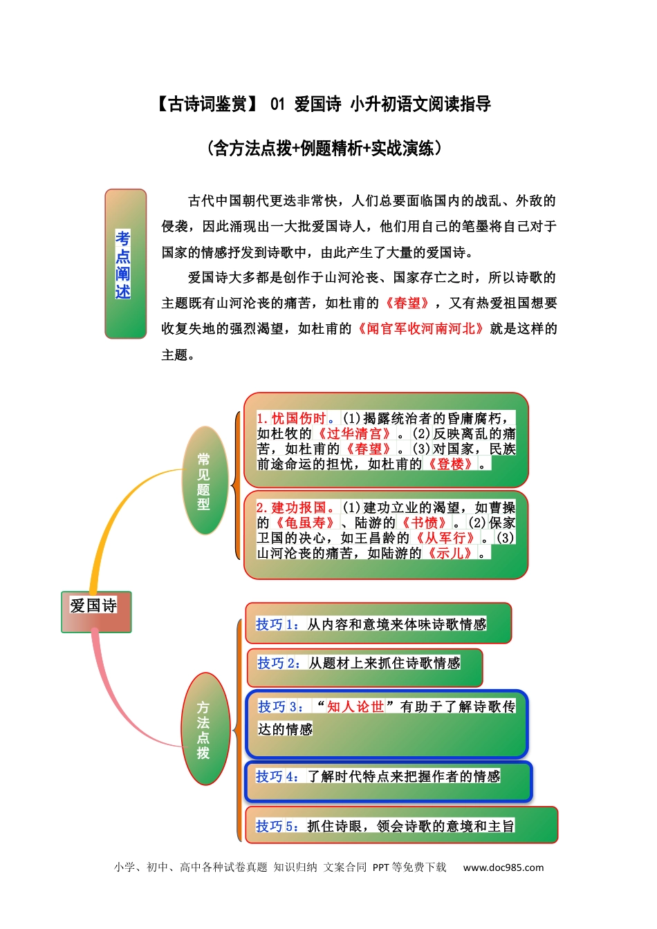 小学、初中、高中各种试卷真题知识归纳文案合同PPT等免费下载www.doc985.com【古诗词鉴赏】01爱国诗小升初语文阅读指导(含方法点拨+例题精析+实战演练)古代中国朝代更迭非常快,人们总要面临国内的战乱、外敌的侵袭,因此涌现出一大批爱国诗人,他们用自己的笔墨将自己对于国家的情感抒发到诗歌中,由此产生了大量的爱国诗。爱国诗大多都是创作于山河沦丧、国家存亡之时,所以诗歌的主题既有山河沦丧的痛苦,如杜甫的《春望》,又有热爱祖国想要收复失地的强烈渴望,如杜甫的《闻官军收河南河北》就是这样的主题。技巧4:了解时代特点来把握作者的情感2.建功报国。(1)建功立业的渴望,如曹操的《龟虽寿》、陆游的《书愤》。(2)保家卫国的决心,如王昌龄的《从军行》。(3)山河沦丧的痛苦,如陆游的《示儿》。技巧2:从题材上来抓住诗歌情感技巧1:从内容和意境来体味诗歌情感1.忧国伤时。(1)揭露统治者的昏庸腐朽,如杜牧的《过华清宫》。(2)反映离乱的痛苦,如杜甫的《春望》。(3)对国家,民族前途命运的担忧,如杜甫的《登楼》。常见题型爱国诗考点阐述方法点拨技巧3:“知人论世”有助于了解诗歌传达的情感技巧5:抓住诗眼,领会诗歌的意境和主旨小学、初中、高中各种试卷真题知识归纳文案合同PPT等免费下载www.doc985.com(一)从军行(其四)唐•王昌龄青海长云暗雪山①,孤城遥望玉门关②。黄沙百战穿金甲,不破楼兰终不还③。[注释]①青海:湖名,在今青海省。雪山:指祁连山。②玉门关:故址在今甘肃敦煌西北方盘城。③楼兰:汉时西域诸国之一,故址在今新疆罗布泊附近。1.一、二句写景对表现戍边将士有什么作用?▲技巧1【解析】:环境描写的作用有:1.交代事情发生的地点或背景增加事情的真实性;2.渲染气氛烘托人物的心情;3.寄托人物的思想感情;4.衬托反映人物的性格或品质;5.推动情节的发展;6.深化作品主题。先理解诗句内容,再联系主题分析其作用即可。【答案】:通过境界壮阔,环境恶劣的景物描写,衬托戍边将士不例题精析小学、初中、高中各种试卷真题知识归纳文案合同PPT等免费下载www.doc985.com畏艰难,守卫边疆的豪情壮志。2.诗中“黄沙百战穿金甲”句具有高度的概括性,请作具体分析。▲技巧2【解析】:要在理解诗句内容的基础上,紧扣古诗主题,逐词分析其表达作用。【答案】:“黄沙”形象地点出边塞战场的特征,“百战”极言战事之频繁,“穿金甲”是说金甲都磨穿了,形容时间之长,战斗之艰苦。短短七个字,高度概括了边地之荒凉,条件之恶劣,时间之漫长,战争之频繁艰难。(二)示儿陆游死去元①知万事空,但悲不见九州同。王师北定中原日,家祭无忘告乃翁。[注释]①元:同原。小学、初中、高中各种试卷真题知识归纳文案合同PPT等免费下载www.doc985.com1.写出下列各字的含义。①元:②但:③定:④无:【答案】:1.①原来。②只是③平定、收复④不要2.诗中的“乃翁”指的是谁?【答案】:2.“乃翁”指的是诗人自己。3.在正确的说法后面画“√”,错的画“×”。(1)这首诗一、二、四句押韵,韵脚是“空”“同”“翁”。()(2)“但悲不见九州同”其中“九州”指国家。()(3)这首诗的作者是宋朝陆游。()【答案】:(1)√(2)×(3)√3.4.这首诗中作者告诉我们他生平最遗憾的事是什么?他最希望看到什么?▲技巧3小学、初中、高中各种试卷真题知识归纳文案合同PPT等免费下载www.doc985.com【答案】:最遗憾的事没有看到祖国统一,希望祖国统一。(意思对即可)5.这首诗表现了诗人怎样的思想感情?▲技巧4【答案】:表现了诗人至死不忘祖国统一的爱国主义思想感情。5.用你自己的话讲讲这首诗的意思。【答案】:我本来知道,当我死后,人间的一切就都和我无关了;但唯一使我痛心的,就是我没能亲眼看到祖国的统一。因此,当大宋军队收复了中原失地的那一天到来之时,你们举行家祭,千万别忘把这好消息告诉你们的父亲!(一)闻官军收河南河北杜甫剑外忽传收蓟北,初闻涕泪满衣裳。实战演练小学、初中、高中各种试卷真题知识归纳文案合同PPT等免费下载www.doc985.com却看妻子愁何在,漫卷诗书喜欲狂。白日放歌须纵酒,青春作伴好还乡。即从巴峡穿巫峡,便下襄阳向洛...