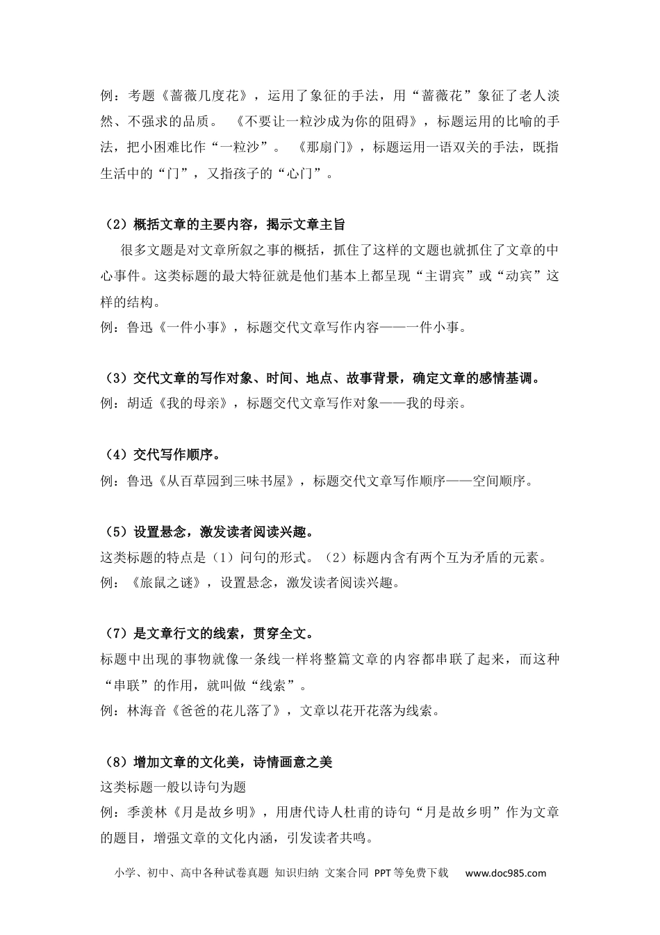 小学、初中、高中各种试卷真题知识归纳文案合同PPT等免费下载www.doc985.com专题十二标题的含义与作用【教学目标】1、了解标题的含义和作用2、能够运用标题的作用3、能够给文章起标题【重难点】能够熟悉标题的含义与作用,运用到阅读中。【知识梳理】文章的标题,通常称为文章的“题眼”。既然是“眼睛”,那一定是文章的主要内容,也即文章的精要内容的提炼、概括与浓缩。因此,理解文章的标题有助于我们读懂文章,把握文章的主要内容和情感倾向(实为文章核心)。【常考题型】1、文章以“xxxx”为题有什么好处?2、文章为什么以“xxxx”为题,请谈谈你的理解。3、通读全文,说说文章标题的含义。【标题的含义】1、先看标题的本义:标题的字面含义,文中记叙的内容(词语的含义,点明写作对象、概括文章主要内容),结合文章语境的含义。再思考深层含义:(1)修辞、手法:比喻、拟人、象征、双关等(2)与主旨的关系:点明中心、揭示主旨(3)与人物的关系:表明作品人物性格、表明作者的情感与态度、作者情感的小学、初中、高中各种试卷真题知识归纳文案合同PPT等免费下载www.doc985.com触发点2、理解标题含义的方法:把握文章的关键词语,联系全文内容——理解表层含义。抓住文章中的点题句,结合文章主旨——体会深层含义。点题句是理解深层含义的钥匙。3、答题步骤:先看标题的本义再思考深层含义,明确文章的对象及主要内容,再考虑文章的中心思想。4、答题格式:表层含义指……,深层含义指……(由表及里,由浅入深)例题1:一只小狗咬了金银匠的手指,巡官走来断案。在断案过程中,他根据狗是或不是将军家的这一基点而不断改变自己的面孔。奥楚蔑洛夫在短短的几分钟内,经历了五次变化.善变是奥楚蔑洛夫的性格特征。——《变色龙》解析:例题2:原来雪松之所以在大雪的重压之下弯下腰来,为的是不让自己折断,为的是往后的日子继续挺拔向上。原来,弯腰并非就是软弱,而是一份弹性,一种韧性,是生命的一种更深刻的睿智!弯腰并非毫无原则的妥协,而是一个人走向成熟的标志。对于外界的压力,我们要尽可能地去承受,在承受不住的时候,不妨弯一下腰。是的,有时弯腰就如同蝉蜕。那不是倒下,而是通过自身的改变,来创造一个全新的自我。——《成熟的稻谷会弯腰》解析:【标题的作用】文章标题的作用:总领全文、点明主旨、表达作者情感、表明作者写作目的。(1)标题运用的修辞手法或写作手法的作用,如象征、比喻、一语双关等。小学、初中、高中各种试卷真题知识归纳文案合同PPT等免费下载www.doc985.com例:考题《蔷薇几度花》,运用了象征的手法,用“蔷薇花”象征了老人淡然、不强求的品质。《不要让一粒沙成为你的阻碍》,标题运用的比喻的手法,把小困难比作“一粒沙”。《那扇门》,标题运用一语双关的手法,既指生活中的“门”,又指孩子的“心门”。(2)概括文章的主要内容,揭示文章主旨很多文题是对文章所叙之事的概括,抓住了这样的文题也就抓住了文章的中心事件。这类标题的最大特征就是他们基本上都呈现“主谓宾”或“动宾”这样的结构。例:鲁迅《一件小事》,标题交代文章写作内容——一件小事。(3)交代文章的写作对象、时间、地点、故事背景,确定文章的感情基调。例:胡适《我的母亲》,标题交代文章写作对象——我的母亲。(4)交代写作顺序。例:鲁迅《从百草园到三味书屋》,标题交代文章写作顺序——空间顺序。(5)设置悬念,激发读者阅读兴趣。这类标题的特点是(1)问句的形式。(2)标题内含有两个互为矛盾的元素。例:《旅鼠之谜》,设置悬念,激发读者阅读兴趣。(7)是文章行文的线索,贯穿全文。标题中出现的事物就像一条线一样将整篇文章的内容都串联了起来,而这种“串联”的作用,就叫做“线索”。例:林海音《爸爸的花儿落了》,文章以花开花落为线索。(8)增加文章的文化美,诗情画意之美这类标题一般以诗句为题例:季羡林《月是故乡明》,用唐代诗人杜甫的诗句“月是故乡明”作为文章的题目,增强文章的文化内涵,引发读者共鸣。小学、初中、高中各种试卷真题知识归纳文案合同PPT等免费下载www.doc985.com注:每个题目的作用往往不...
