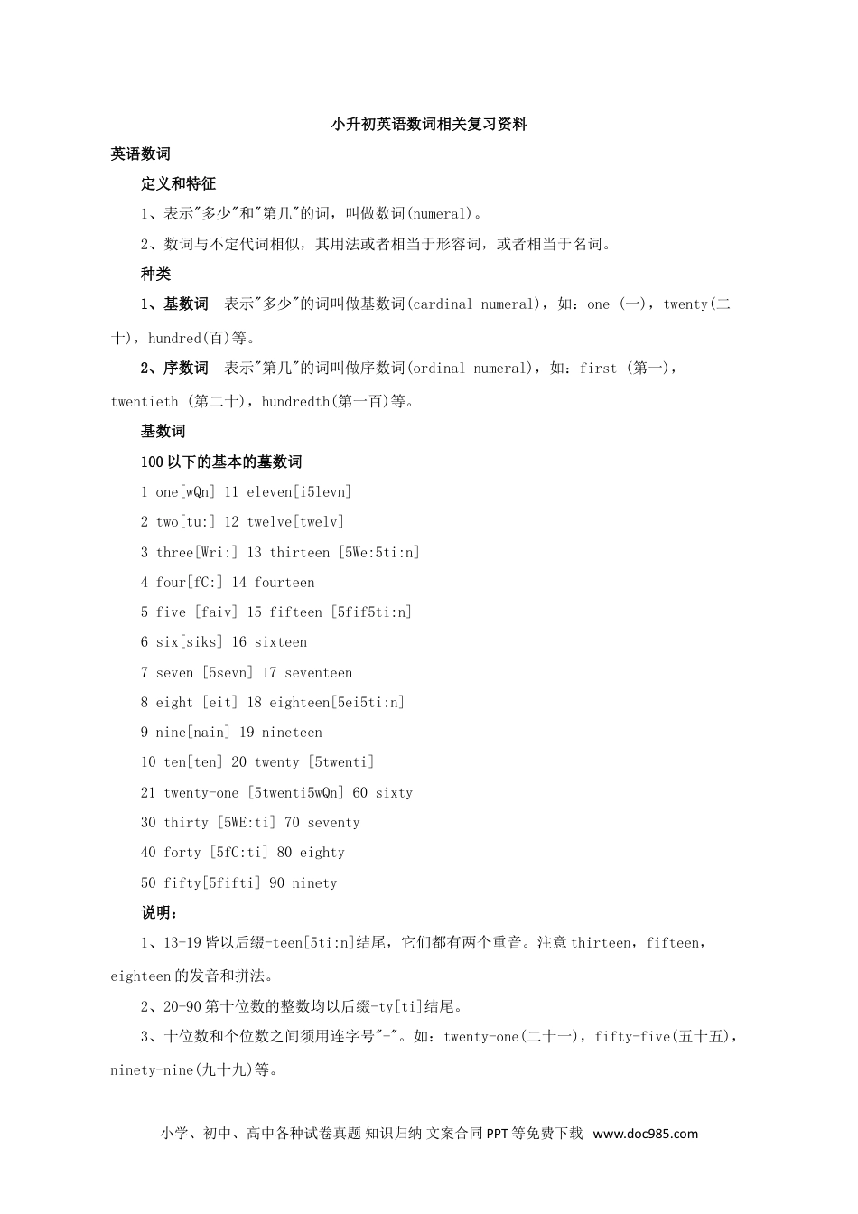 小升初英语数词相关复习资料英语数词定义和特征1、表示"多少"和"第几"的词,叫做数词(numeral)。2、数词与不定代词相似,其用法或者相当于形容词,或者相当于名词。种类1、基数词表示"多少"的词叫做基数词(cardinalnumeral),如:one(一),twenty(二十),hundred(百)等。2、序数词表示"第几"的词叫做序数词(ordinalnumeral),如:first(第一),twentieth(第二十),hundredth(第一百)等。基数词100以下的基本的墓数词1one[wQn]11eleven[i5levn]2two[tu:]12twelve[twelv]3three[Wri:]13thirteen[5We:5ti:n]4four[fC:]14fourteen5five[faiv]15fifteen[5fif5ti:n]6six[siks]16sixteen7seven[5sevn]17seventeen8eight[eit]18eighteen[5ei5ti:n]9nine[nain]19nineteen10ten[ten]20twenty[5twenti]21twenty-one[5twenti5wQn]60sixty30thirty[5WE:ti]70seventy40forty[5fC:ti]80eighty50fifty[5fifti]90ninety说明:1、13-19皆以后缀-teen[5ti:n]结尾,它们都有两个重音。注意thirteen,fifteen,eighteen的发音和拼法。2、20-90第十位数的整数均以后缀-ty[ti]结尾。3、十位数和个位数之间须用连字号"-"。如:twenty-one(二十一),fifty-five(五十五),ninety-nine(九十九)等。小学、初中、高中各种试卷真题知识归纳文案合同PPT等免费下载www.doc985.com100以上的基本的基数词100hundred[5hQndrid]1,000thousand[5WauzEnd]1,000,000million[5niljEn]百万100,000,000hundredmillion一亿1,000million(=billion)十亿499fourhundredandninety-nine(101-999如此构成)3,876threethousandeighthundredandseventy-six(1001-9999皆如此构成)57,453fifty-seventhousandfourhundredandfifty-three(10001-99999)皆如此构成)768,921sevenhundredsixty-eightthousandninehundredandtwenty-one8,641,457eightmillionsixhundredforty-onethousandfourhundredandfifty-seven50,000,000fiftymillion500,000,000fivehundredmillion5,000,000,000fivethousandmillion(或fivebillion)50,000,000,000fiftythousandmillion(或fiftybillion)说明:1)100和100以上的基数词须用hundred,thousand,million,billion等。2)十位数与百位数之间有and。但也有不用and的情况,如850可以读作eighthundredfifty。基数词的用法基数词在句中可用作下列句子成分:1、主语Twoplusnineiseleven.二加九等于十一。Fourtimessixistwenty-four.四乘六得二十四。Threeofthemwenttocollegelastyear.他们当中去年有三人上大学了。(如说thethreeofthem,意思则是"他们三个人")2、宾语Givemetwo.给我两个。3、定语Therearenineteenstudentsinourclass.我们班有十九个同学。Myuncleboughttwohandtractorsrecently.我叔叔最近买了两台手扶拖拉机。小学、初中、高中各种试卷真题知识归纳文案合同PPT等免费下载www.doc985.com(注)hundred(百),thousand(千)和million(百万)作定语用时一律不用复数;作名词用(后面多跟of短语)时则用复数。如:Ourcountryhasapopulationofl,200millionpeople.我国有十二亿人口。Therearethreethousandstudentsintheuniversity.这所大学有三千学生。RicehasbeencultivatedintheEastforthousandsofyears.水稻在东方已经种植了几千年。Maizeisthemostimportantfoodcropformillionsofpeopleintheworld.玉米是全世界千百万人最主要的粮食。4、表语Sheisjustfourteen.她刚十四岁。HewasalreadyfortywhenhebegantolearnEnglish他开始学英语时已经四十岁了。序数词1-99的基本的序数词序数词缩写式汉译first[fE:st]lst第一second[5sekEnd]2nd第二third[We:d]3rd第三fouth[fC:W]4th第四fifth[fifW]5th第五sixth[siksW]6th第六seventh[5sevenW]7th第七eighth[eitW]8th第八ninth[nainW]9th第九tenth[tenW]10th第十eleventh11th第十一twelfth[twelfW]12th第十二thirteenth13th第十三nineteenth19th第十九twentieth[5twentiiW]20th第二十fortieth40th第四十fifty-first51st第五十一sixty-second62nd第六十二小学、初中、高中各种试卷真题知识归纳文案合同PPT等免费下载www.doc985.comeighty-third83rd第八十三ninety-fourth94th...