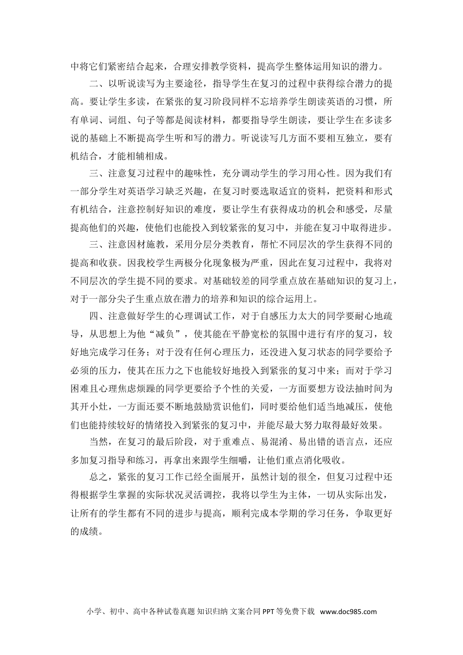 小学英语复习计划小学英语复习计划素质教育改革以来,课时少,资料多,一学期下来随之问题也多了,主要表此刻:学生基础普遍较差,学习习惯差,两极分化现象极为严重,学困生比较多,还有几个十分个性的学生。针对目前现状,在复习过程中我准备以听说读写为主要的形式和抓手,以英语基础知识为主要资料,指导学生在听说读写的过程中系统地梳理所学知识,从单词到词组到句子到短文,全面把握所学资料。一、全面复习抓基础,帮忙学生全面地系统地复习所学过的知识。(一)过好单词关。1、按词性归类复习单词。2、按所含元音字母及字母组合归类复习单词。3、按词汇表复习单词。加强单词的朗读与默写,给学生明确的任务,并采用短频快的方式,这样学生一方面能够做好充分准备,一方面容易获得成功。当然对于极个别学困生来说,还要区别对待,给他们适当降低难度和要求,使他们也能尽最大努力过好单词关。(二)过好词组关。词组是学习英语的关键,它是复习单词的良好途径,同时又是学习句子的基础。我准备将词组复习与单词分类复习相联系,在复习的同时一齐复习词组让学生在复习的同时掌握词组构成的规律。(三)过好句子关。1、指导学生在语境中复习句子,让学生分清日常交际用语的运用场合。2、根据句子类型指导学生在比较中复习句子,教给学生适当的语法知识。3、指导学生在表演中运用句子,使复习课同样生动搞笑。(四)过好阅读关。阅读短文能让学生全面运用所学知识,因此指导学生认真阅读也是英语复习的重要环节,在复习过程中我准备充分运用好《金钥匙》这本书,以它为复习英语阅读的载体,做到精读和导读相结合,在较短的时间内起到较高的效率。总而言之,要把单词、词组、句子和短文作为一个有机整体,在复习过程小学、初中、高中各种试卷真题知识归纳文案合同PPT等免费下载www.doc985.com中将它们紧密结合起来,合理安排教学资料,提高学生整体运用知识的潜力。二、以听说读写为主要途径,指导学生在复习的过程中获得综合潜力的提高。要让学生多读,在紧张的复习阶段同样不忘培养学生朗读英语的习惯,所有单词、词组、句子等都是阅读材料,都要指导学生朗读,要让学生在多读多说的基础上不断提高学生听和写的潜力。听说读写几方面不要相互独立,要有机结合,才能相辅相成。三、注意复习过程中的趣味性,充分调动学生的学习用心性。因为我们有一部分学生对英语学习缺乏兴趣,在复习时要选取适宜的资料,把资料和形式有机结合,注意控制好知识的难度,要让学生有获得成功的机会和感受,尽量提高他们的兴趣,使他们也能投入到较紧张的复习中,并能在复习中取得进步。三、注意因材施教,采用分层分类教育,帮忙不同层次的学生获得不同的提高和收获。因我校学生两极分化现象极为严重,因此在复习过程中,我将对不同层次的学生提不同的要求。对基础较差的同学重点放在基础知识的复习上,对于一部分尖子生重点放在潜力的培养和知识的综合运用上。四、注意做好学生的心理调试工作,对于自感压力太大的同学要耐心地疏导,从思想上为他“减负”,使其能在平静宽松的氛围中进行有序的复习,较好地完成学习任务;对于没有任何心理压力,还没进入复习状态的同学要给予必须的压力,使其在压力之下也能较好地投入到紧张的复习中来;而对于学习困难且心理焦虑烦躁的同学更要给予个性的关爱,一方面要想方设法抽时间为其开小灶,一方面还要不断地鼓励赏识他们,同时要给他们适当地减压,使他们也能持续较好的情绪投入到紧张的复习中,并能尽最大努力取得最好效果。当然,在复习的最后阶段,对于重难点、易混淆、易出错的语言点,还应多加复习指导和练习,再拿出来跟学生细嚼,让他们重点消化吸收。总之,紧张的复习工作已经全面展开,虽然计划的很全,但复习过程中还得根据学生掌握的实际状况灵活调控,我将以学生为主体,一切从实际出发,让所有的学生都有不同的进步与提高,顺利完成本学期的学习任务,争取更好的成绩。小学、初中、高中各种试卷真题知识归纳文案合同PPT等免费下载www.doc985.com小学、初中、高中各种试卷真题知识归纳文案合同PPT等免费下载www.doc985.com