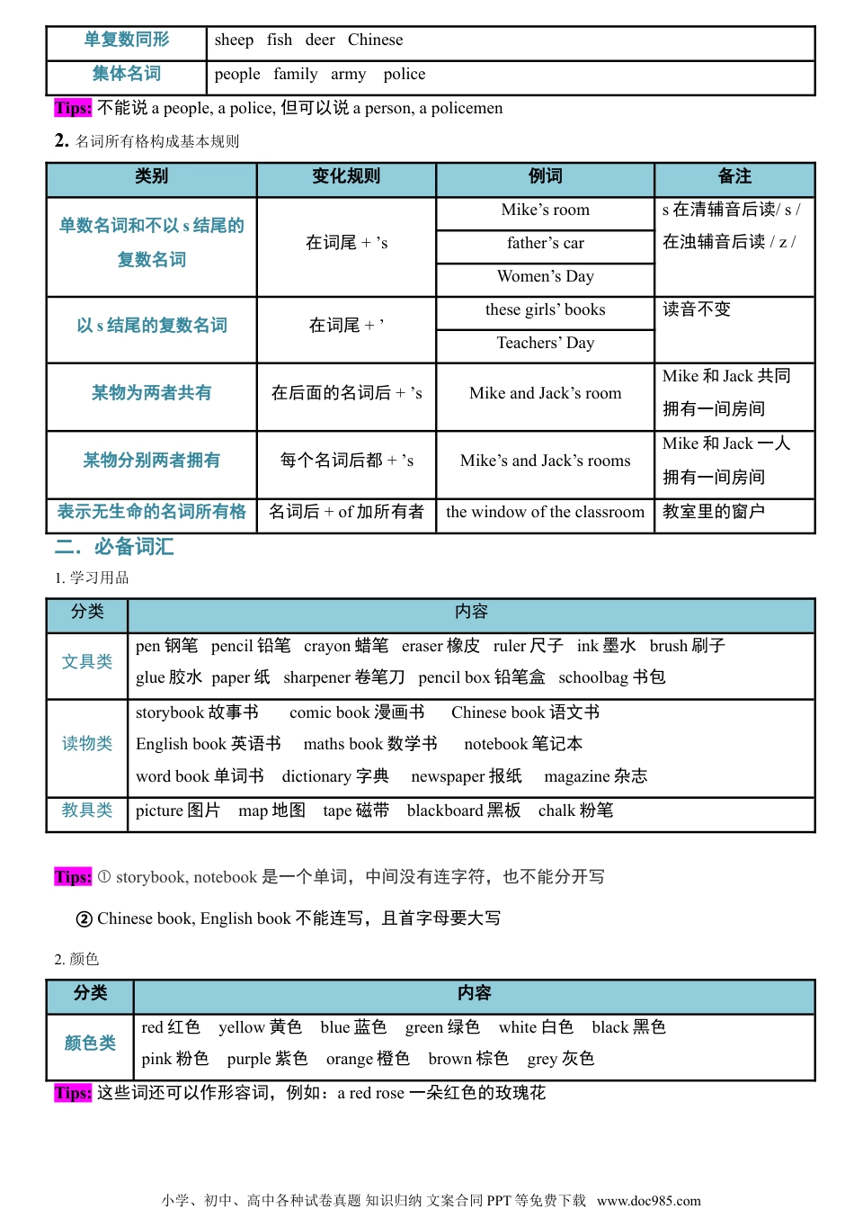 词汇名词(Nouns)一.考点精讲1.可数名词的复数变化基本规则类别变化规则例词读音一般情况在词尾+sdesk--desks-s在清辅音后读作/s/bag--bags-s在浊辅音后读作/z/students--students-ts读作/ts/kid--kids-ds读作/dz/以s,x,sh,,ch结尾的词在词尾+esbus--buses-es读作/ɪz/box--boxesdish--dishespeach--peaches以辅音字母+y结尾的词把y变i再+escity--cities-ies读作/ɪz/baby--babies以f,fe结尾的词把f或fe变v再+esleaf--leaves-ves读作/vz/knife--knives以o结尾的词在词尾+espotato--potatoes-es或-s读作/z/tomato--tomatoes在词尾+szoo--zoosphoto--photosTips:①maths,news是不可数名词,不是名词复数形式②把f或fe变v再+es的辅助以及口诀:妻子拿刀去宰狼,小偷见了心发慌。躲在架后保己命,半片树叶遮目光。1.名词复数的其他变化类别例词不规则复数形式child--childrentooth--teethwoman--womenfoot--feetgoose--geese(鹅)man--menmouse--miceox--oxen(公牛)小学、初中、高中各种试卷真题知识归纳文案合同PPT等免费下载www.doc985.com单复数同形sheepfishdeerChinese集体名词peoplefamilyarmypoliceTips:不能说apeople,apolice,但可以说aperson,apolicemen2.名词所有格构成基本规则类别变化规则例词备注单数名词和不以s结尾的复数名词在词尾+’sMike’srooms在清辅音后读/s/在浊辅音后读/z/father’scarWomen’sDay以s结尾的复数名词在词尾+’thesegirls’books读音不变Teachers’Day某物为两者共有在后面的名词后+’sMikeandJack’sroomMike和Jack共同拥有一间房间某物分别两者拥有每个名词后都+’sMike’sandJack’sroomsMike和Jack一人拥有一间房间表示无生命的名词所有格名词后+of加所有者thewindowoftheclassroom教室里的窗户二.必备词汇1.学习用品分类内容文具类pen钢笔pencil铅笔crayon蜡笔eraser橡皮ruler尺子ink墨水brush刷子glue胶水paper纸sharpener卷笔刀pencilbox铅笔盒schoolbag书包读物类storybook故事书comicbook漫画书Chinesebook语文书Englishbook英语书mathsbook数学书notebook笔记本wordbook单词书dictionary字典newspaper报纸magazine杂志教具类picture图片map地图tape磁带blackboard黑板chalk粉笔Tips:①storybook,notebook是一个单词,中间没有连字符,也不能分开写②Chinesebook,Englishbook不能连写,且首字母要大写2.颜色分类内容颜色类red红色yellow黄色blue蓝色green绿色white白色black黑色pink粉色purple紫色orange橙色brown棕色grey灰色Tips:这些词还可以作形容词,例如:aredrose一朵红色的玫瑰花小学、初中、高中各种试卷真题知识归纳文案合同PPT等免费下载www.doc985.com3.身体、器官分类内容身体类head头face脸neck脖子shoulder肩膀body身体arm手臂hand手leg腿finger手指foot脚back背部knee膝盖器官类eye眼睛ear耳朵mouth嘴巴nose鼻子heart心脏stomach胃Tips:①foot的复数形式为feet②要注意区分head和hand的读音4.动物、植物分类内容动物类cat猫dog狗pig猪rabbit兔子horse马elephant大象duck鸭子fish鱼bird鸟snake蛇mouse老鼠monkey猴子panda熊猫bear熊lion狮子tiger老虎fox狐狸giraffe长颈鹿deer鹿goose鹅hen母鸡sheep绵羊goat山羊cow奶牛lamb羔羊dragon龙frog青蛙wolf狼zebra斑马ant蚂蚁dinosaur恐龙kangaroo袋鼠植物类tree树flower花grass草plant植物leaf叶子rose玫瑰jasmine茉莉root根bamboo竹子Tips:①plant除了表示名词,还可以表示动词,意思是“种植”②注意这些单词的复数形式:mouse--micegoose--geesefish--fishdeer--deersheep--sheepwolf--wolvesgiraffe--giraffes5.食品、饮品分类内容食品类bread面包beef牛肉cake蛋糕chicken鸡肉hamburger汉堡包fish鱼hotdog热狗egg鸡蛋noodles面条icecream冰淇淋meat肉mutton羊肉tofu豆腐pork猪肉chocolate巧克力rice米饭pizza比萨饼salad沙拉vegetable蔬菜sandwich三明治soup汤饮品类water水Coke可乐tea茶milk牛奶coffee咖啡juice果汁Tips:①fish表示“鱼”时,时可数名词;当表示“鱼肉”时,时不可数名词。②上表中饮品类单词都是不可数名词。6.人物分类内容小学、初中、高中各种试卷真...