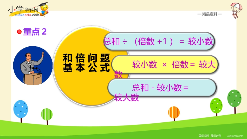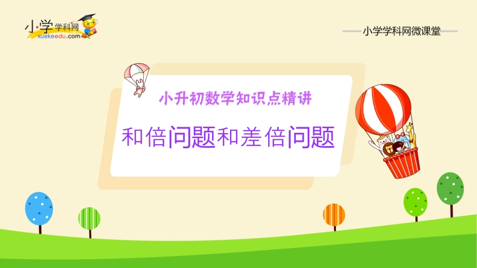 和倍和差倍问题问题重点透视重点1已知两个数的和及大数是小数的几倍(或小数是大数的几分之几),求这两个数各是多少。这类问题叫做和倍问题。和倍问题重点2和倍问题基本公式较小数×倍数=较大数总和÷(倍数+1)=较小数总和-较小数=较大数重点3已知两个数的差及大数是小数的几倍(或小数是大数的几分之几),求这两个数各是多少。这类问题叫做和差问题。和差问题重点4较小的数×倍数=较大的数差倍问题基本公式差÷(倍数-1)=较小的数题1源解析题图书馆科技书和故事书共230本,故事书的本数比科技书的3倍少10本,科技书和故事书各有多少本?“1”科技书:230个少10本故事书:?本?本3倍画图分析把科技书的本数看作1倍的数,那么230+10=240(本)相当于科技书的4倍。230+10=240(本)1+3=4240÷4=60(本)60×3-10=170(个)答:科技术有60本,故事书有170本。题2某车间女职工人数是男职工的,男职工比女职工多90人,这个车间男女职工各有多少人?女职工:41男职工:90人?人3倍画图分析?人把女职工的人数看作1倍,男职工人数比女职工多3倍,正好多90人。4-1=390÷3=30(人)30×4=120(人)答:女职工有60人,男职工有120人。易点错拨易错1一个长方形菜地的周长是36米,长是宽的2倍。长和宽各是多少米?错析1+2=336÷3=12(米)12×2=24(米)答:宽是12米,长是24米。长方形的周长等于两个长和两个宽的和,先求出一个长和一个宽的和。错解1+2=336÷2÷3=6(米)6×2=12(米)答:宽是6米,长是12米。易错2甲乙两个数的差是5.49,将甲数的小数点向左移动一位,就等于乙数。甲数是多少?乙数是多少?5.49÷10=0.5490.549+5.49=6.039答:甲数是6.039乙数是0.549。错解:错析:甲数是乙数的10倍,那么甲数比乙数多9倍,先求出较小的数。10-1=95.49÷9=0.610.61×10=6.1答:甲数是6.1,乙数是0.61。归纳总结和倍问题差倍问题关键是找到两个数量的和(或差)与两个数量的倍数的和(或差)的对应关系。