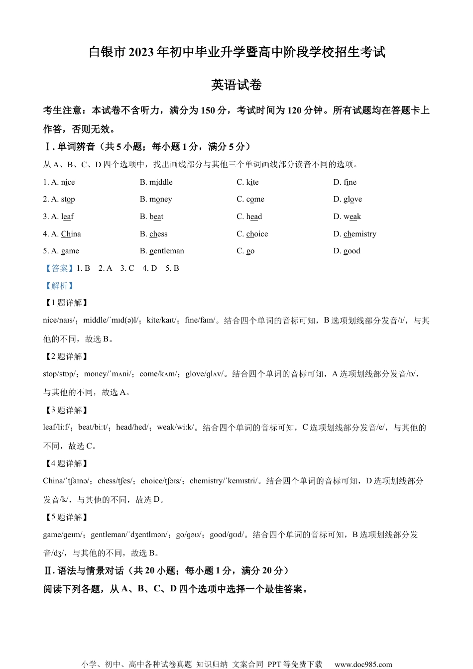 小学、初中、高中各种试卷真题知识归纳文案合同PPT等免费下载www.doc985.com白银市2023年初中毕业升学暨高中阶段学校招生考试英语试卷考生注意:本试卷不含听力,满分为150分,考试时间为120分钟。所有试题均在答题卡上作答,否则无效。Ⅰ.单词辨音(共5小题;每小题1分,满分5分)从A、B、C、D四个选项中,找出画线部分与其他三个单词画线部分读音不同的选项。1.A.niceB.middleC.kiteD.fine2.A.stopB.moneyC.comeD.glove3.A.leafB.beatC.headD.weak4.A.ChinaB.chessC.choiceD.chemistry5.A.gameB.gentlemanC.goD.good【答案】1.B2.A3.C4.D5.B【解析】【1题详解】nice/naɪs/;middle/ˈmɪd(ə)l/;kite/kaɪt/;fine/faɪn/。结合四个单词的音标可知,B选项划线部分发音/ɪ/,与其他的不同,故选B。【2题详解】stop/stɒp/;money/ˈmʌni/;come/kʌm/;glove/ɡlʌv/。结合四个单词的音标可知,A选项划线部分发音/ɒ/,与其他的不同,故选A。【3题详解】leaf/liːf/;beat/biːt/;head/hed/;weak/wiːk/。结合四个单词的音标可知,C选项划线部分发音/e/,与其他的不同,故选C。【4题详解】China/ˈtʃaɪnə/;chess/tʃes/;choice/tʃɔɪs/;chemistry/ˈkemɪstri/。结合四个单词的音标可知,D选项划线部分发音/k/,与其他的不同,故选D。【5题详解】game/ɡeɪm/;gentleman/ˈdʒentlmən/;go/ɡəʊ/;good/ɡʊd/。结合四个单词的音标可知,B选项划线部分发音/dʒ/,与其他的不同,故选B。Ⅱ.语法与情景对话(共20小题;每小题1分,满分20分)阅读下列各题,从A、B、C、D四个选项中选择一个最佳答案。小学、初中、高中各种试卷真题知识归纳文案合同PPT等免费下载www.doc985.com6.Thereare60minutesin________hour.A.aB.anC.theD./【答案】B【解析】【详解】句意:一小时有六十分钟。考查冠词。此处是表示泛指,且hour是以元音音素开头,应用an,故选B。7.Put________firstandbecarefulwhileridingontheroad!A.interestB.moneyC.knowledgeD.safety【答案】D【解析】【详解】句意:把安全放在第一位,在路上骑行时要小心!考查名词辨析。interest兴趣;money钱;knowledge知识;safety安全。根据“becarefulwhileridingontheroad”可知路上骑车时要小心,要把安全放第一位。故选D。8.—What’sthirtyandten?—It’s________.A.fortyB.fiftyC.seventyD.eighty【答案】A【解析】【详解】句意:——三十加十是多少?——四十。考查数字运算。forty四十;fifty五十;seventy七十;eighty八十。根据“What’sthirtyandten”以及常识可知三十加十是四十。故选A。9.That’s________.That’sthemanIwastalkingabout.A.meB.herC.himD.it【答案】C【解析】【详解】句意:就是他。那就是我说的那个人。考查代词辨析。me我;her她;him他;it它。根据“That’sthemanIwastalkingabout.”可知此处指男性,且表示“他”,需用代词him。故选C。10.ThecatinPicture________isonthebox.A.B.C.D.【答案】B小学、初中、高中各种试卷真题知识归纳文案合同PPT等免费下载www.doc985.com【解析】【详解】句意:图片B中的猫在盒子上。考查方位介词。图片A的猫在盒子里面;图片B在盒子上面且接触;图片C在盒子旁边;图片D在盒子上方且不接触,用over。onthebox“在盒子上且接触”。故选B。11.Let’swait________therainstops.A.soB.whileC.sinceD.until【答案】D【解析】【详解】句意:让我们等雨停。考查连词辨析。so因此;while然而;since自从;until直到……。根据“Let’swait…therainstops.”可知,此处指等着直到雨停,用until引导时间状语从句。故选D。12.There________abigtreebehindtheshop.Youcanseemanybirdsinit.A.isB.areC.wasD.were【答案】A【解析】【详解】句意:商店后面有一棵大树。你可以在里面看到许多鸟。考查时态和主谓一致。根据“There...abigtreebehindtheshop.”可知陈述客观事实,用一般现在时,主语“abigtree”是单数,be动词用is。故选A。13.—________doyouexercise?—Everyday.A.HowmanyB.HowoldC.HowmuchD.Howoften【答案】D【解析】【详解】句意:——你多...