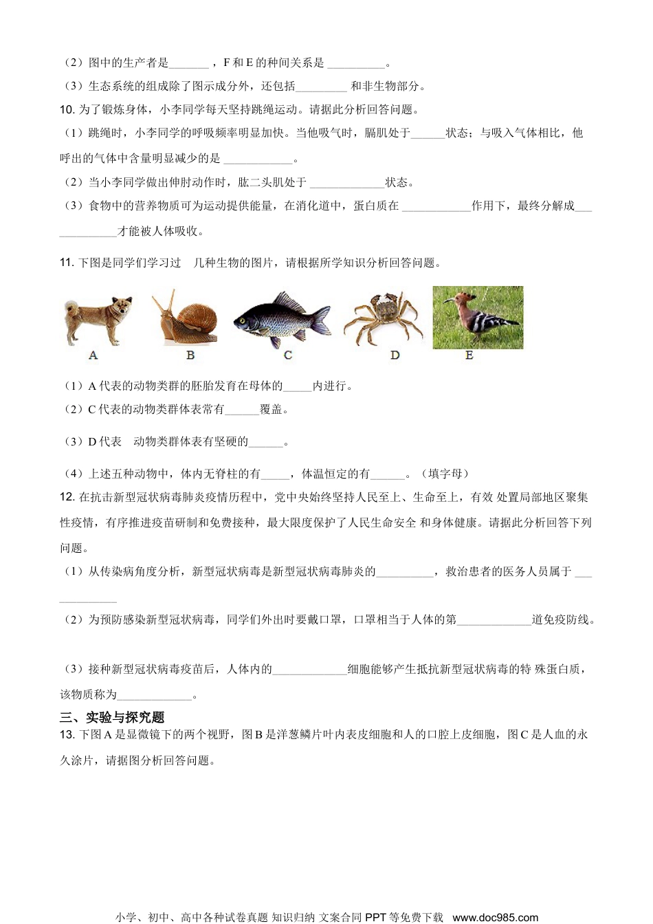甘肃2021年初中毕业与高中阶段招生考试生物试题一、单项选择题1.河西走廊戈壁滩上生活的蜥蜴体色大都是黄褐色,这种现象说明A.环境能够适应生物B.生物能够适应环境C.环境能够影响生物D.生物能够影响环境2.绿萝卜根的地上部分是绿色的,而埋在土里的部分是白色的,这是因为A.线粒体在光下才能形成B.叶绿素在光下才能形成C.绿萝卜下半部分没有液泡D.绿萝卜下半部分不进行呼吸作用3.下列食物中,富含维生素C的一组是()A.橙子、柑橘B.牛肉、羊肉C.馒头、大饼D.牛奶、鸡蛋4.取健康人的血浆、原尿和尿液3种样本进行分析比较,三个样本中都有的物质是()A.蛋白质B.葡萄糖C.氨基酸D.尿素5.教育部近日印发通知,明确初中生每天睡眠时间应达到9小时。其主要原因是人在睡眠状态下,垂体能分泌较多的促进生长发育的激素,这种激素是()A.甲状腺激素B.胰岛素C.生长激素D.性激素6.静宁苹果色泽鲜艳、质细汁多、耐于储藏,畅销国内、远销国外。为了提高品质和产量,果农常采用嫁接技术进行培育,嫁接技术的关键是A.剪去接穗的叶片B.人工辅助授粉C.给果树多施肥D.使接穗和砧木的形成层紧密结合7.男性产生精子、分泌雄性激素的器官分别是()A.睾丸、睾丸B.附睾、睾丸C.睾丸、阴茎D.睾丸、前列腺8.制作下列发酵食品时,利用微生物错误的是()A.利用酵母菌制作酒精B.利用霉菌制作豆瓣酱C.利用大肠杆菌制作陈醋D.利用乳酸菌制作酸奶二、分析说明题9.平凉市崆峒山是国家首批5A级旅游景区,集自然景观和人文底蕴于一体,拥有丰富的动植物资源。下图为崆峒山景区一些生物组成的食物网,请据此分析回答问题。(1)该食物网有______条食物链。小学、初中、高中各种试卷真题知识归纳文案合同PPT等免费下载www.doc985.com(2)图中的生产者是_______,F和E的种间关系是__________。(3)生态系统的组成除了图示成分外,还包括_________和非生物部分。10.为了锻炼身体,小李同学每天坚持跳绳运动。请据此分析回答问题。(1)跳绳时,小李同学的呼吸频率明显加快。当他吸气时,膈肌处于______状态;与吸入气体相比,他呼出的气体中含量明显减少的是____________。(2)当小李同学做出伸肘动作时,肱二头肌处于_____________状态。(3)食物中的营养物质可为运动提供能量,在消化道中,蛋白质在____________作用下,最终分解成_____________才能被人体吸收。11.下图是同学们学习过的几种生物的图片,请根据所学知识分析回答问题。(1)A代表的动物类群的胚胎发育在母体的_____内进行。(2)C代表的动物类群体表常有______覆盖。(3)D代表的动物类群体表有坚硬的______。(4)上述五种动物中,体内无脊柱的有_____,体温恒定的有______。(填字母)12.在抗击新型冠状病毒肺炎疫情历程中,党中央始终坚持人民至上、生命至上,有效处置局部地区聚集性疫情,有序推进疫苗研制和免费接种,最大限度保护了人民生命安全和身体健康。请据此分析回答下列问题。(1)从传染病角度分析,新型冠状病毒是新型冠状病毒肺炎的__________,救治患者的医务人员属于_____________(2)为预防感染新型冠状病毒,同学们外出时要戴口罩,口罩相当于人体的第_____________道免疫防线。(3)接种新型冠状病毒疫苗后,人体内的_____________细胞能够产生抵抗新型冠状病毒的特殊蛋白质,该物质称为_____________。三、实验与探究题13.下图A是显微镜下的两个视野,图B是洋葱鳞片叶内表皮细胞和人的口腔上皮细胞,图C是人血的永久涂片,请据图分析回答问题。小学、初中、高中各种试卷真题知识归纳文案合同PPT等免费下载www.doc985.com(1)图A中,要将视野中的细胞从左下方移至中央,应向_______方移动装片;欲换高倍镜观察时,需转动__。(2)制作洋葱鳞片叶内表皮细胞临时装片时,一般用_____________进行染色。(3)制作人的口腔上皮细胞临时装片时,擦拭干净载玻片后,需在载玻片中央滴一滴_____________。(4)与洋葱鳞片叶内表皮细胞相比,人的口腔上皮细胞不具有的结构是_____________和液泡。(5)用显微镜观察人血永久涂片时,视野中数量最多的血细胞是_______,体积最大的血细胞是____________。14.在农业生产中,农民常在播...