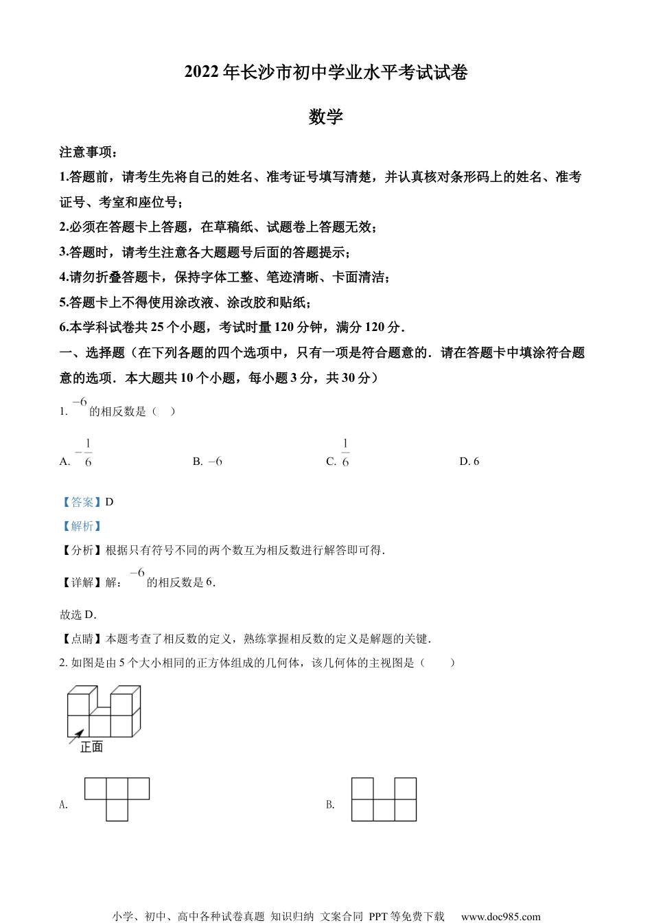 小学、初中、高中各种试卷真题知识归纳文案合同PPT等免费下载www.doc985.com2022年长沙市初中学业水平考试试卷数学注意事项:1.答题前,请考生先将自己的姓名、准考证号填写清楚,并认真核对条形码上的姓名、准考证号、考室和座位号;2.必须在答题卡上答题,在草稿纸、试题卷上答题无效;3.答题时,请考生注意各大题题号后面的答题提示;4.请勿折叠答题卡,保持字体工整、笔迹清晰、卡面清洁;5.答题卡上不得使用涂改液、涂改胶和贴纸;6.本学科试卷共25个小题,考试时量120分钟,满分120分.一、选择题(在下列各题的四个选项中,只有一项是符合题意的.请在答题卡中填涂符合题意的选项.本大题共10个小题,每小题3分,共30分)1.的相反数是()A.B.C.D.6【答案】D【解析】【分析】根据只有符号不同的两个数互为相反数进行解答即可得.【详解】解:的相反数是6.故选D.【点睛】本题考查了相反数的定义,熟练掌握相反数的定义是解题的关键.2.如图是由5个大小相同的正方体组成的几何体,该几何体的主视图是()A.B.小学、初中、高中各种试卷真题知识归纳文案合同PPT等免费下载www.doc985.comC.D.【答案】B【解析】【分析】根据从正面看的图形是主视图即可求解.【详解】解:该几何体的主视图是故选B.【点睛】考查几何体的三视图的知识,从正面看的图形是主视图,从左面看到的图形是左视图,从上面看到的图象是俯视图.掌握以上知识是解题的关键.3.下列说法中,正确的是()A.调查某班45名学生的身高情况宜采用全面调查B.“太阳东升西落”是不可能事件C.为了直观地介绍空气各成分的百分比,最适合使用的统计图是条形统计图D.任意投掷一枚质地均匀的硬币26次,出现正面朝上的次数一定是13次【答案】A【解析】【分析】根据全面调查与普查,随机事件,必然事件,统计图的选择,逐项分析判断即可求解.【详解】解:A.调查某班45名学生的身高情况宜采用全面调查,故该选项正确,符合题意;B.“太阳东升西落”是必然事件,故该选项不正确,不符合题意;C.为了直观地介绍空气各成分的百分比,最适合使用的统计图是扇形统计图,故该选项不正确,不符合题意;D.任意投掷一枚质地均匀的硬币26次,出现正面朝上的次数可能是13次,故该选项不正确,不符合题意;故选A【点睛】本题考查了全面调查与普查,随机事件,必然事件,统计图的选择,掌握以上知识是解题的关键.根据确定事件和随机事件的定义来区分判断即可,必然事件和不可能事件统称确定性事件;必然事件:在一定条件下,一定会发生的事件称为必然事件;不可能事件:在一定条件下,一定不会发生的事件称为不可能事件;随机事件:在一定条件下,可能发生也可能不发生的事件称为随机事件.条形统计图能很容易看出数量的多少;折线统计图不仅容易看出数量的多少,而且能反映数量的增减变化情况;扇形统计图能小学、初中、高中各种试卷真题知识归纳文案合同PPT等免费下载www.doc985.com反映部分与整体的关系;由普查得到的调查结果比较准确,但所费人力、物力和时间较多,而抽样调查得到的调查结果比较近似,由此根据情况选择即可.4.下列计算正确的是()A.B.C.D.【答案】A【解析】【分析】根据同底数幂的除法,合并同类项,单项式的乘法,完全平方公式逐项分析判断即可求解.【详解】解:A.,故该选项正确,符合题意;B.,故该选项不正确,不符合题意;C.,故该选项不正确,不符合题意;D.,故该选项不正确,不符合题意;故选A【点睛】本题考查了同底数幂的除法,合并同类项,单项式的乘法,完全平方公式,掌握运算法则以及乘法公式是解题的关键.5.在平面直角坐标系中,点关于原点对称的点的坐标是()A.B.C.D.【答案】D【解析】【分析】根据关于原点对称的两个点,横坐标、纵坐标分别互为相反数,即可求解.【详解】解:点关于原点对称的点的坐标是.故选D.【点睛】本题考查了关于原点对称的点的坐标特征,掌握关于原点对称的两个点,横坐标、纵坐标分别互为相反数是解题的关键.6.《义务教育课程标准(2022年版)》首次把学生学会炒菜纳入劳动教育课程,并做出明确规定.某班有7名学生已经学会炒的菜品的种数依次为:3,5,4,6,3,...