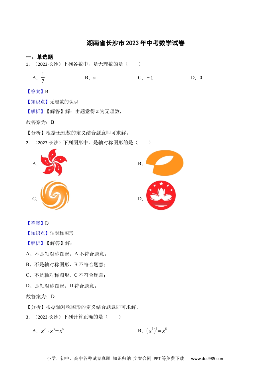 小学、初中、高中各种试卷真题知识归纳文案合同PPT等免费下载www.doc985.com湖南省长沙市2023年中考数学试卷一、单选题1.(2023·长沙)下列各数中,是无理数的是()A.17B.πC.−1D.0【答案】B【知识点】无理数的认识【解析】【解答】解:由题意得π为无理数,故答案为:B【分析】根据无理数的定义结合题意即可求解。2.(2023·长沙)下列图形中,是轴对称图形的是()A.B.C.D.【答案】D【知识点】轴对称图形【解析】【解答】解:A、不是轴对称图形,A不符合题意;B、不是轴对称图形,B不符合题意;C、不是轴对称图形,C不符合题意;D、是轴对称图形,D符合题意;故答案为:D【分析】根据轴对称图形的定义结合题意即可求解。3.(2023·长沙)下列计算正确的是()A.x2⋅x3=x5B.(x3)3=x6小学、初中、高中各种试卷真题知识归纳文案合同PPT等免费下载www.doc985.comC.x(x+1)=x2+1D.(2a−1)2=4a2−1【答案】A【知识点】同底数幂的乘法;单项式乘多项式;完全平方公式及运用;幂的乘方【解析】【解答】解:A、x2⋅x3=x5,A符合题意;B、(x3)3=x9,B不符合题意;C、x(x+1)=x2+x,C不符合题意;D、(2a−1)2=4a2−4a+1,D不符合题意;故答案为:A【分析】根据同底数幂的乘法、幂的乘方、单项式乘多项式、完全平方公式对选项逐一运算即可求解。4.(2023·长沙)下列长度的三条线段,能组成三角形的是()A.1,3,4B.2,2,7C.4,5,7D.3,3,6【答案】C【知识点】三角形三边关系【解析】【解答】解:A、1+3=4,故不能组成三角形,A不符合题意;B、2+2<7,故不能组成三角形,B不符合题意;C、4+5>7,故能组成三角形,C符合题意;D、3+3=6,故不能组成三角形,D不符合题意;故答案为:C【分析】根据三角形的三边关系结合题意对选项逐一分析即可求解。5.(2023·长沙)2022年,长沙市全年地区生产总值约为1400000000000元,比上年增长4.5%.其中数据1400000000000用科学记数法表示为()A.1.4×1012B.0.14×1013C.1.4×1013D.14×1011【答案】A【知识点】科学记数法—记绝对值大于1的数小学、初中、高中各种试卷真题知识归纳文案合同PPT等免费下载www.doc985.com【解析】【解答】解:由题意得数据1400000000000用科学记数法表示为1.4×1012,故答案为:A【分析】把一个数写成a×10的形式(其中1<|a|≤10,n为整数),这种记数的方法叫做科学记数法。6.(2023·长沙)如图,直线m∥直线n,点A在直线n上,点B在直线m上,连接AB,过点A作AC⊥AB,交直线m于点C.若∠1=40°,则∠2的度数为()A.30°B.40°C.50°D.60°【答案】C【知识点】平行线的性质【解析】【解答】解:如图所示:由题意得∠DAC=1+BAC=130°∠∠, mn∥,∴2+DAC=180°∠∠,∴2=50°∠,故答案为:C【分析】先根据垂直结合题意得到∠DAC,进而根据平行线的性质即可求解。7.(2023·长沙)长沙市某一周内每日最高气温的情况如图所示,下列说法中错误的是()小学、初中、高中各种试卷真题知识归纳文案合同PPT等免费下载www.doc985.comA.这周最高气温是32℃B.这组数据的中位数是30C.这组数据的众数是24D.周四与周五的最高气温相差8℃【答案】B【知识点】通过函数图象获取信息并解决问题;中位数;众数【解析】【解答】解:A、这周最高气温是32℃,A不符合题意;B、这组数据的中位数是27,B符合题意;C、这组数据的众数是24,C不符合题意;D、周四与周五的最高气温相差8℃,D不符合题意;故答案为:B【分析】根据图像结合中位线、众数定义对选项逐一分析即可求解。8.(2023·长沙)不等式组{2x+4>0x−1≤0)的解集在数轴上表示正确的是()A.B.C.D.【答案】A【知识点】在数轴上表示不等式组的解集;解一元一次不等式组【解析】【解答】解:由题意得{2x+4>0①x−1≤0②),解①得x>-2,解②得x≤1,∴不等式组的解集为-2<x≤1,∴在数轴上表示为,小学、初中、高中各种试卷真题知识归纳文案合同PPT等免费下载www.doc985.com故答案为:A【分析】先分别解不等式①和②,进而得到不等式组的解集,再表示在数轴上即可求解。9.(2023·长沙)下列一次函数中,y随x的增大而减小的函数是()...