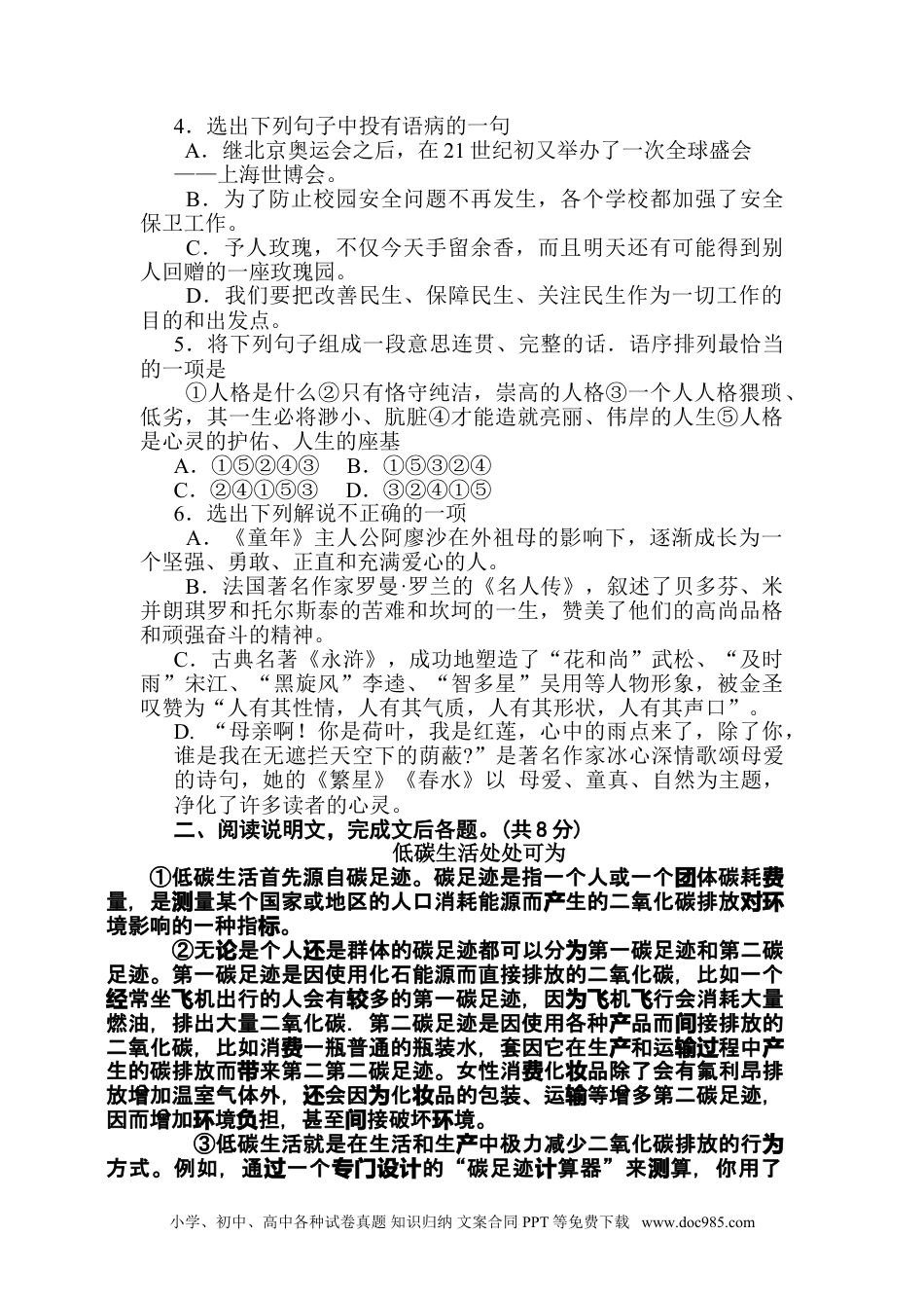 2010年沙市初中学水平考卷长毕业业试试语文注意事项:1、答前,考生先将自己的姓名、准考号填写清楚,并真核题请证认条形上的姓名、准考号、考室和座位号;对码证2、必在答卡上答,在草稿、卷上答无效;须题题纸试题题3.答,考生注意各大号后面的答提示;题时请题题题4、勿折叠答卡,保持字体工整、笔迹清晰、卡面清;请题洁5、答卡上不得使用涂改液、潦改胶和;题贴纸6.本学科考量试时120分,分钟满120分。一、基础知识积累及其运用(12分)1.下列词语中加点字的注音完全正确的一项是A.妖娆(ráo)愧怍(zà)中流砥柱(dǐ)B.惬意(xiá)萌庇(yìn)相形见绌(chū)C.点缀(zhuì)潮汛(xùn)孜孜不倦(zī)D.静谧(bì)追溯(shuò)问心无愧(kuì)2.下列词语中没有错别字的一项是A.慷概细腻美不胜收炯乎不同B.嘹亮孕育尽态极妍各得其所C.拮局斑澜一泄千里锐不可当D.祈祷推祟物竟天择随机应变3.结合语境,选出下列句子中加点词语解释有误的一项A.我们希望看到一个落英缤纷、屋舍俨然、民风淳朴的都市桃花源。(俨然:形容庄严。)B.“我们所做的一切都是要让人民生活得更加幸福、更有尊严,让社会更加公正、更加和谐”。温总理的话语像和煦的春风温暖了人们的心。(和煦:温暖。)C.知识是形成新创意的素材。但这并不是说,光凭知识就能拥有创造性。(创意:创造性的见解或意见。)D.教育要得到长足的发展,一方面需要各级领导的重视,全社会的支持;另一方面也需要教育部门加强内部改革,增强造血功能。(造血:比喻部门、组织、单位等从内部挖掘潜力,增强自身的实力。)小学、初中、高中各种试卷真题知识归纳文案合同PPT等免费下载www.doc985.com4.选出下列句子中投有语病的一句A.继北京奥运会之后,在21世纪初又举办了一次全球盛会——上海世博会。B.为了防止校园安全问题不再发生,各个学校都加强了安全保卫工作。C.予人玫瑰,不仅今天手留余香,而且明天还有可能得到别人回赠的一座玫瑰园。D.我们要把改善民生、保障民生、关注民生作为一切工作的目的和出发点。5.将下列句子组成一段意思连贯、完整的话.语序排列最恰当的一项是①人格是什么②只有恪守纯洁,崇高的人格③一个人人格猥琐、低劣,其一生必将渺小、肮脏④才能造就亮丽、伟岸的人生⑤人格是心灵的护佑、人生的座基A.①⑤②④③B.①⑤③②④C.②④①⑤③D.③②④①⑤6.选出下列解说不正确的一项A.《童年》主人公阿廖沙在外祖母的影响下,逐渐成长为一个坚强、勇敢、正直和充满爱心的人。B.法国著名作家罗曼·罗兰的《名人传》,叙述了贝多芬、米并朗琪罗和托尔斯泰的苦难和坎坷的一生,赞美了他们的高尚品格和顽强奋斗的精神。C.古典名著《永浒》,成功地塑造了“花和尚”武松、“及时雨”宋江、“黑旋风”李逵、“智多星”吴用等人物形象,被金圣叹赞为“人有其性情,人有其气质,人有其形状,人有其声口”。D.“母亲啊!你是荷叶,我是红莲,心中的雨点来了,除了你,谁是我在无遮拦天空下的荫蔽?”是著名作家冰心深情歌颂母爱的诗句,她的《繁星》《春水》以母爱、童真、自然为主题,净化了许多读者的心灵。二、阅读说明文,完成文后各题。(共8分)低碳生活处处可为①低碳生活首先源自碳足迹。碳足迹是指一个人或一个体碳耗团费量,是量某个国家或地区的人口消耗能源而生的二氧化碳排放测产对环境影响的一种指。标②无是个人是群体的碳足迹都可以分第一碳足迹和第二碳论还为足迹。第一碳足迹是因使用化石能源而直接排放的二氧化碳,比如一个常坐机出行的人会有多的第一碳足迹,因机行会消耗大量经飞较为飞飞燃油,排出大量二氧化碳.第二碳足迹是因使用各种品而接排放的产间二氧化碳,比如消一瓶普通的瓶装水,套因它在生和运程中费产输过产生的碳排放而来第二第二碳足迹。女性消化品除了会有氟利昂排带费妆放增加温室气体外,会因化品的包装、运等增多第二碳足迹,还为妆输因而增加境担,甚至接破坏境。环负间环③低碳生活就是在生活和生中极力减少二氧化碳排放的行产为方式。例如,通一个的“碳足迹算器”来算,你用了过专门设计计测小学、初中、高中各种试卷真题知识归纳文案合同PPT等免费下载w...